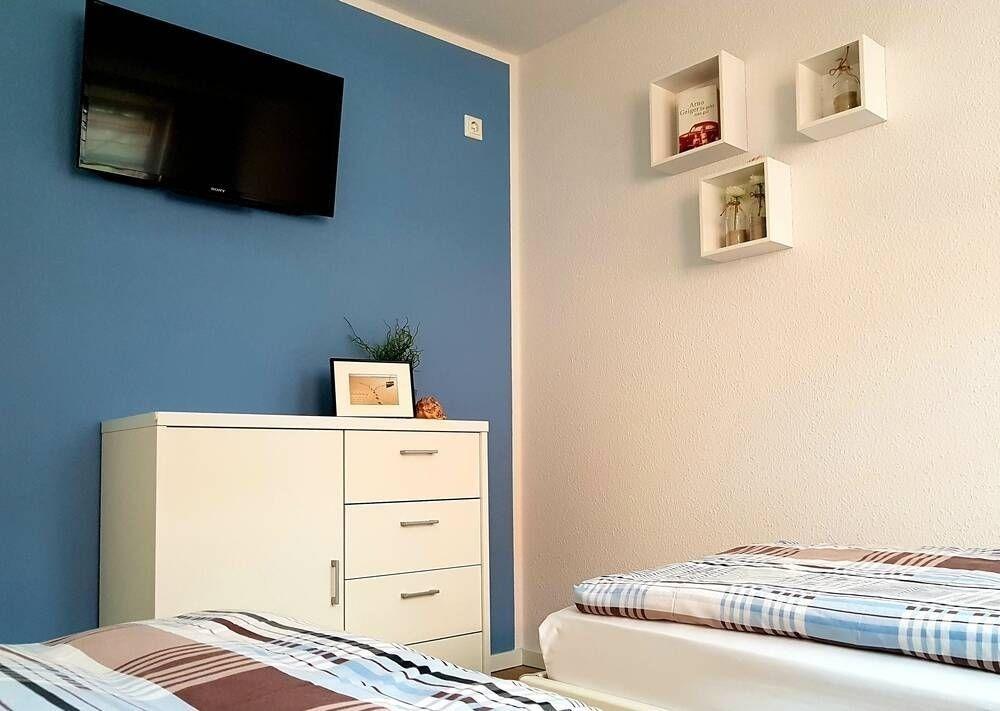 Das eine Schlafzimmer verfügt über ein 1,80 m x 2,00 m großes Doppelbett mit Qualitätsmatratzen. Zwei Nachtische, ein Kleiderschrank und eine Kommode bieten Ihnen ausreichend Stauraum. Im zweiten Schlafzimmer hingegen befinden sich zwei gemütliche Einzelbetten. Beide Schlafzimmer verfügen über einen modernen Flachbild-Fernseher.