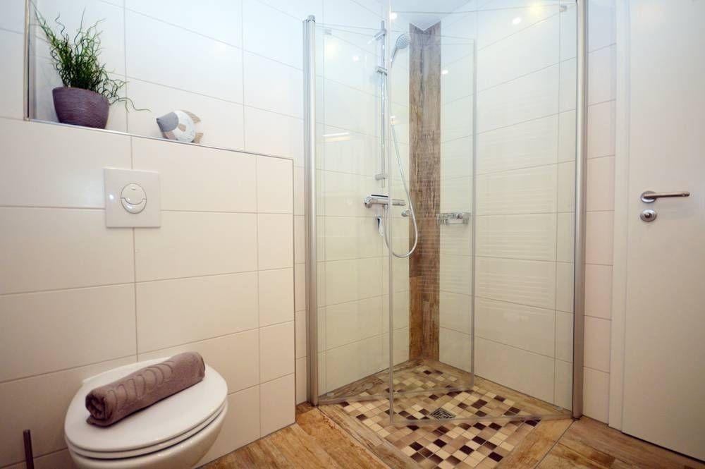 Das harmonisch gestaltete Badezimmer hat eine 1,00 m x 1,00 m große ebenerdige Dusche. Handtuchtrockner, Waschtisch mit Spiegel- und Unterschrank. Kosmetikspiegel und Föhn sind ebenfalls vorhanden.