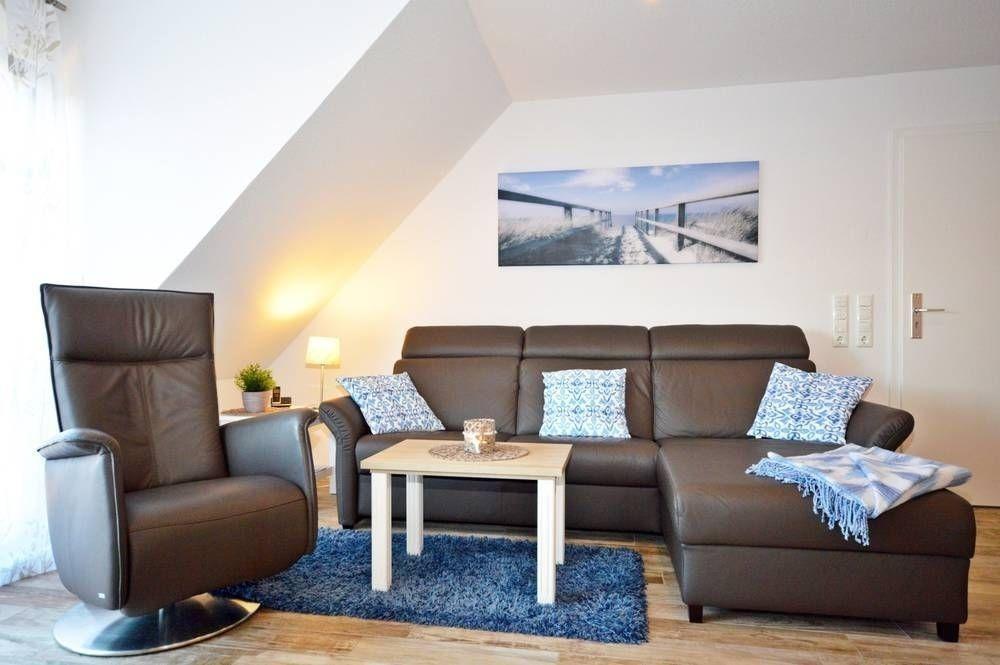 Der behagliche Wohnbereich mit moderner Ledereckcouch, Couchtisch und herrlich bequemen Komfort-Sessel an. Selbstverständlich verfügt die Ferienwohnung über einen großen 3D-Flachbild-TV, Blue-Ray Player und Mini Stereo Anlage.