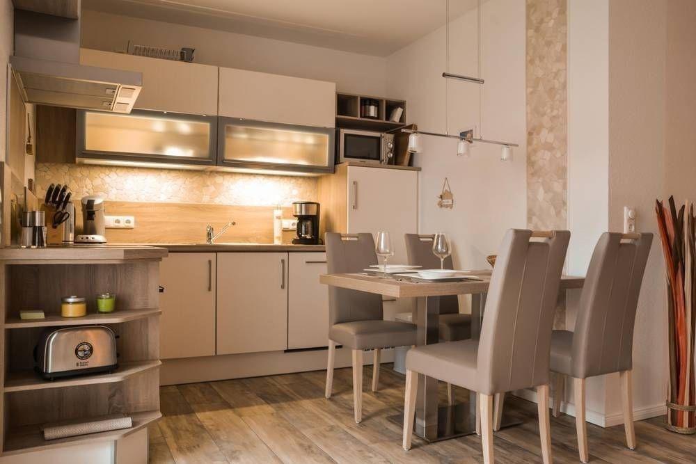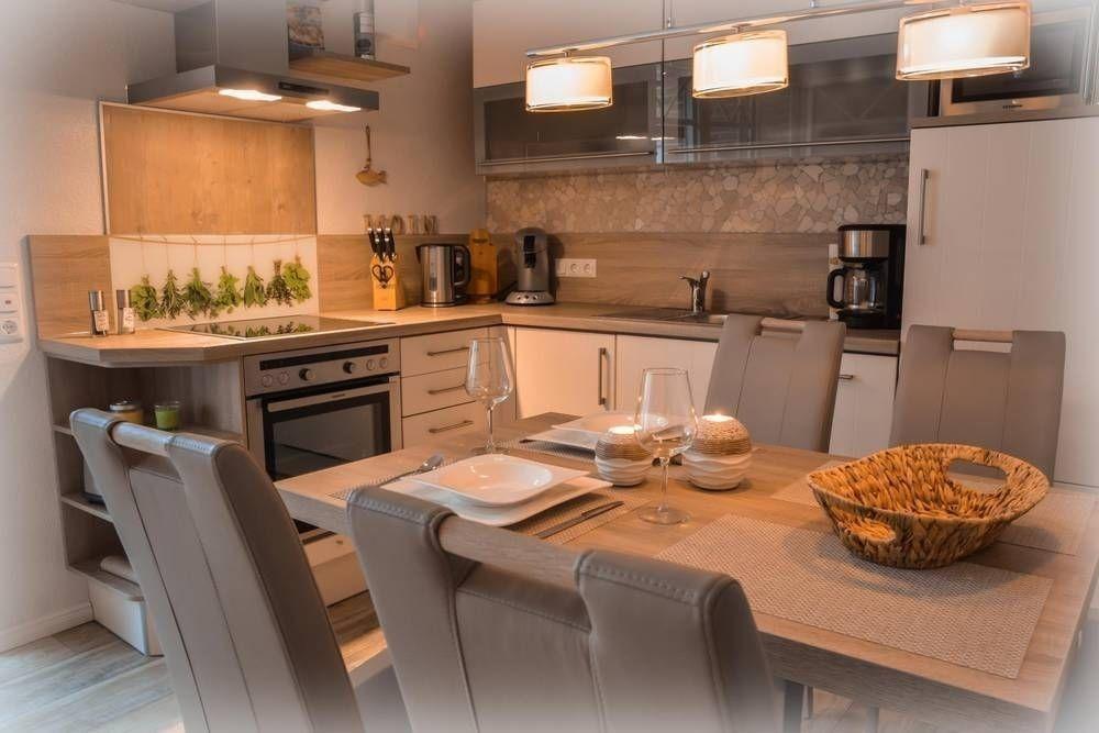 Die Einbauküche lässt in Ausstattung und Großzügigkeit keine Wünsche offen. Herd mit Ceranfeld, Backofen, Edelstahl-Abzugshaube, Kühlschrank mit Gefrierfach, Mikrowelle, Wasserkocher, Eierkocher, Kaffeemaschine und Senseo, Toaster, Standmixer, Pürierstab etc... auch das umfangreiche Zubehör wie Geschirr, Töpfe und Besteck lässt keine Wünsche offen. Eine Grundausstattung an Gewürzen, Spülmaschinen-Tabs, etc. ist vorhanden.