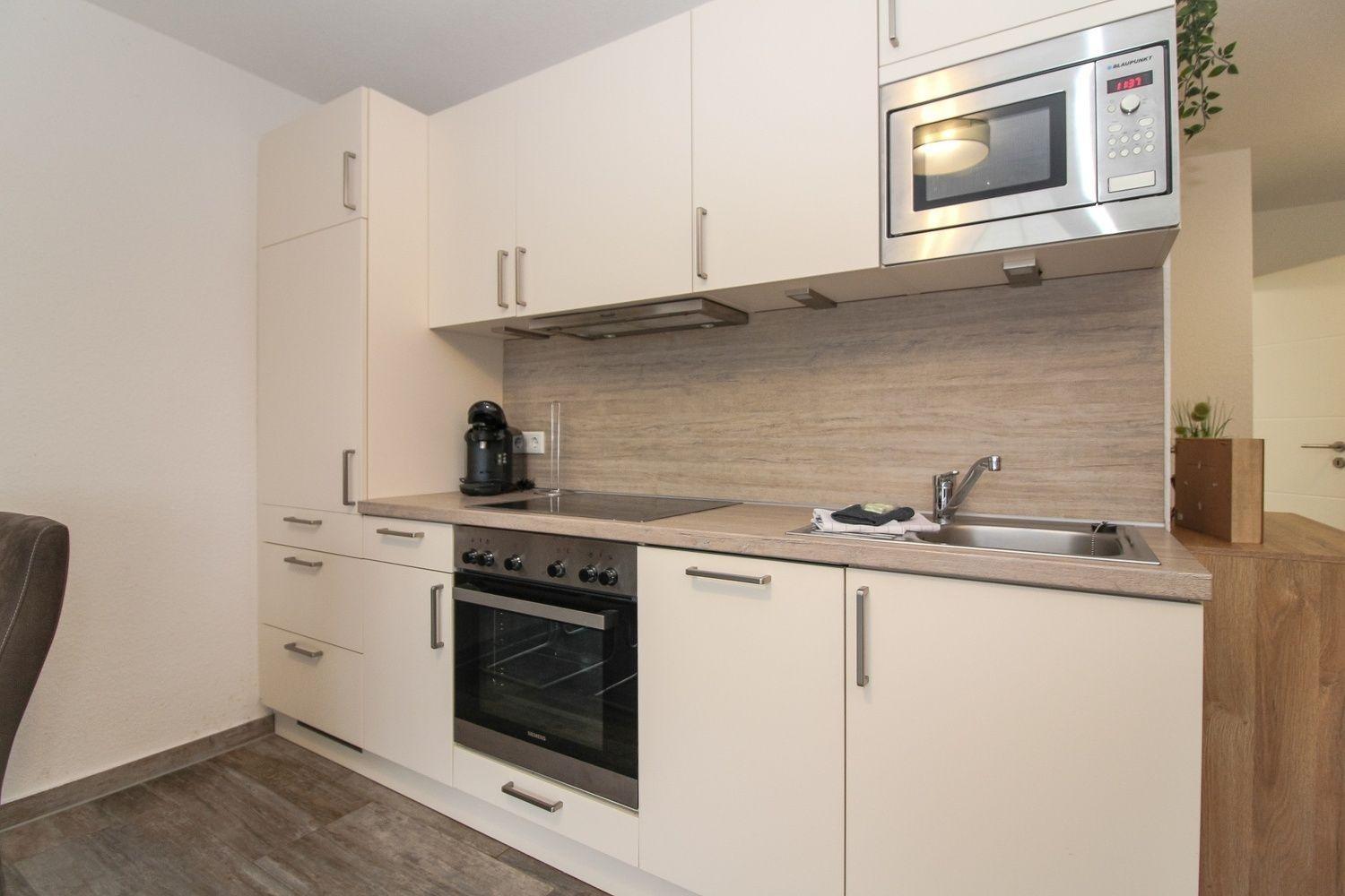 Auf den ca. 65m² empfängt Sie die offene Wohnküche mit Küchenzeile, Essplatz und den Wohnbereich mit Couch und Sesseln.