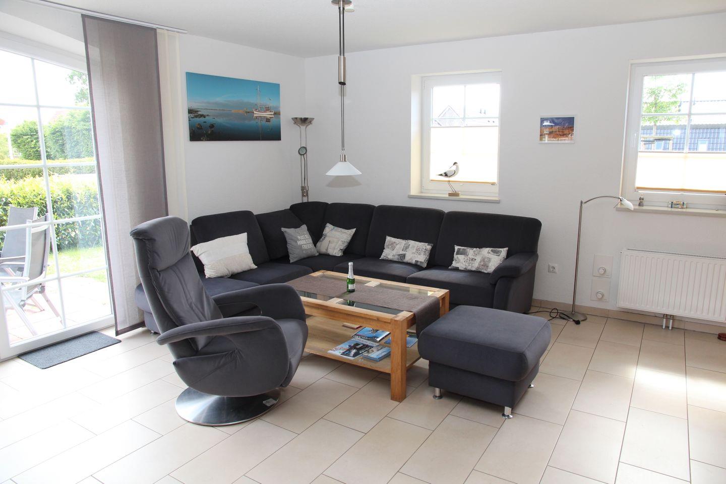 Ein Schlafzimmer (Doppelbett 2*0,80m) und ein großes Badezimmer befinden sich im EG. Zwei weitere Schlafzimmer (1x Doppelbett 2*0,90m und 2 Einzelbetten je 0,90m) und ein Dusch-Bad sind im OG untergebracht. Eines der Schlafzimmer im Obergeschoss ist mit einem Schreibtisch ausgestattet, sodass auch das Arbeiten möglich ist. Außer im Schlafzimmer sorgt eine Fußbodenerwärmung für angenehme Wärme im Erdgeschoss und im Bad im Obergeschoss. Das Haus verfügt über 2 x LCD-TV (Anschlüsse in allen Schlafräumen vorhanden), einen Blu-ray-Player und eine Musikanlage mit CD (iPad, iPhone und iPod kompatibel).