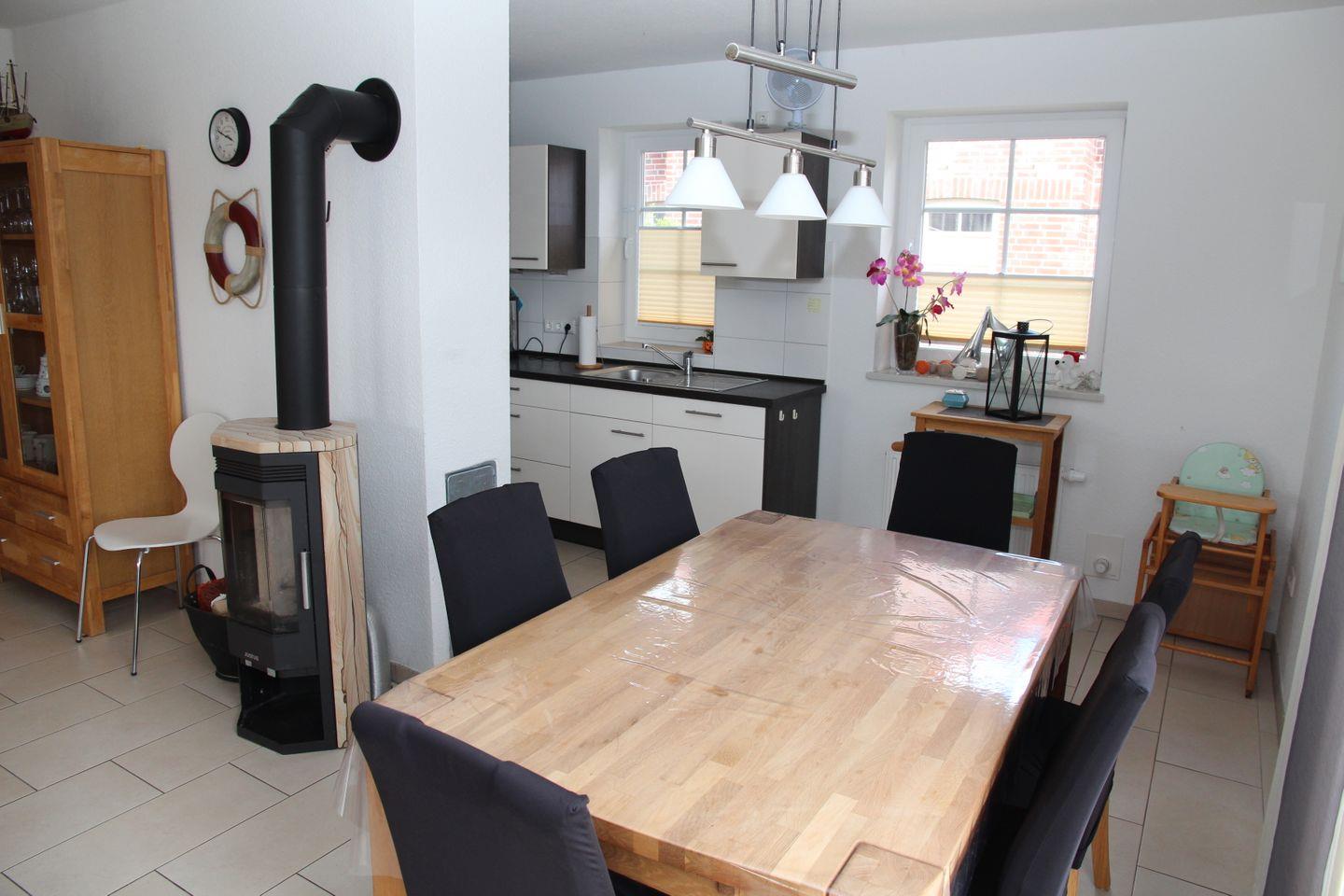 Ein Kamin sorgt für wohlige Wärme im offenen Wohn- Essbereich, das an der Ausstattung keine Wünsche offen lässt - Mikrowelle, Backofen, Geschirrspülmaschine, Kühl- Gefrierkombination, Kaffeemaschine, Wasserkocher, Eierkocher, Toaster, Waschmaschine, Trockner u.v.m.