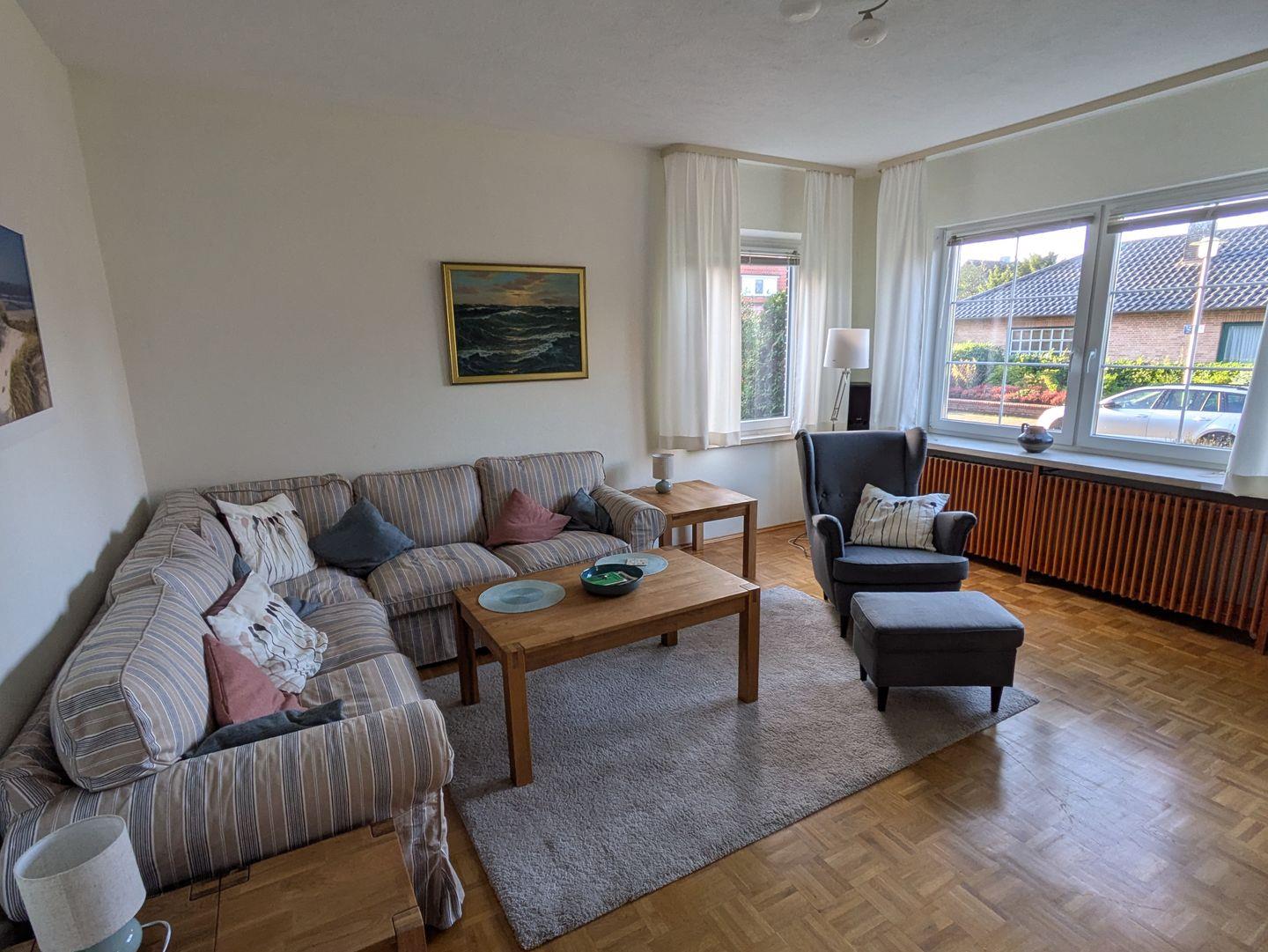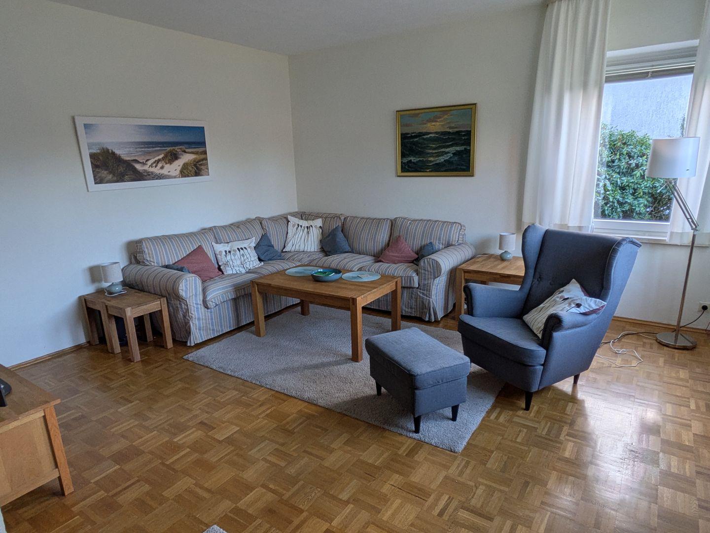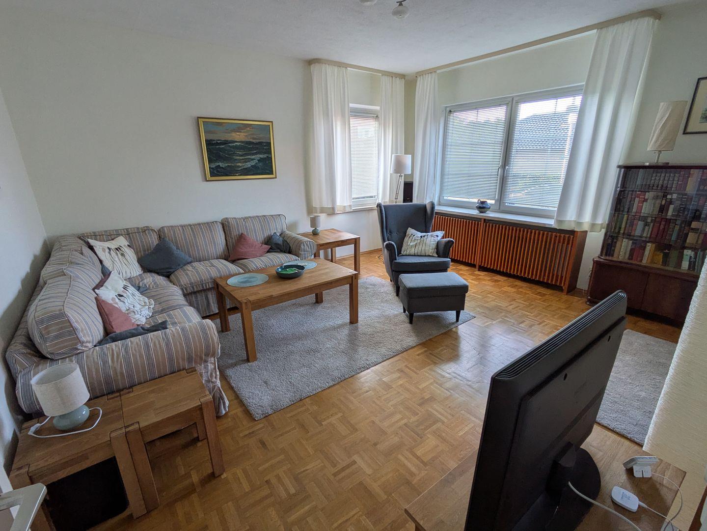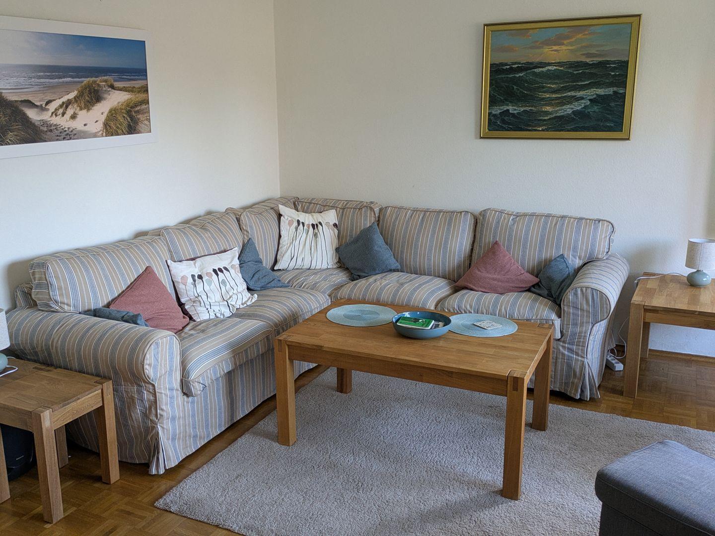 Der einladende Wohnbereich mit großzügiger Sofalandschaft ist der perfekte Ort, um nach einem ereignisreichen Tag an der Nordseeküste zu entspannen. Ein Flachbild-TV sorgt für gemütliche Filmabende und bietet Unterhaltung für die gesamte Familie.