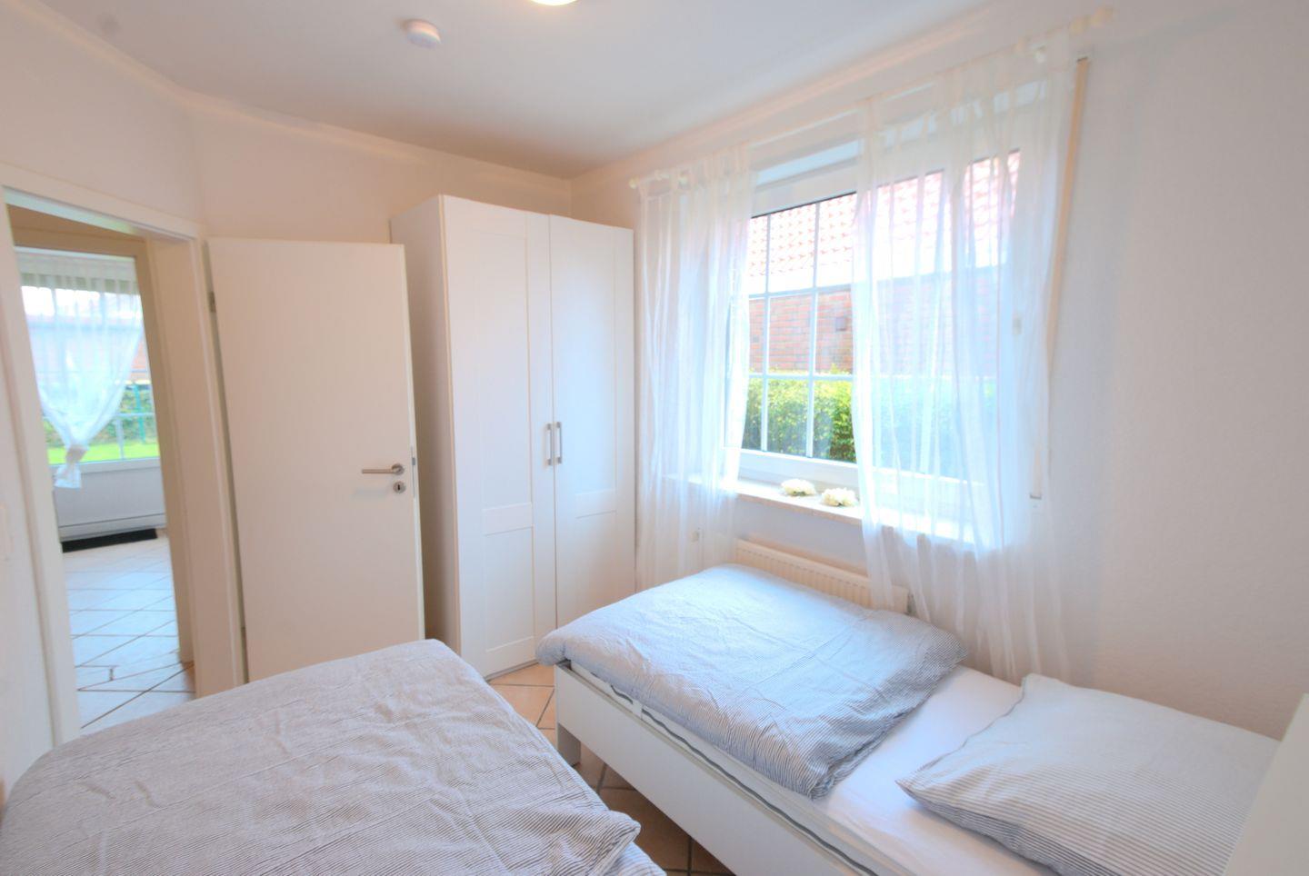 Die Wohnung Möwe 3 befindet sich im Erdgeschoss eines ruhig gelegenen Wohnhauses. Die Wohnung ist freundlich hell eingerichtet und verfügt über zwei Schlafzimmer. In einem ein Doppelbett und Kleiderschrank. Im anderen zwei Einzelbetten und Kleiderschrank.