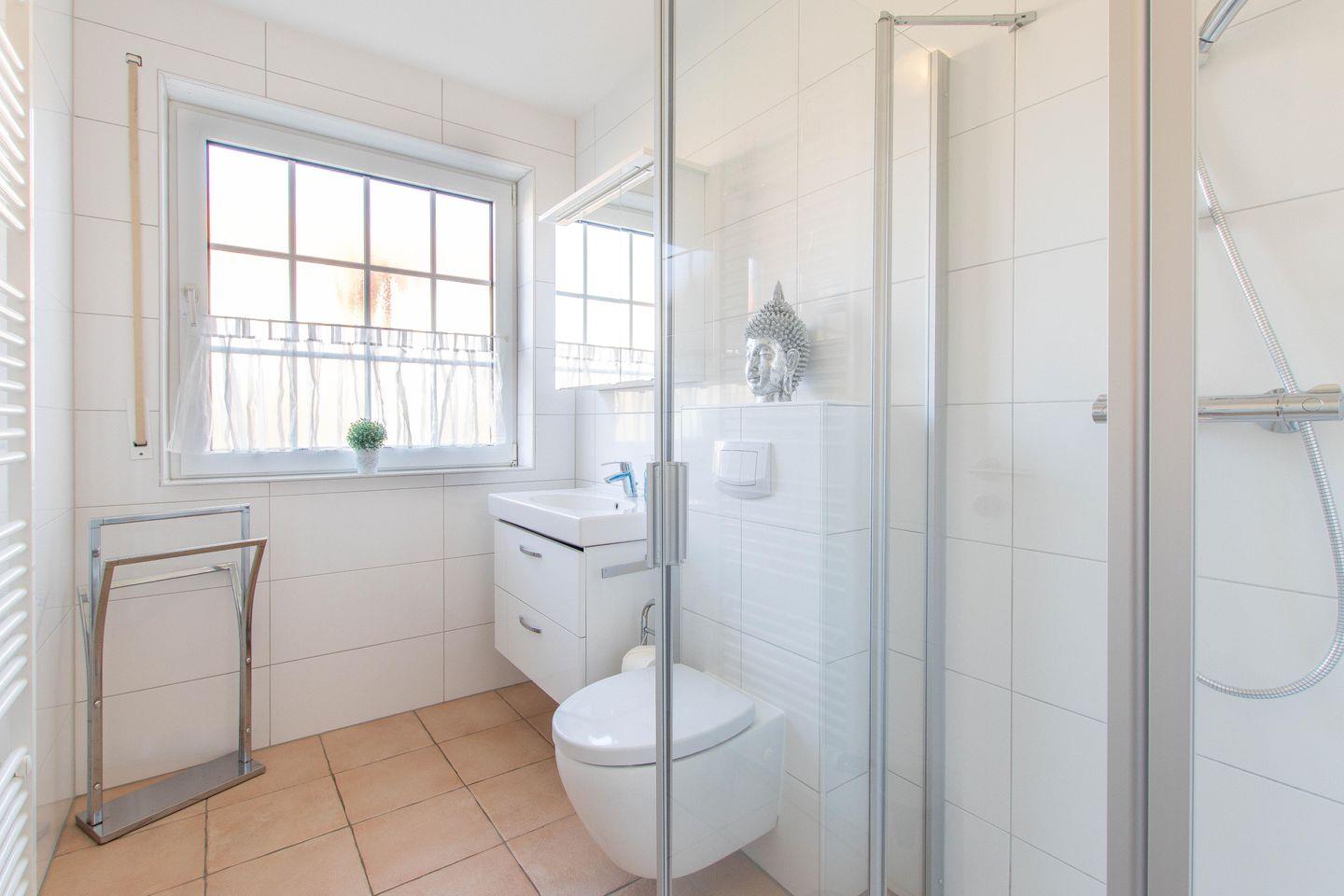 Im Badezimmer ist eine Dusche mit flachem Einstieg. Das Wohnzimmer ist mit einer Ledercouch und einem Sessel, sowie TV ausgestattet.