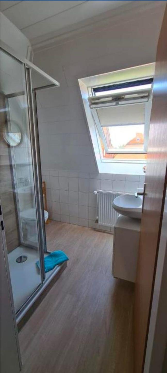 Das Badezimmer verfügt über Tageslicht (Fenster) und ist mit WC, Waschbecken, Spiegel, Haartrockner sowie einer Dusche mit Wanne ausgestattet; warmes Wasser ist selbstverständlich vorhanden. Für längere Aufenthalte stehen eine Waschmaschine und ein Trockner zur gemeinschaftlichen Nutzung bereit, außerdem Bügeleisen und Bügelbrett.