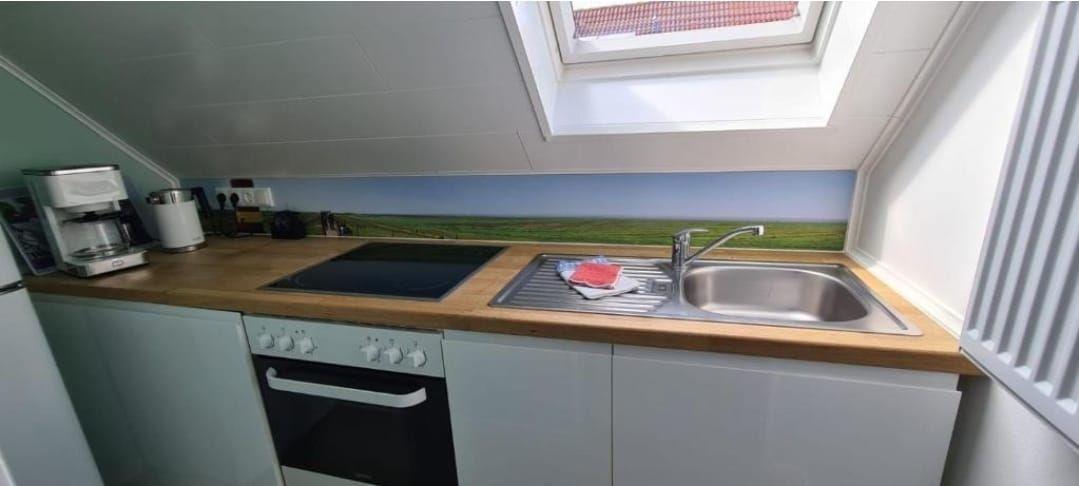 Die geschlossene Küche ist vollständig ausgestattet und bietet gute Voraussetzungen für die Selbstversorgung: Ceran-Herd, Backofen, Mikrowelle, Kühlschrank sowie ein extra Gefrierschrank gehören ebenso dazu wie Kaffeemaschine, Wasserkocher, Toaster, Eierkocher und Mixer. Küchenutensilien, Geschirr und Besteck sowie Geschirrhandtücher sind vorhanden. Ein Essbereich mit Esstisch rundet das Wohnkonzept ab; die Bodenbeläge in Wohn- und Schlafzimmern sind aus Vinyl.