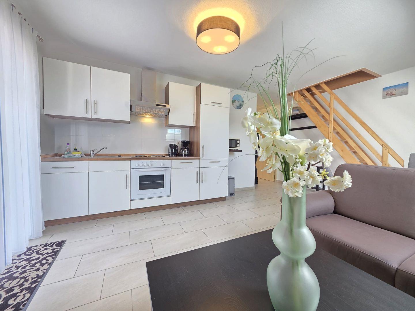 Geräumiges Wohnzimmer mit integrierter Einbauküche – ausgestattet mit Backofen, E-Herd, Kühlschrank, Besteck und Geschirr – perfekt für Frühstück oder Selbstverpflegung.