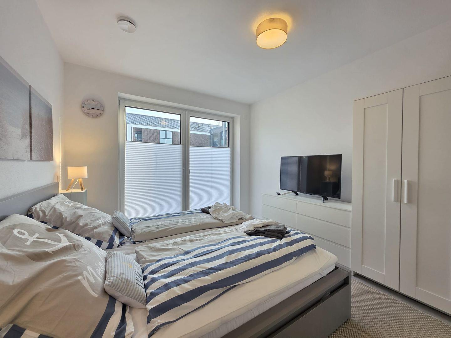 Das Schlafzimmer ist mit einem komfortablen Bett (180 x 200 cm) ausgestattet und verfügt zusätzlich über einen Flachbild-TV. Von hier aus haben Sie direkten Zugang zur Terrasse und einen schönen Ausblick ins Freie.