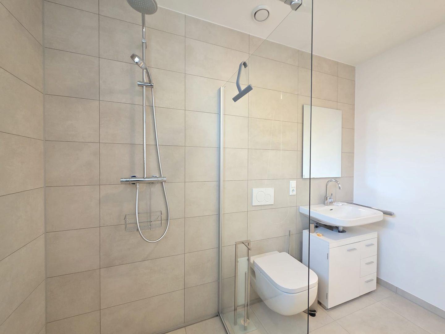 Das großzügige Badezimmer bietet viel Komfort und Platz. Es verfügt über eine moderne, begehbare Dusche, ausreichend Ablageflächen sowie ein Fenster, das für Tageslicht und angenehme Belüftung sorgt.