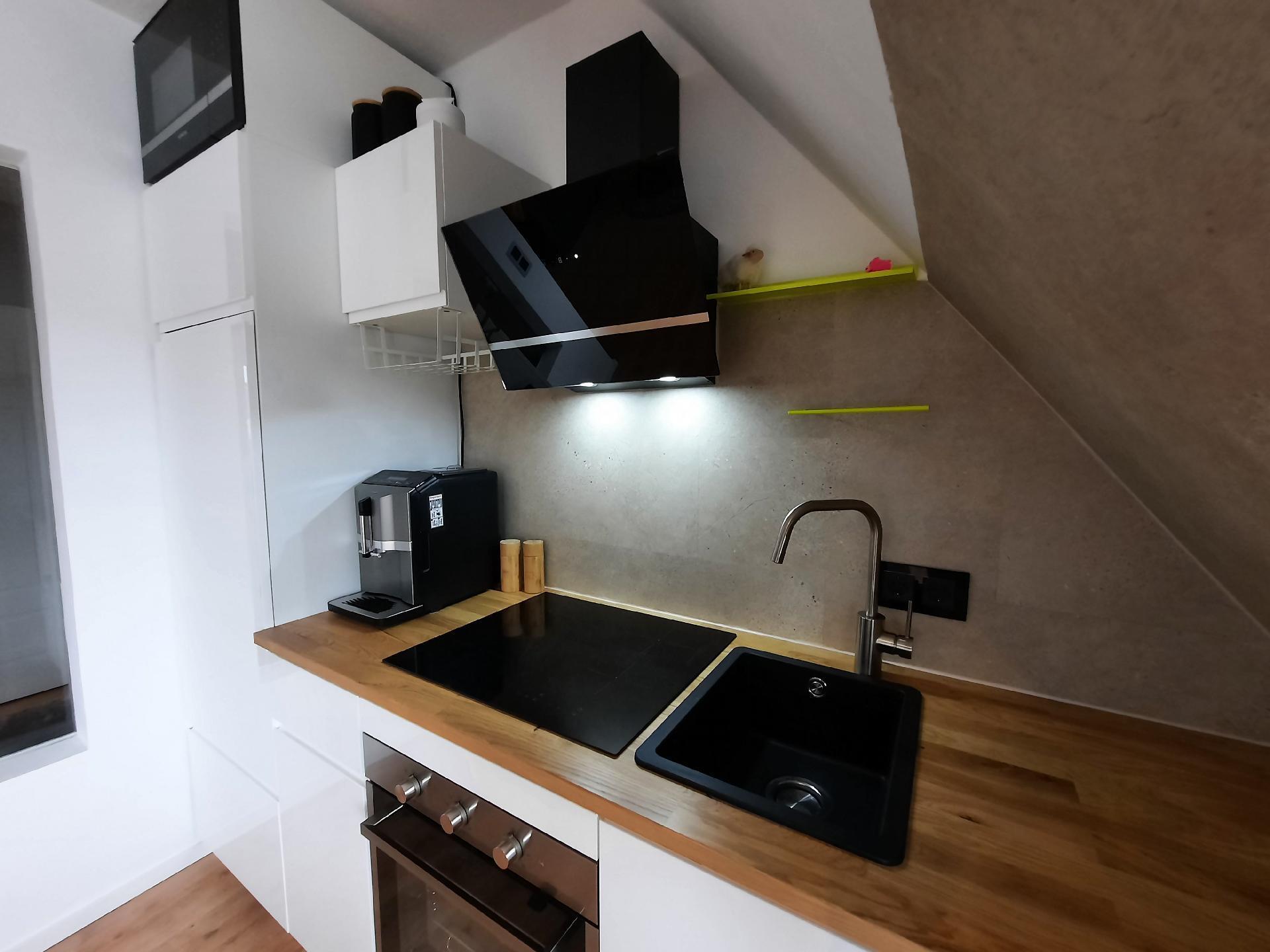 The living room with integrated kitchenette offers another sleeping possibility for two people on the pull-out sofa bed (lying area 1.40x2.00m).