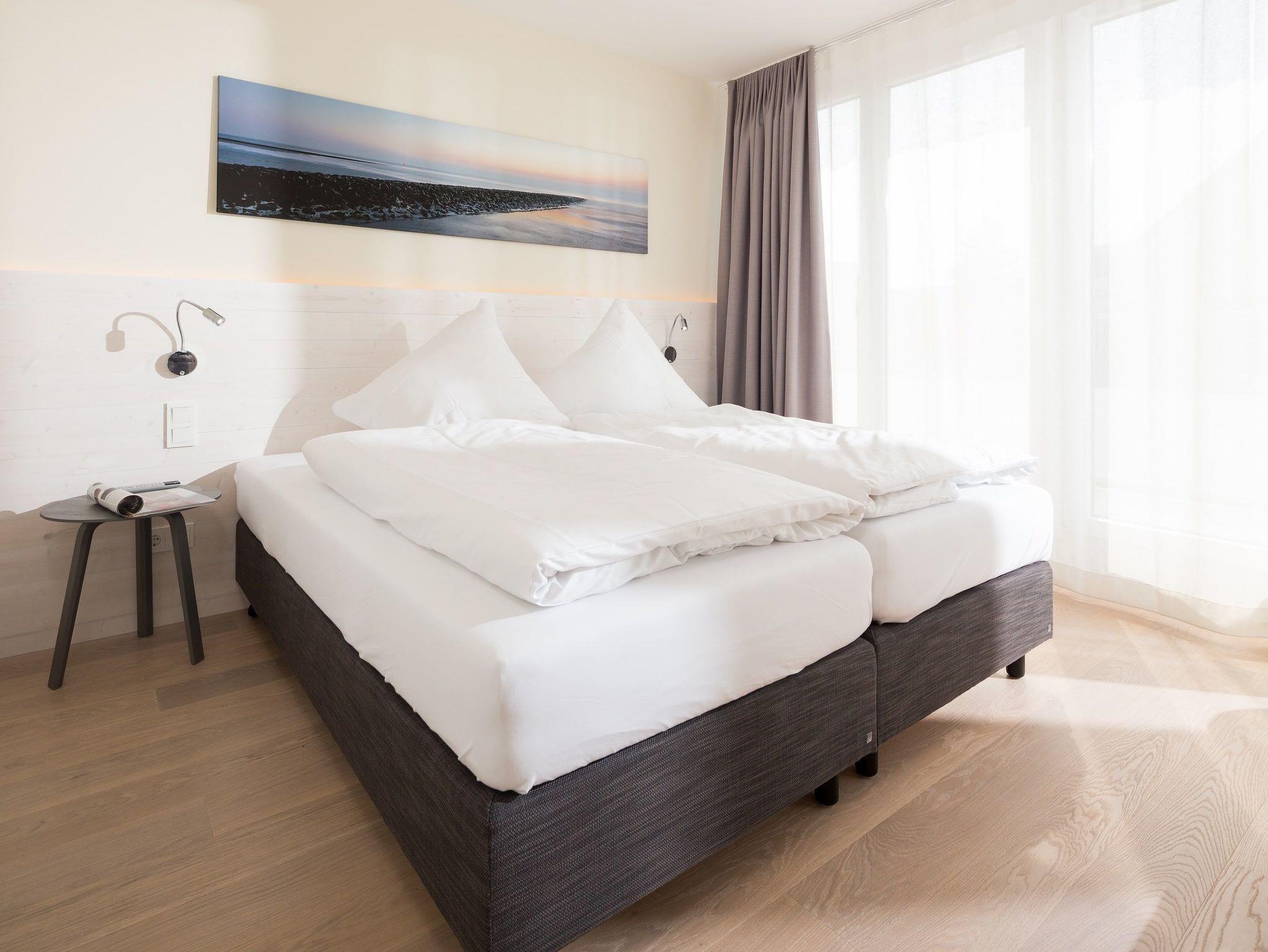 Zwei separate Schlafzimmer mit hochwertigen Boxspringbetten garantieren besten Schlafkomfort. Ein elegantes Badezimmer mit ebenerdiger Dusche sowie ein zusätzliches Gäste-WC machen das Wohnkonzept perfekt ideal auch für den Urlaub mit Freunden oder Familie.