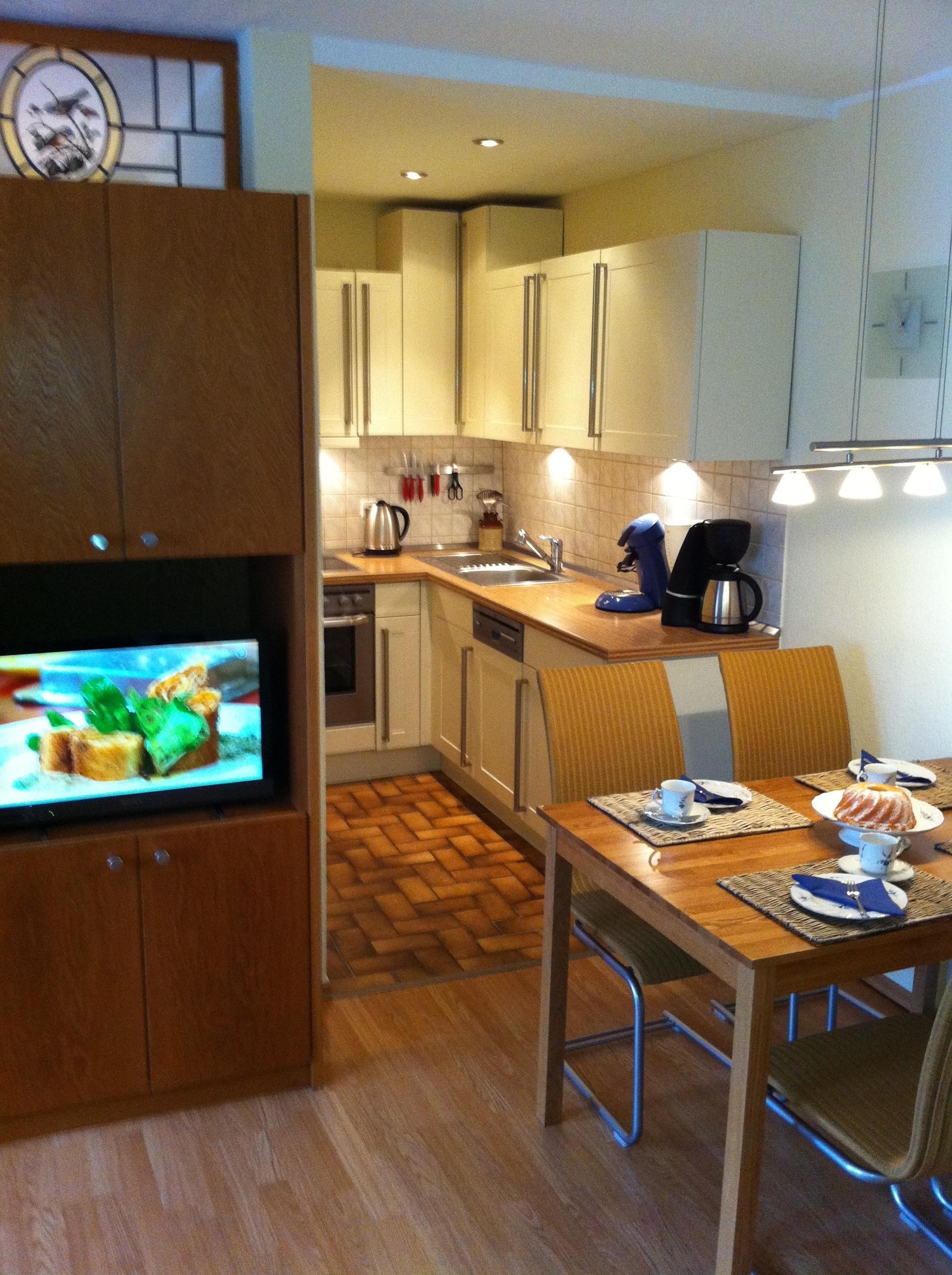 Die Ferienwohnung ist komplett eingerichtet (Farbfernsehgerät, Radio, Küchenzeile mit Ceran-Kochfeld, Geschirrspülmaschine und Backofen). Eine Waschmaschine und ein Trockner stehen im Gemeinschaftskeller gegen Gebühr zur Verfügung.