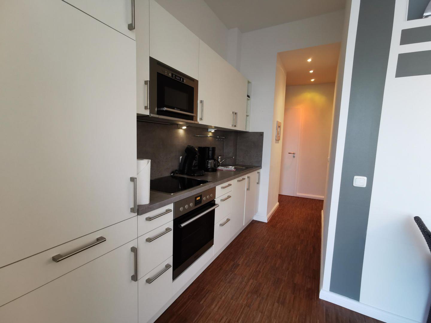 das Appartement verfügt über ein geräumiges Schlafzimmer mit Doppelbett (zusätzlichem TV) und ein weiteres Schlafzimmer mit 2 Einzelbetten. Vom Wohnraum unter dem schrägen Glasdach haben Sie Zugang zum Südost-Balkon mit Blick entlang der Luciusstraße. Der Essbereich befindet sich vor der voll ausgestatteten Küchenzeile. Badezimmer mit Dusche/WC. Fahrstuhl vorhanden.