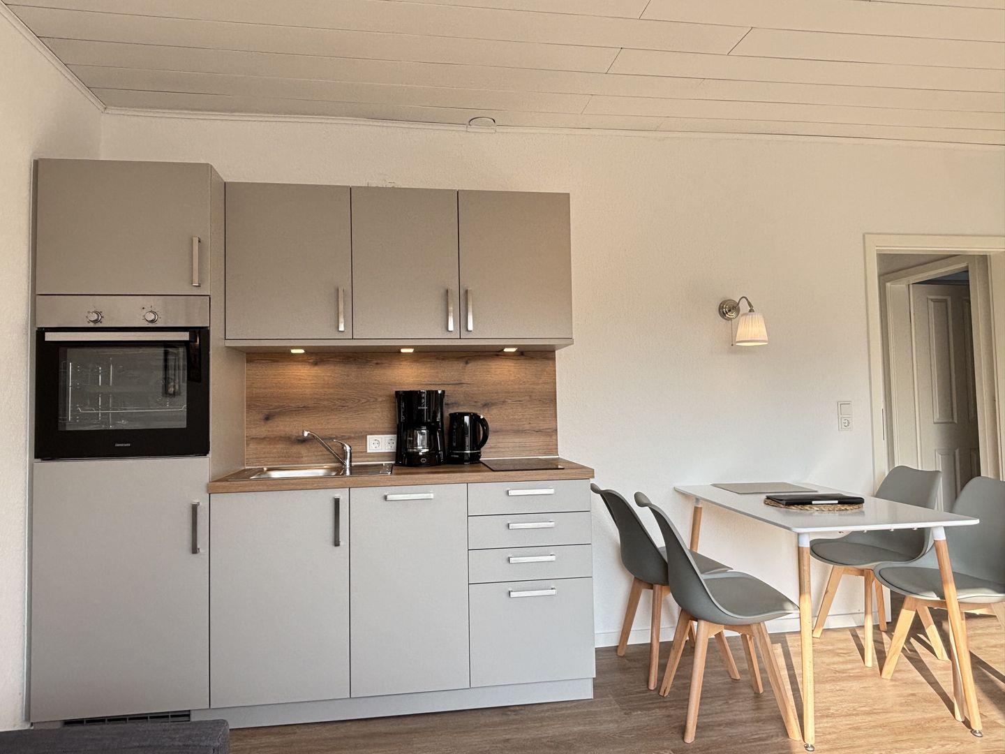 Die Wohnung wurde 2025 vollumfänglich renoviert und neu eingerichtet. Im Wohn/Schlafraum steht Ihnen eine neue, vollausgestattete Küchenzeile mit allen erforderlichen Elektrogeräten, ein Esstisch für bis zu vier Personen sowie ein gemütliche Sofa zur Verfügung. Flachbildfernseher finden Sie im Wohn/Schlafraum und im Schlafzimmer, WLAN wird kostenlos bereitgestellt.