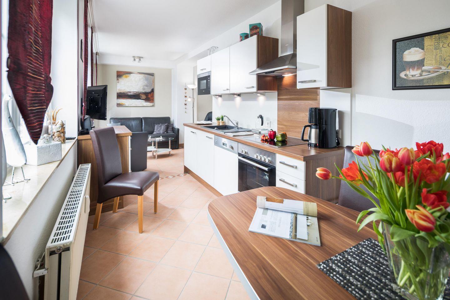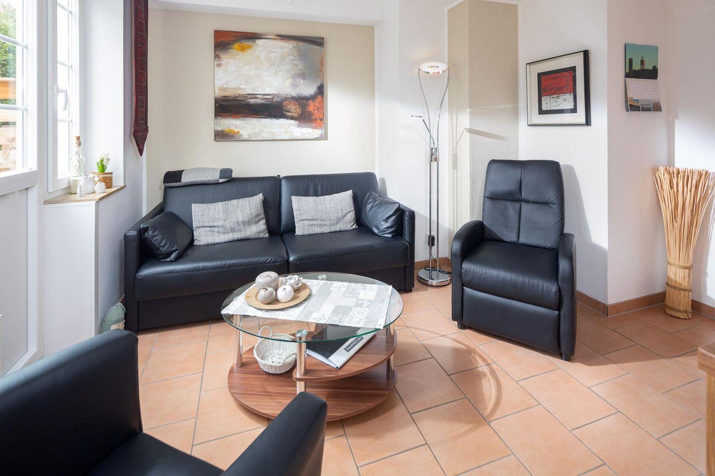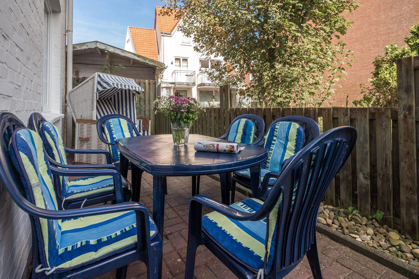 Zur Wohnung gehört eine eigene Terrasse. Diese wurde mit einem Tisch, Stühlen und einem Strandkorb ausgestattet. Zudem bietet die Ferienwohnung einen Zugang zur Südwest-Terrasse (ca. 40 qm), welche zur gemeinschaftlichen Nutzung zur Verfügung steht. Diese Terrasse ist mit Sitzmöbeln und Liegen ausgestattet. Das Grillen ist auf beiden Terrassen nicht erlaubt. Ein weiteres Highlight des Hauses ist die Möglichkeit, die Sauna und das Dampfbad zu nutzen. Die Nutzung dieser Einrichtungen muss durch den Hausmeister freigeschaltet werden und ist mit Kosten verbunden. Auch Vierbeiner sind hier herzlich willkommen. Es ist maximal 1 Hund (Höhe: maximal kniehoch) erlaubt.