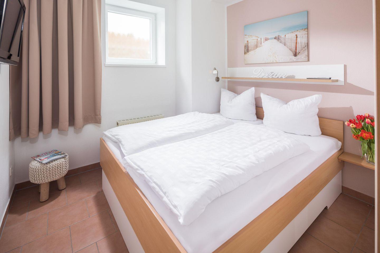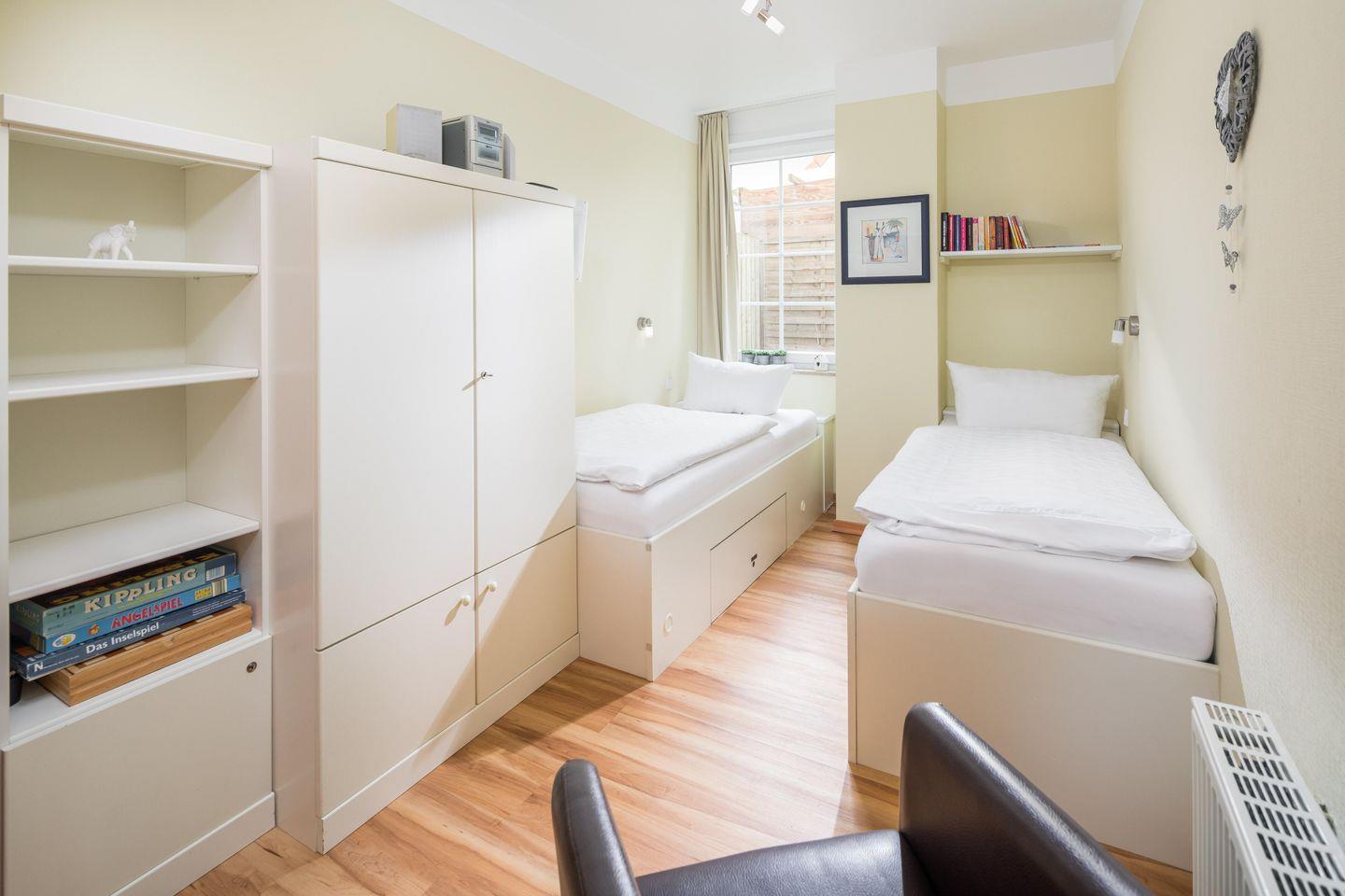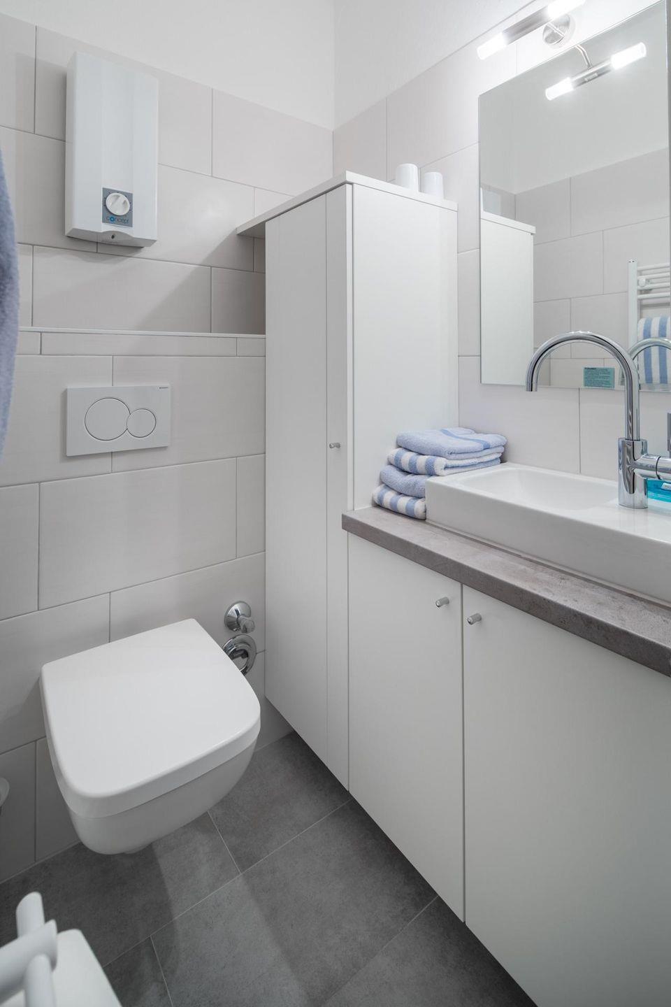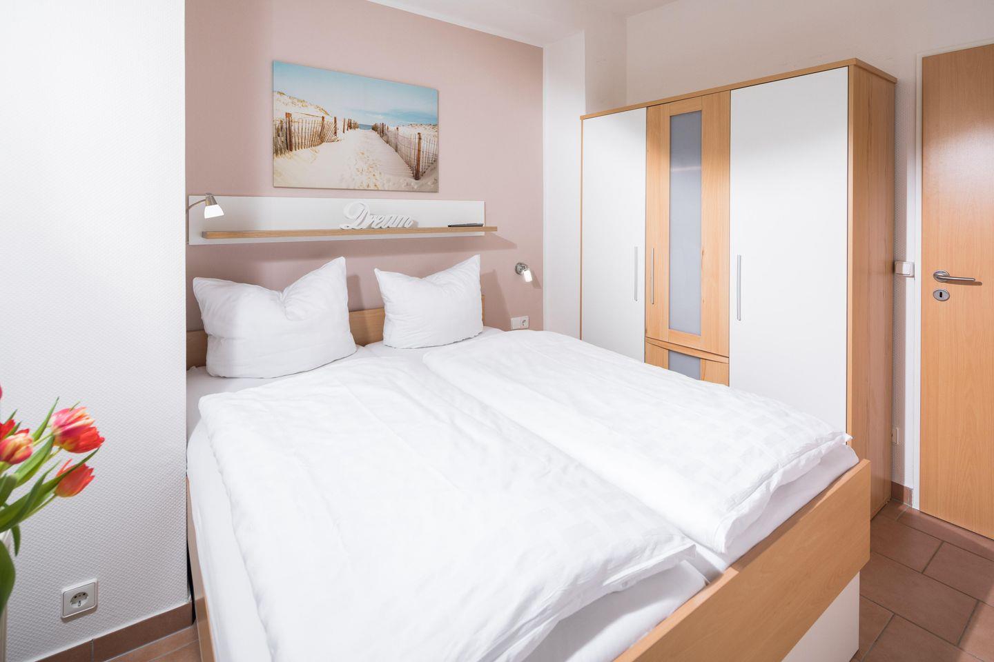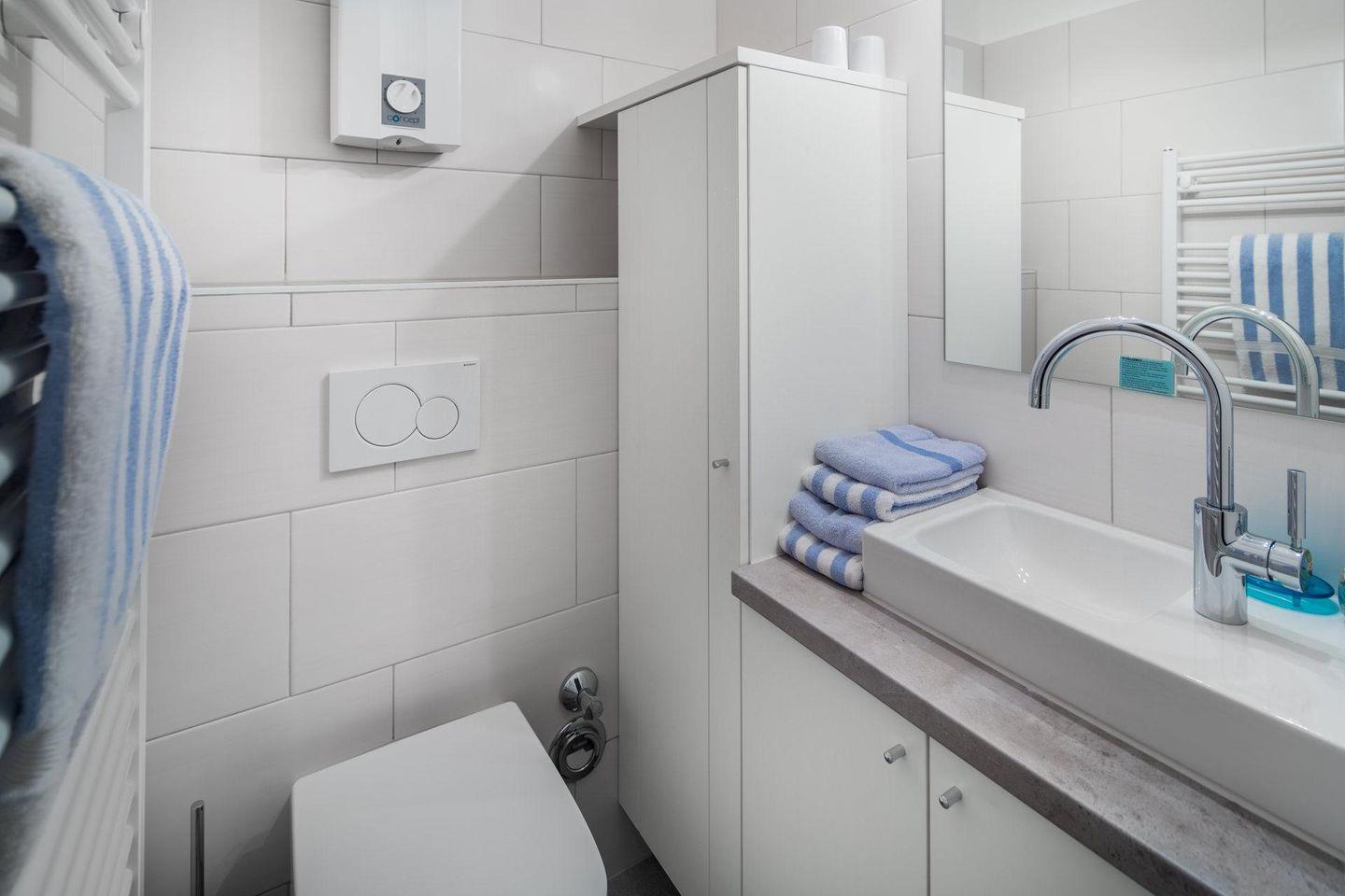 Die Wohnung verfügt über zwei Schlafzimmer. Ein Schlafzimmer wurde mit einem Doppelbett sowie einem geräumigen Kleiderschrank ausgestattet. Das zweite Schlafzimmer ist mit zwei Einzelbetten ausgestattet und bietet zusätzlich ein eigenes WC mit Handwaschbecken, was gerade für größere Gruppen oder Familien von Vorteil ist.