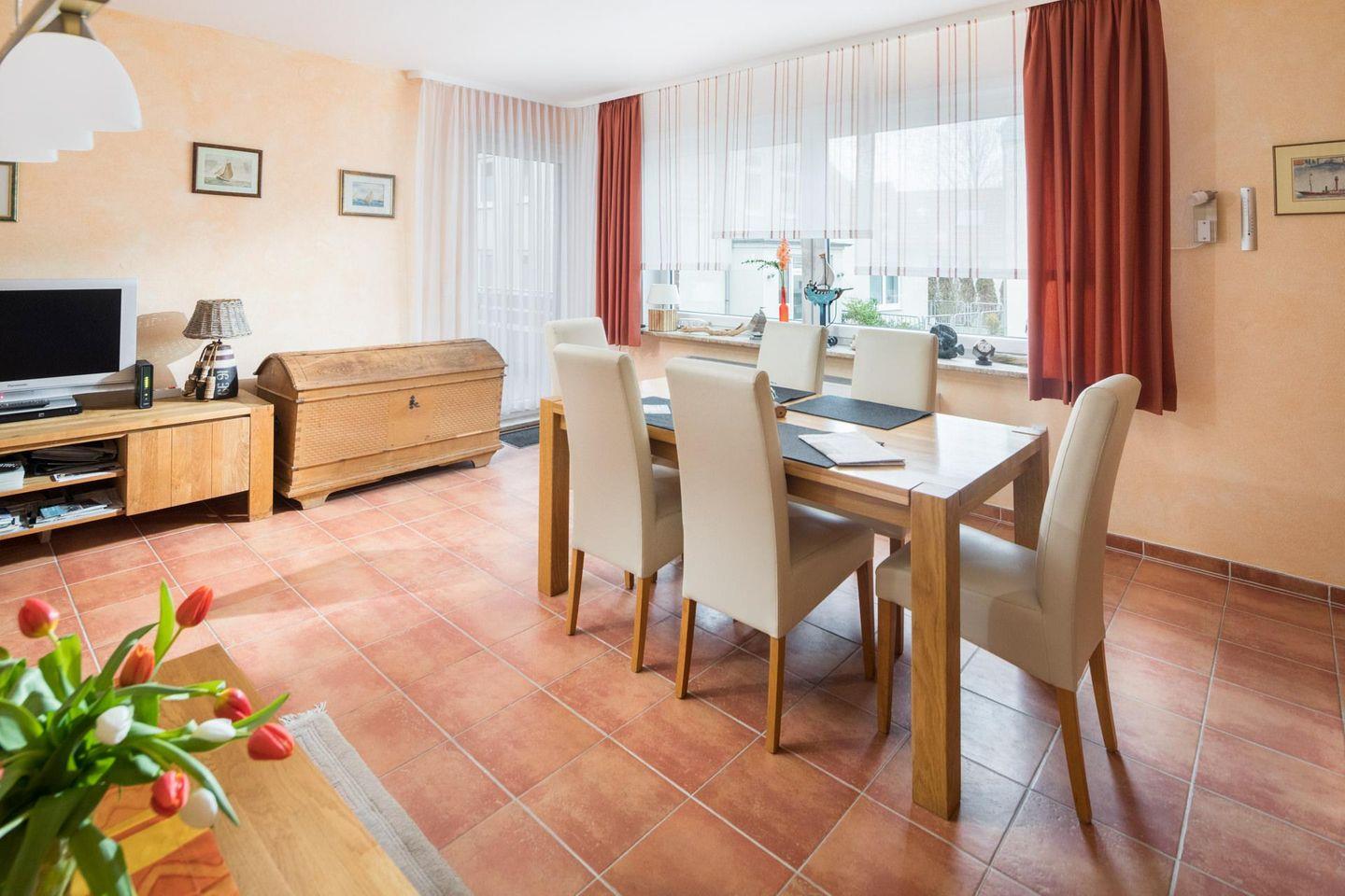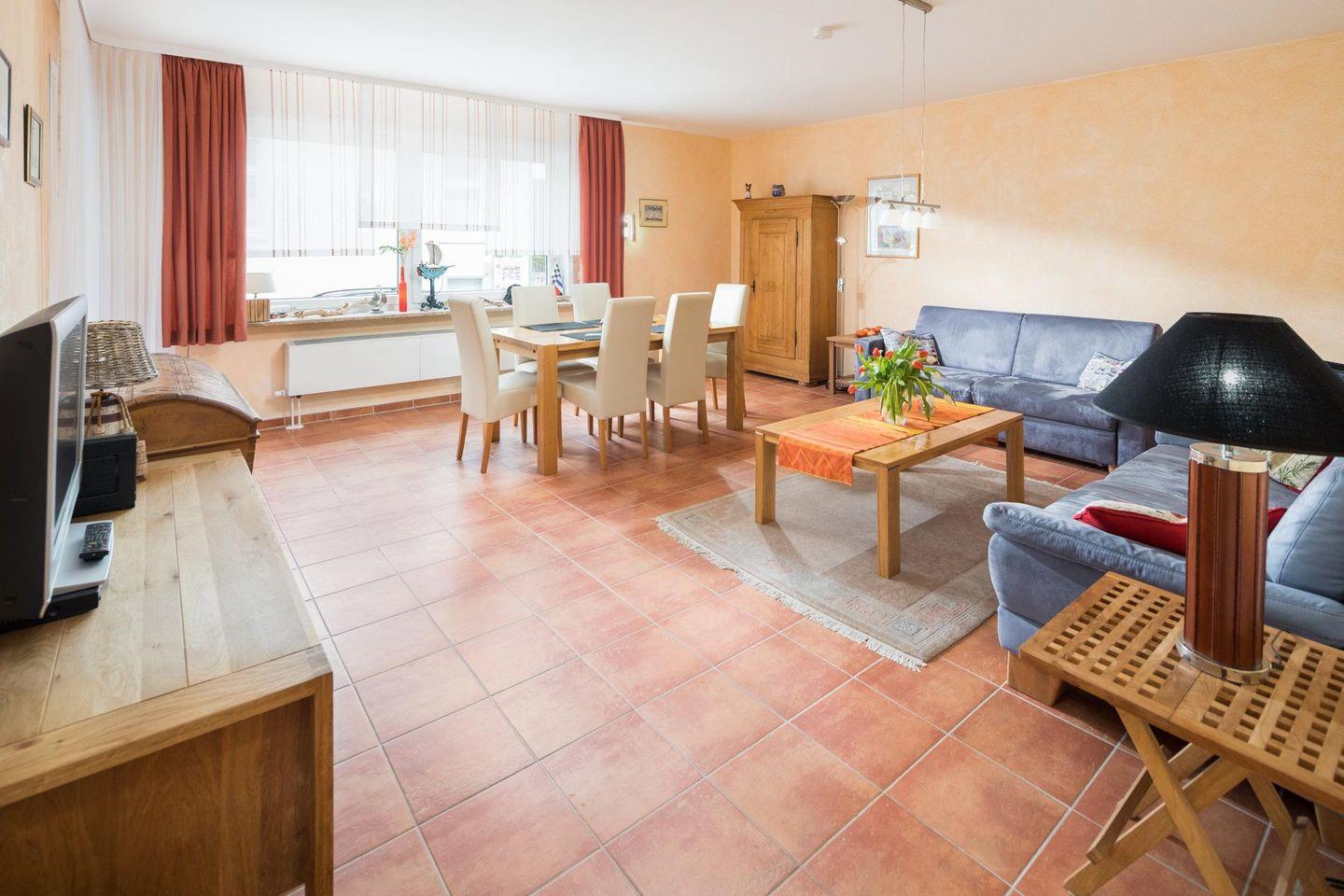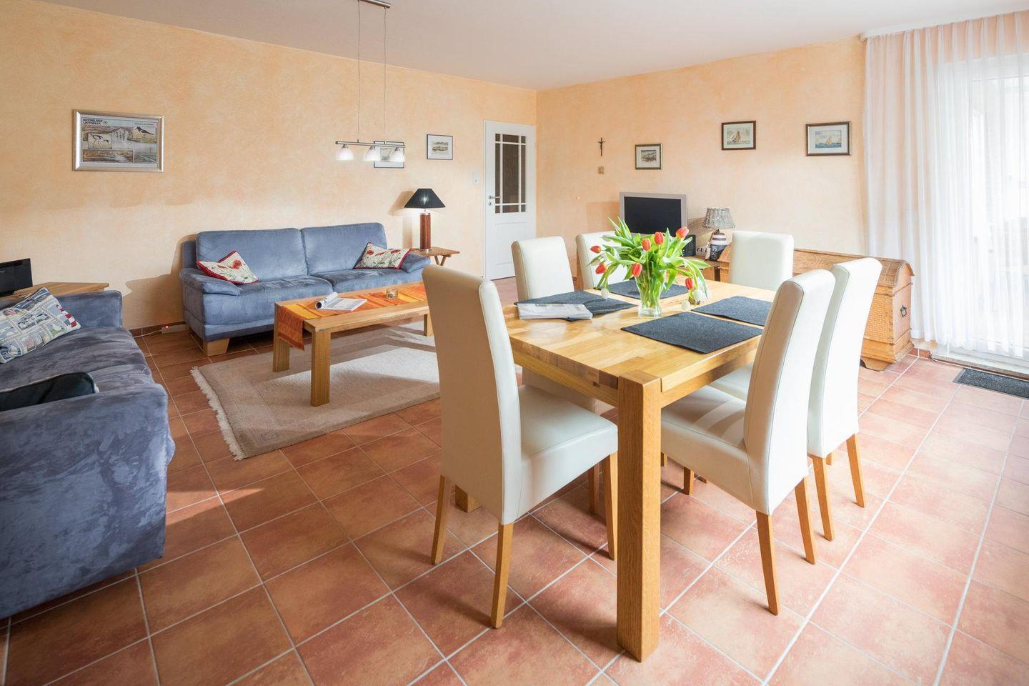 Die Wohnung verfügt über zwei separate Schlafzimmer. Beide Schlafzimmer sind mit einem Doppelbett ausgestattet. Das Wohnzimmer ist ebenfalls geräumig und beeindruckt durch seine Größe (für die Verhältnisse auf Norderney). Im Wohnbereich gibt es eine weitere Schlafmöglichkeit für ein Kind. Eine Tür führt zu einer Loggia (Südwest-Ausrichtung). Die Diele der Wohnung beherbergt eine gut ausgestattete Küche, die über einen Geschirrspüler, ein Ceranfeld-Herd und einen Backofen verfügt. Waschmaschine und Trockner stehen zur gemeinschaftlichen Nutzung (kostenpflichtig) zur Verfügung. Das moderne Badezimmer ist mit einer Dusche und einem WC ausgestattet. Hunde sind in dieser Wohnung nicht erlaubt.