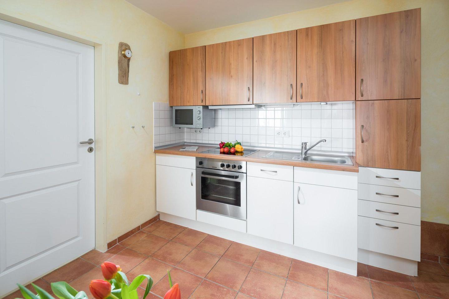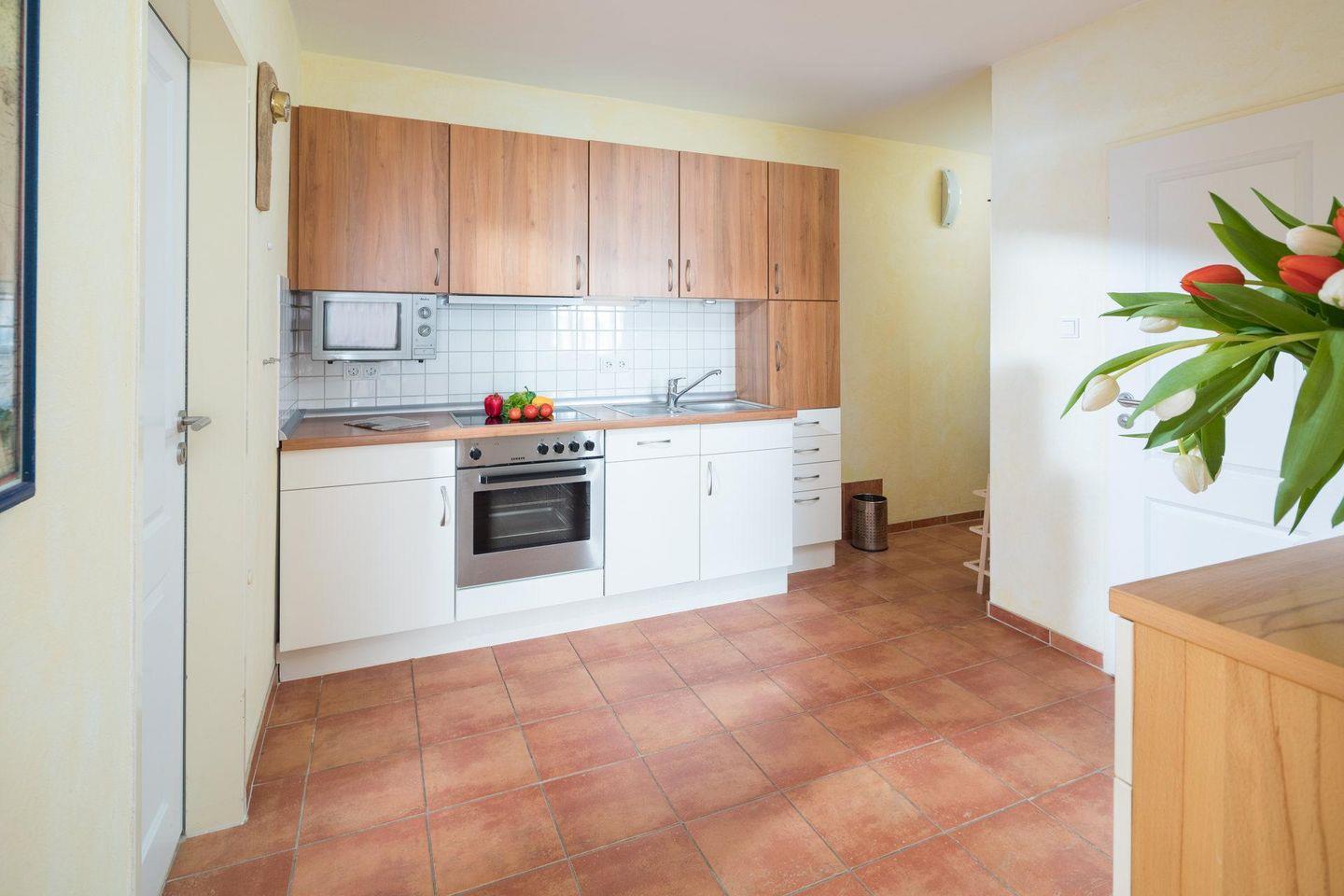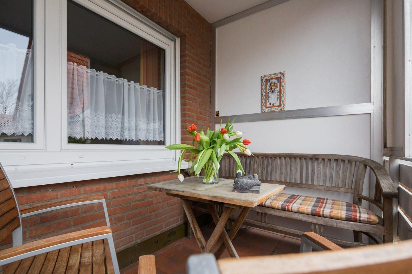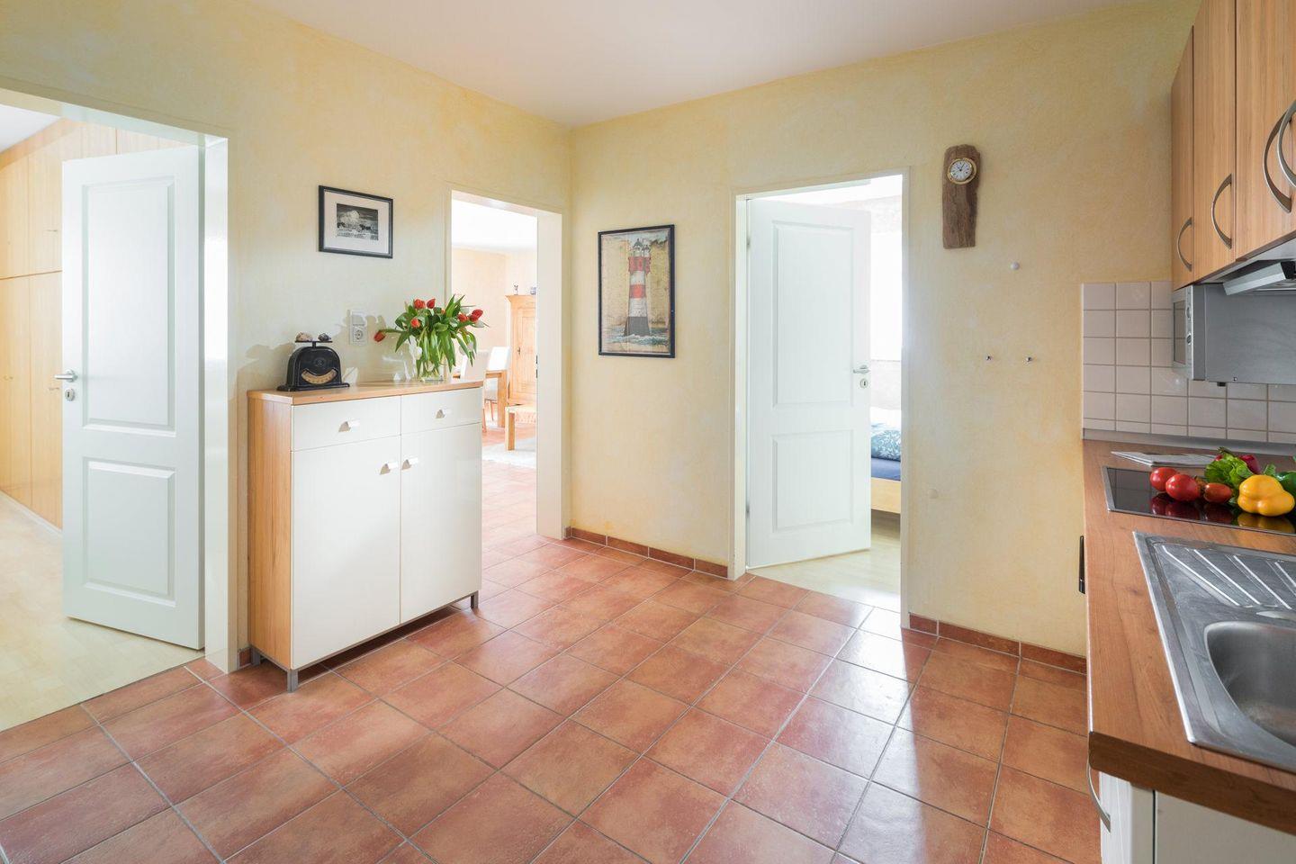 Die Wohnung verfügt über zwei separate Schlafzimmer. Beide Schlafzimmer sind mit einem Doppelbett ausgestattet. Das Wohnzimmer ist ebenfalls geräumig und beeindruckt durch seine Größe (für die Verhältnisse auf Norderney). Im Wohnbereich gibt es eine weitere Schlafmöglichkeit für ein Kind. Eine Tür führt zu einer Loggia (Südwest-Ausrichtung). Die Diele der Wohnung beherbergt eine gut ausgestattete Küche, die über einen Geschirrspüler, ein Ceranfeld-Herd und einen Backofen verfügt. Waschmaschine und Trockner stehen zur gemeinschaftlichen Nutzung (kostenpflichtig) zur Verfügung. Das moderne Badezimmer ist mit einer Dusche und einem WC ausgestattet. Hunde sind in dieser Wohnung nicht erlaubt.