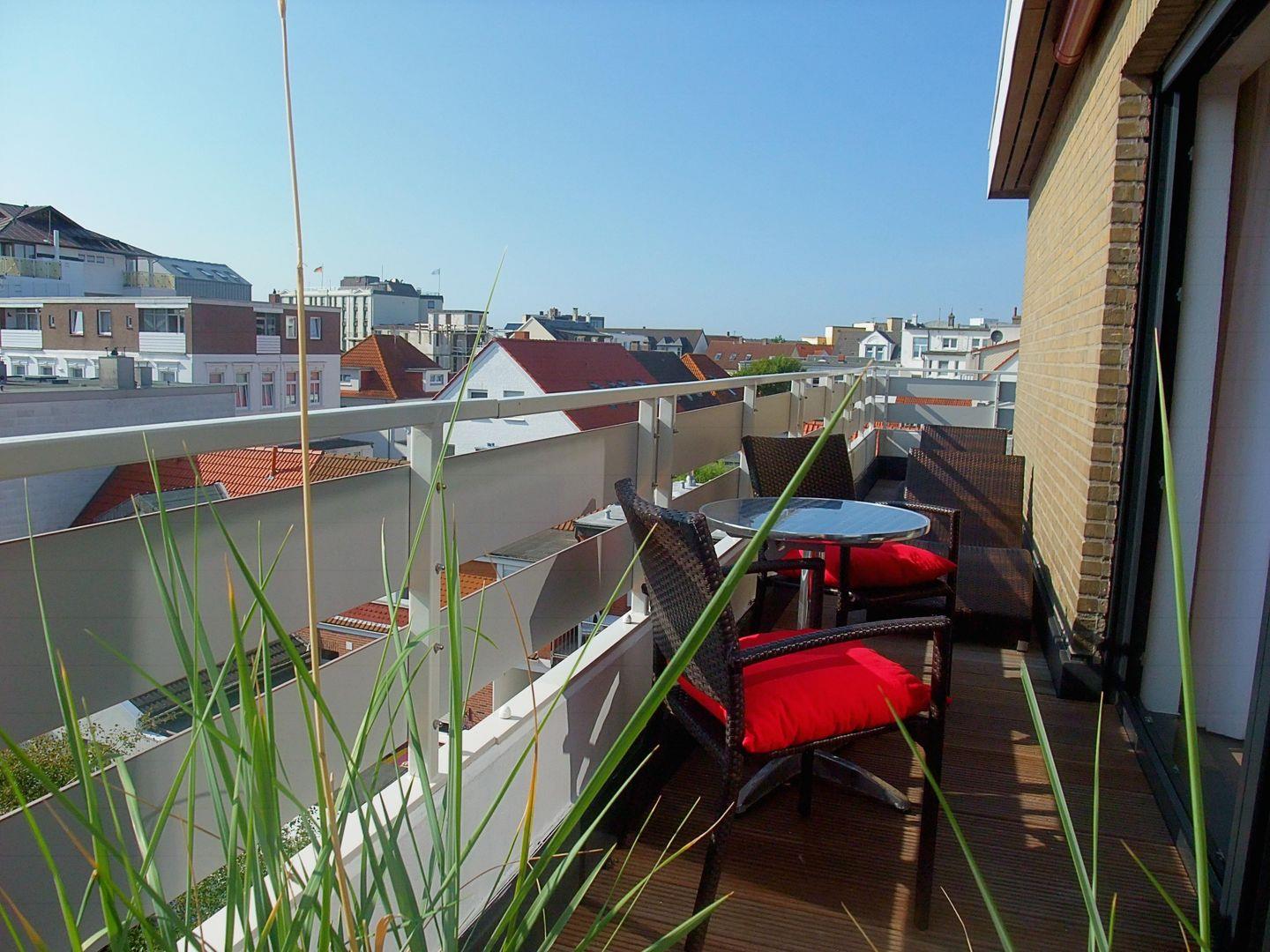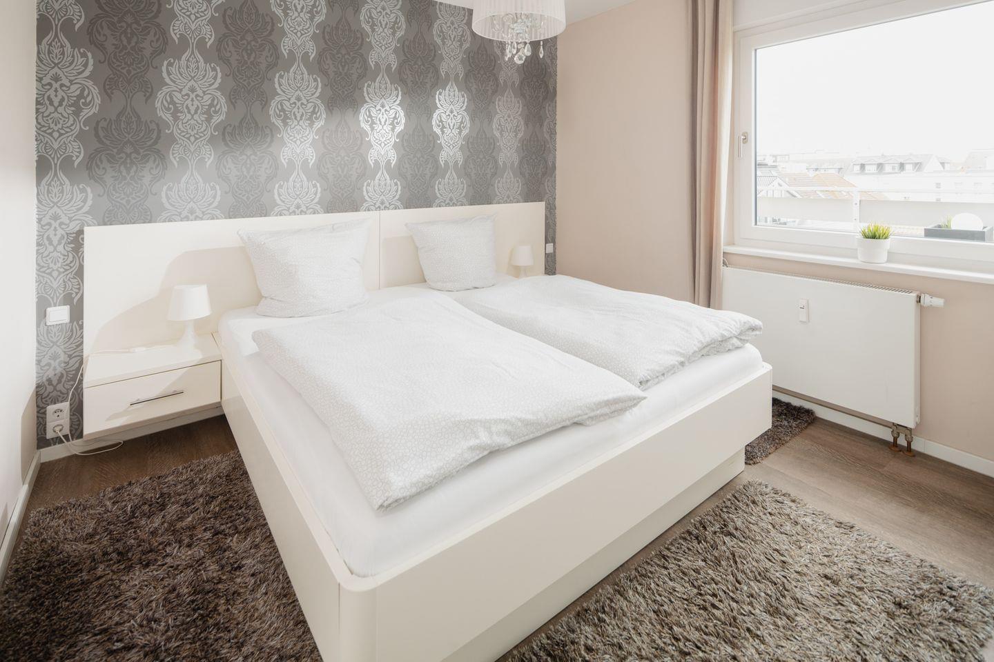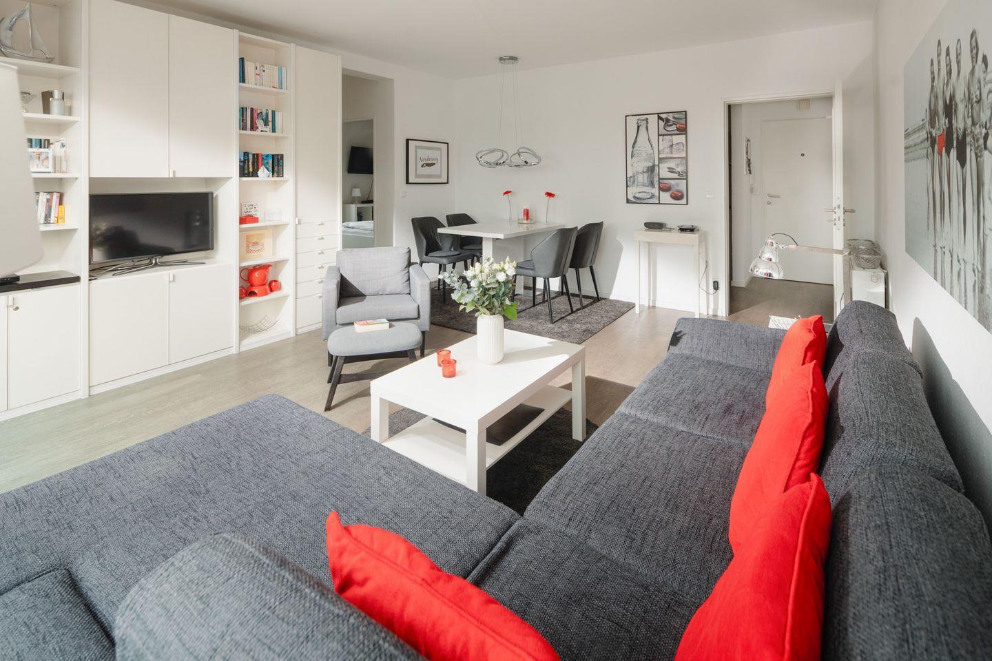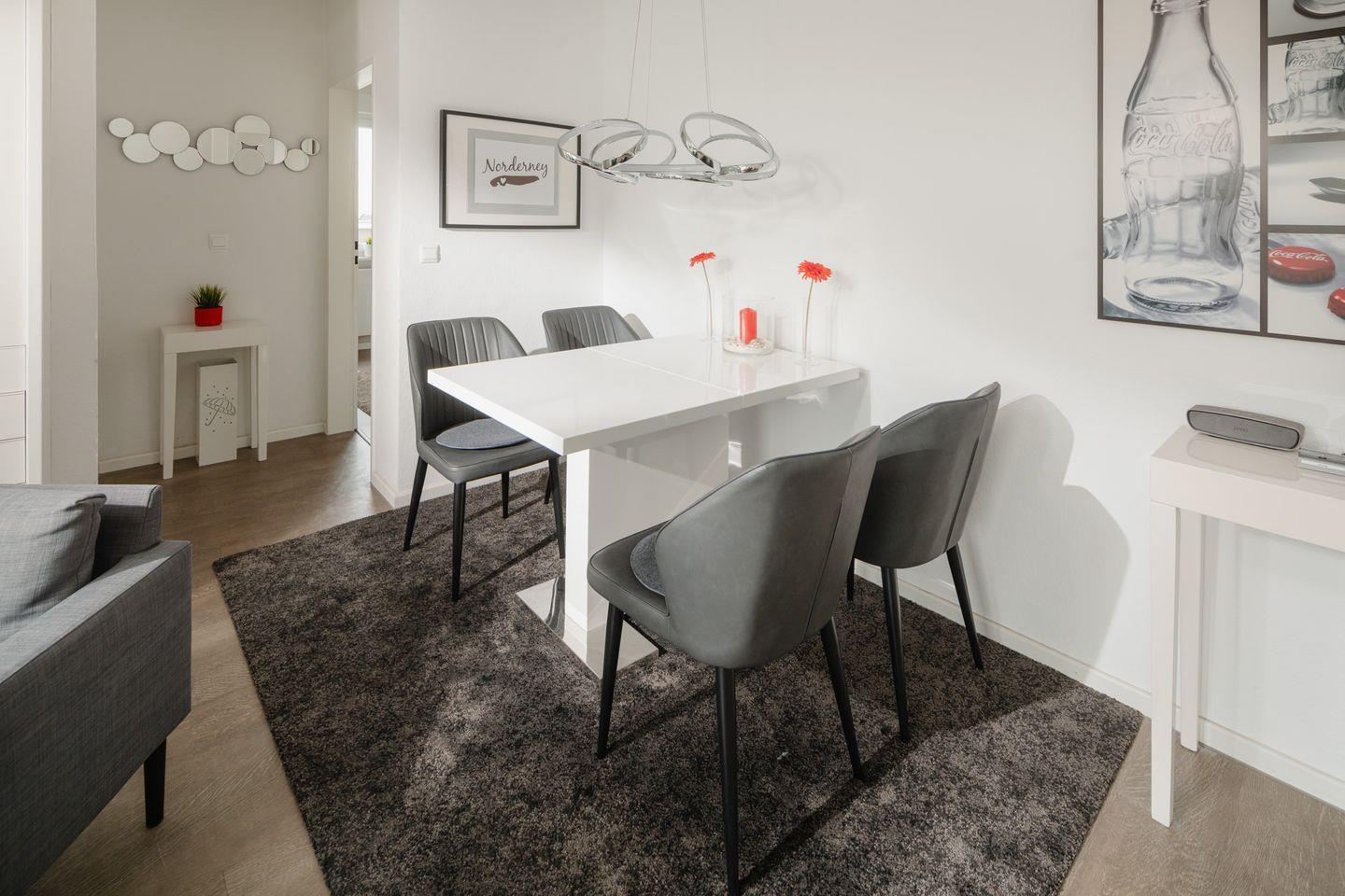 Die Wohnung verfügt über zwei Schlafzimmer. Eines ist mit einem Doppelbett und das andere mit zwei Einzelbetten ausgestattet. Das moderne Badezimmer ist mit einer Dusche und einem Handtuchtrockner eingerichtet. Zudem verfügt die Wohnung über ein Wohnzimmer mit einer Sitzgruppe. Die kleine Küche ist im Flurbereich integriert und mit einer Spülmaschine, einer Mikrowelle und einem Cerankochfeld ausgestattet. Ein Highlight ist der umlaufende Balkon. Hunde sind in dieser Ferienwohnung nicht erlaubt.