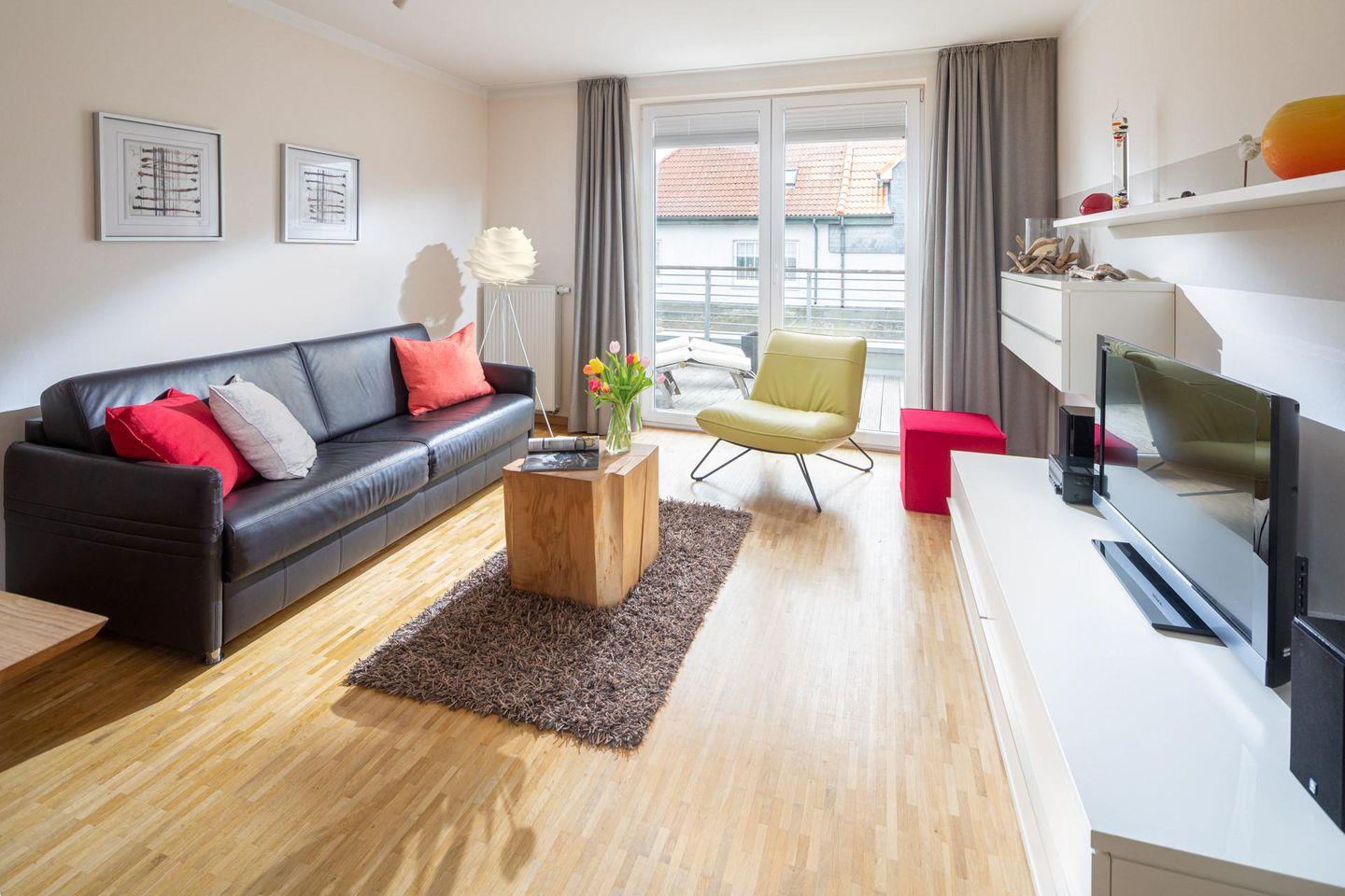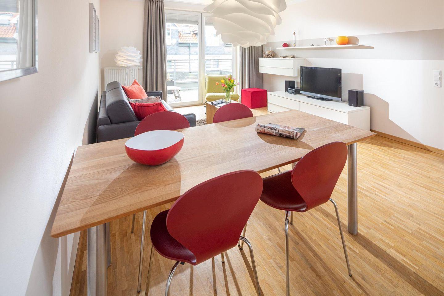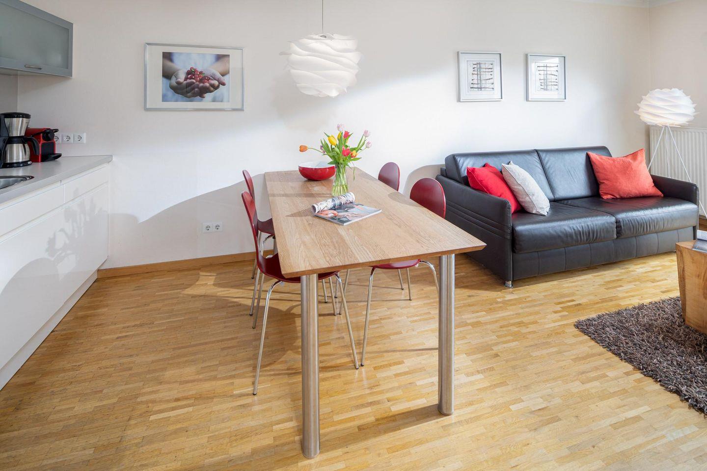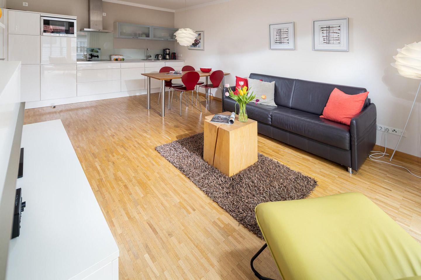 Die Wohnung verfügt über einen Wohnbereich mit Sitzecke, einer Essecke und einer voll ausgestatteten Küche. Das Badezimmer ist mit einer Dusche ausgestattet. Im Schlafzimmer befindet sich ein Doppelbett. Ein Highlight der Wohnung ist die Dachterrasse. Diese kann sowohl durch das Wohnzimmer als auch durch das Schlafzimmer betreten werden. Waschmaschine und Wäschetrockner befinden sich im Haus und stehen (für die gemeinschaftliche Nutzung gegen Münzeinwurf) zur Verfügung, was besonders für längere Aufenthalte von Vorteil ist. Hunde sind in dieser Wohnung nicht erlaubt.