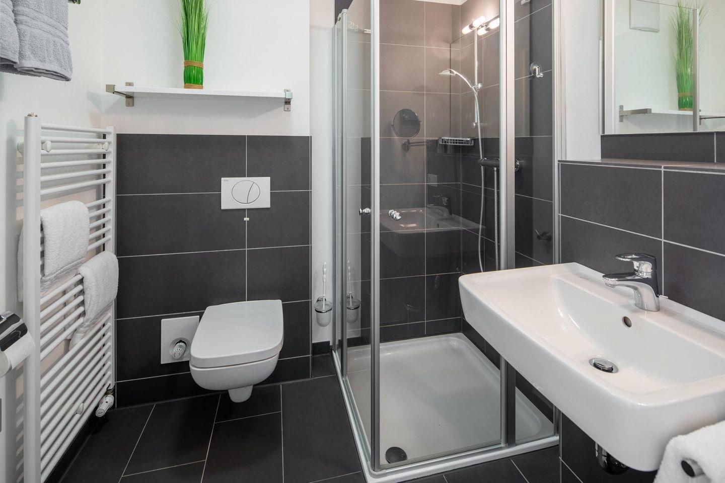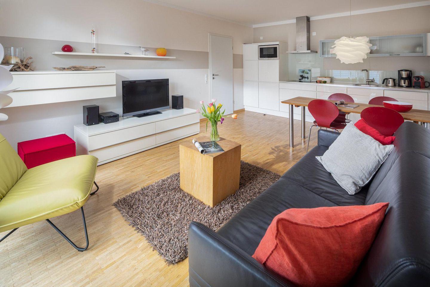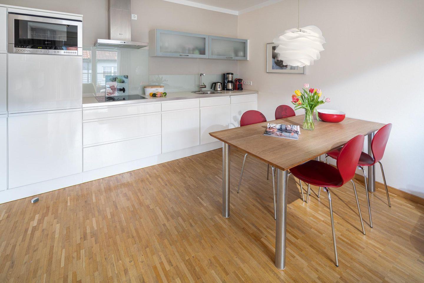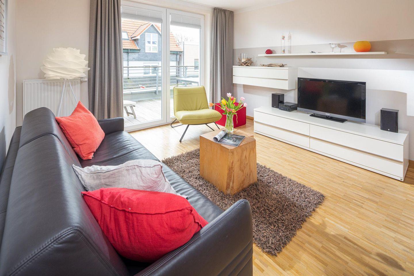 Die Wohnung verfügt über einen Wohnbereich mit Sitzecke, einer Essecke und einer voll ausgestatteten Küche. Das Badezimmer ist mit einer Dusche ausgestattet. Im Schlafzimmer befindet sich ein Doppelbett. Ein Highlight der Wohnung ist die Dachterrasse. Diese kann sowohl durch das Wohnzimmer als auch durch das Schlafzimmer betreten werden. Waschmaschine und Wäschetrockner befinden sich im Haus und stehen (für die gemeinschaftliche Nutzung gegen Münzeinwurf) zur Verfügung, was besonders für längere Aufenthalte von Vorteil ist. Hunde sind in dieser Wohnung nicht erlaubt.