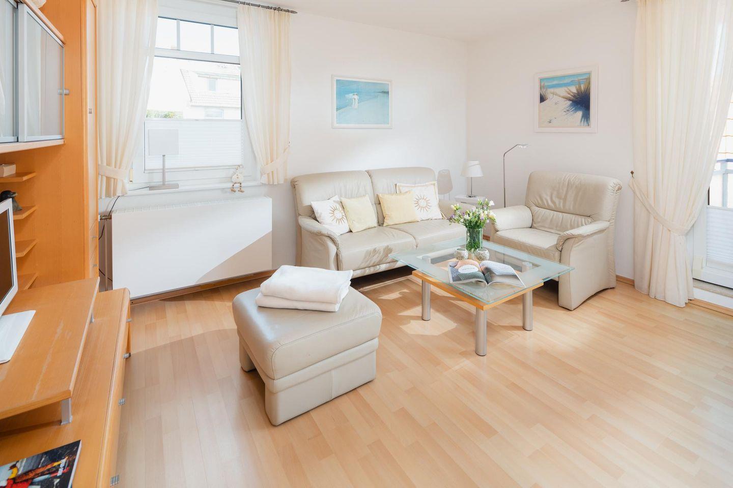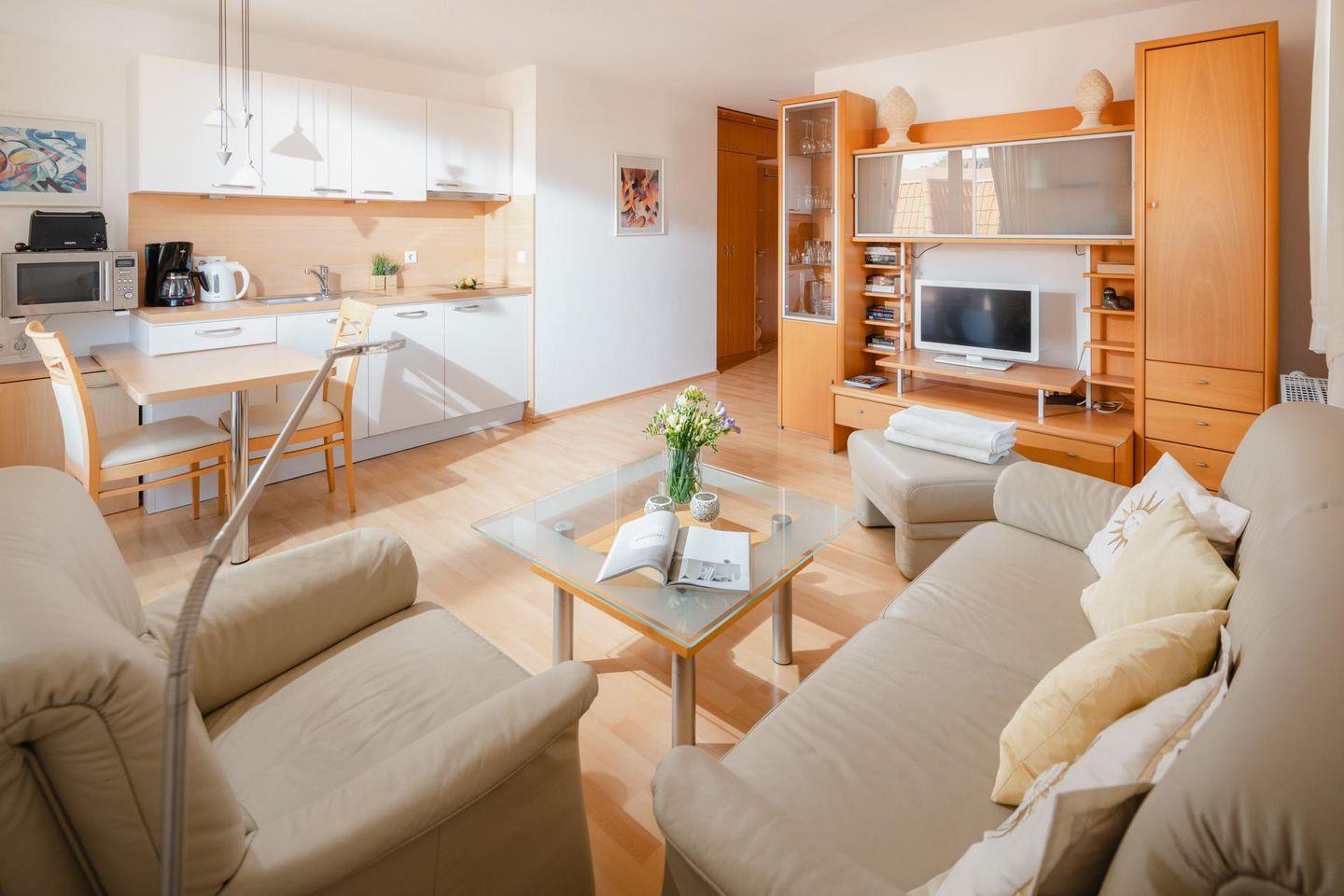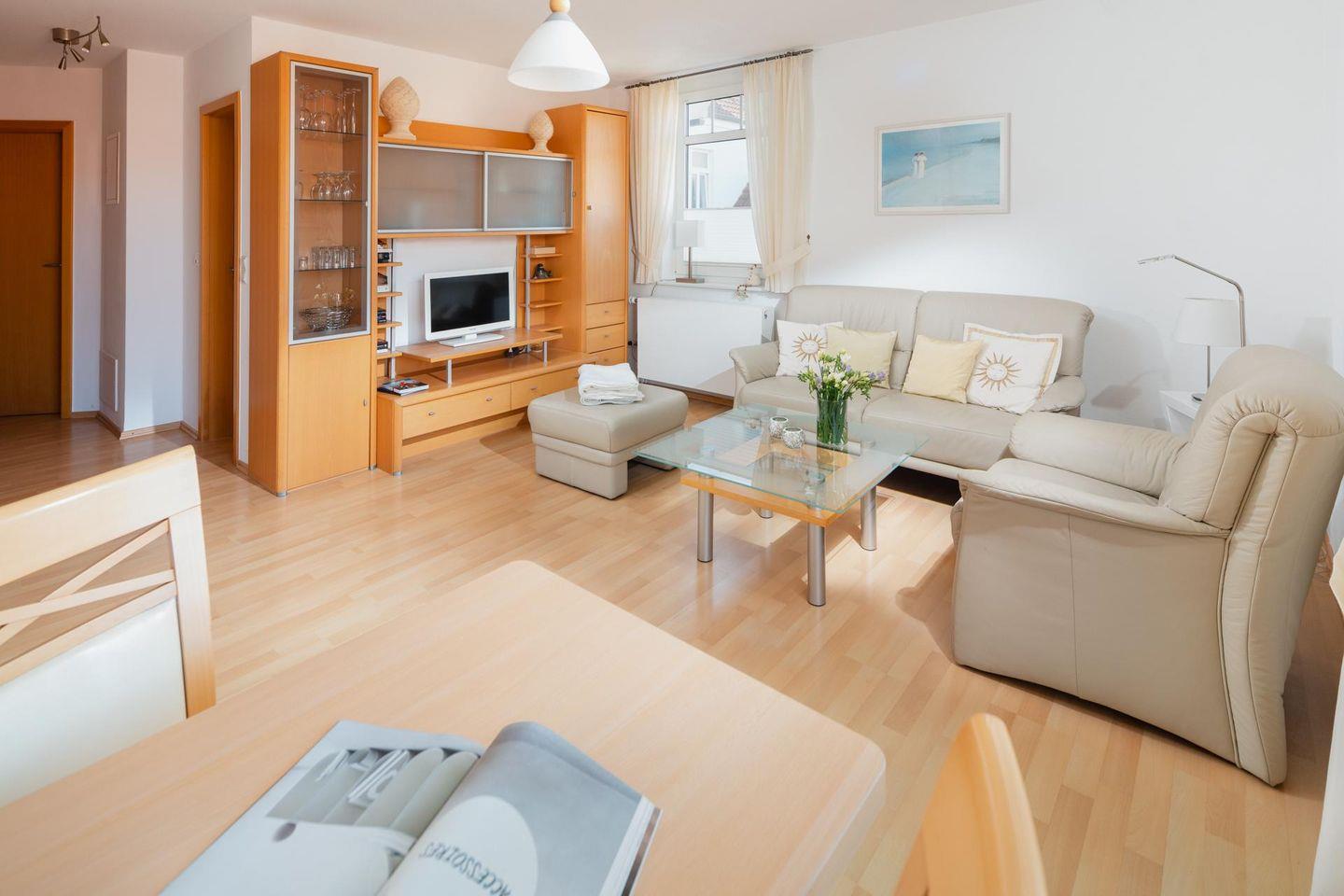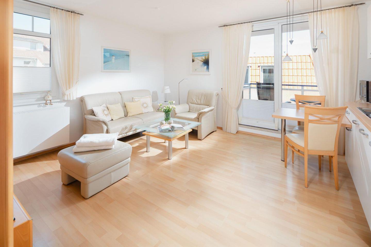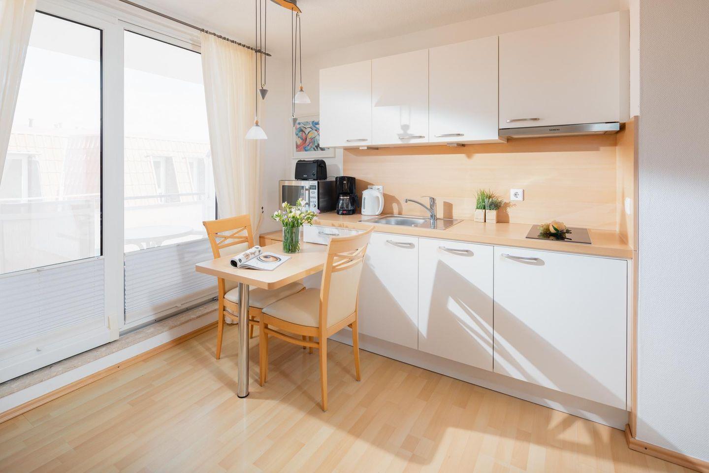 Die Wohnung 16 liegt im ersten Obergeschoss im rückwärtigen Teil des Hauses und ist nach Osten ausgerichtet. Sie ist hell eingerichtet und lichtdurchflutet. Das Schlafzimmer ist mit einem Doppelbett ausgestattet. Das Wohnzimmer verfügt über einen Koch- und Essbereich und einen neuen Smart-TV. Das Badezimmer ist modern gestaltet und verfügt über eine Dusche und ein WC mit Außenfenster. Ein besonderes Highlight der Wohnung "Windrose 16" ist der Balkon mit Balkonmöbeln. Fahrräder können im Ständer am Haus oder im Keller abgestellt werden. Waschmaschine und Wäschetrockner befinden sich im Haus und stehen (für die gemeinschaftliche Nutzung gegen Münzeinwurf) zur Verfügung, was besonders für längere Aufenthalte von Vorteil ist. Haustiere (Hunde) sind in dieser Ferienwohnung nicht erlaubt.