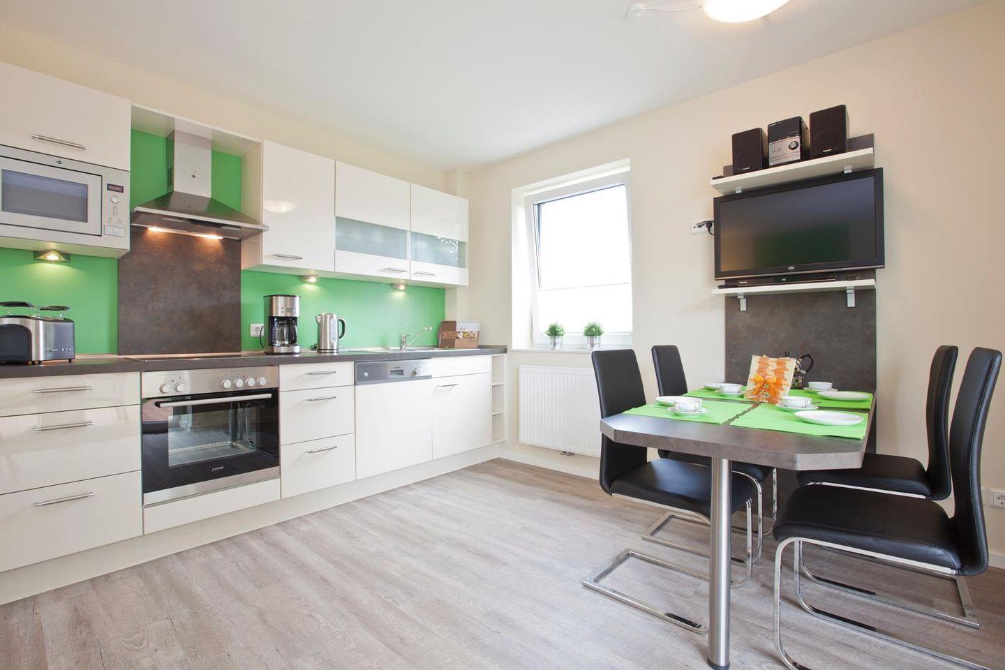 Die Wohnung wurde modern eingerichtet. Insgesamt stehen 2 Schlafzimmer, eines mit einem Doppelbett und eines mit zwei Einzelbetten ausgestattet, zur Verfügung. Das Badezimmer verfügt über eine Dusche. Der Wohnbereich wurde mit einer voll ausgestatteten Küchenzeile sowie einem Essbereich eingerichtet. Vom Wohnbereich kann die eigene Terrasse betreten werden.