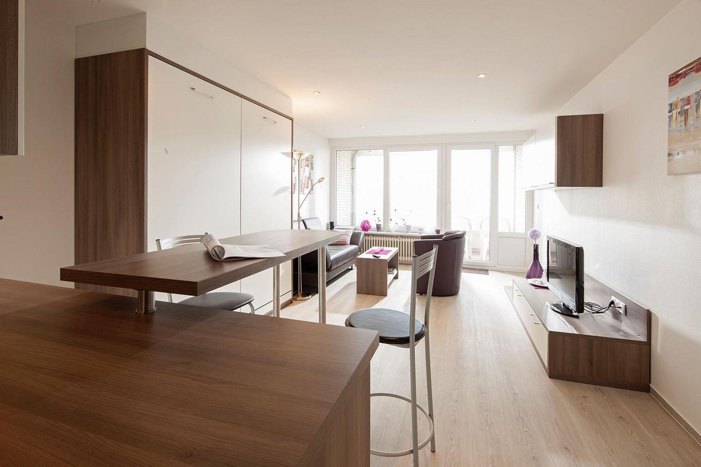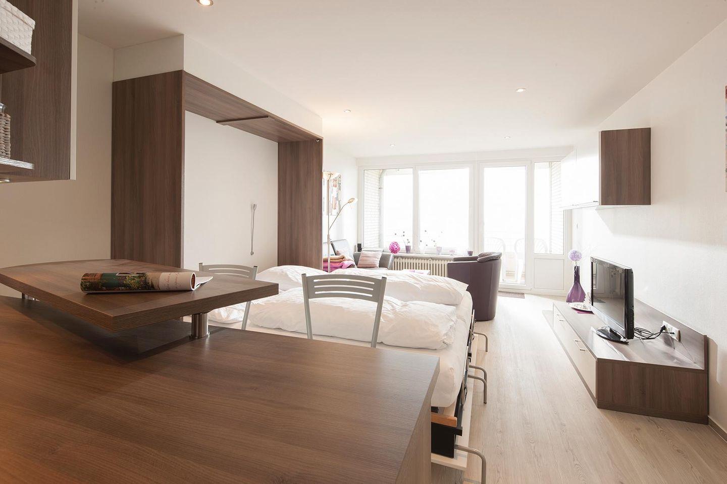 Die Wohnung besteht aus einem Wohnschlafzimmer, einem Badezimmer und dem zum Meer ausgerichteten Balkon. Für genügend Bewegungsfreiheit innerhalb der Wohnung, lässt sich das Schrankklappbett einfach einklappen.