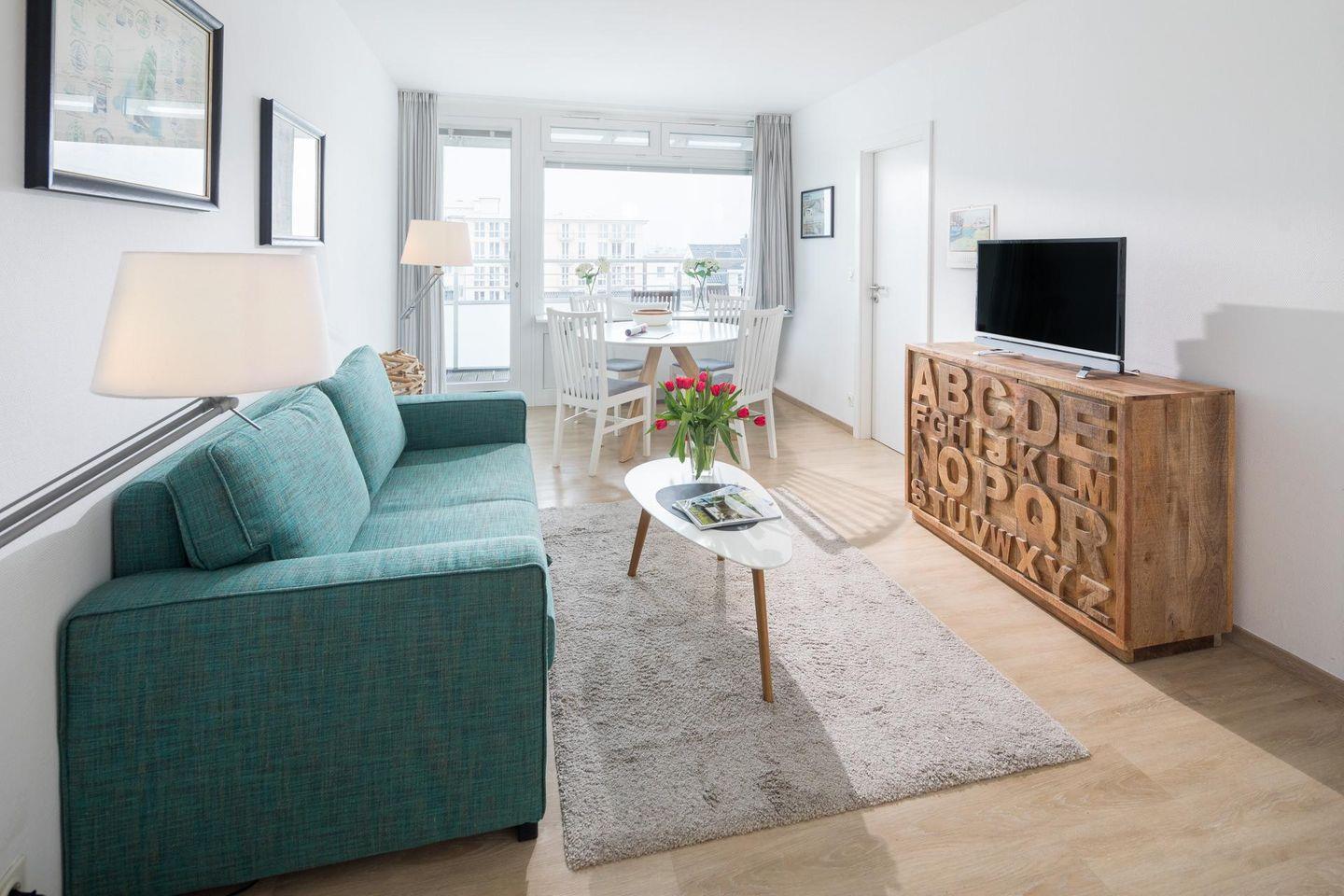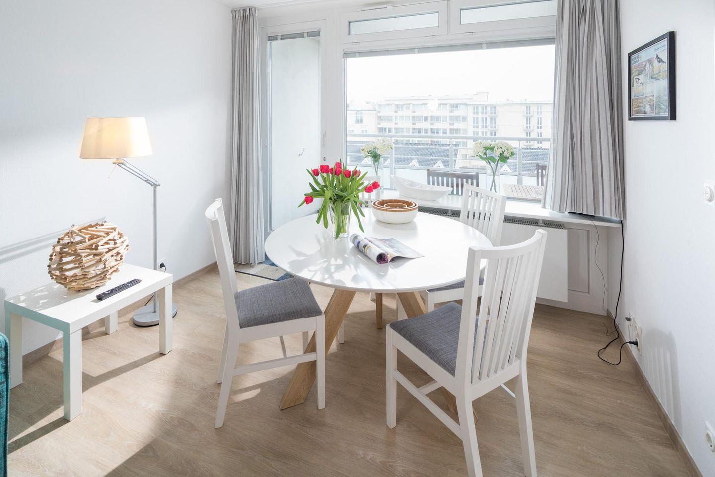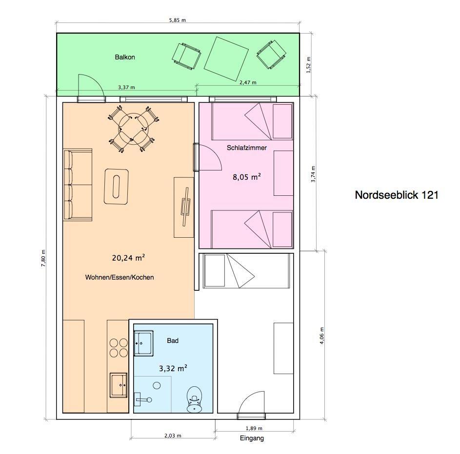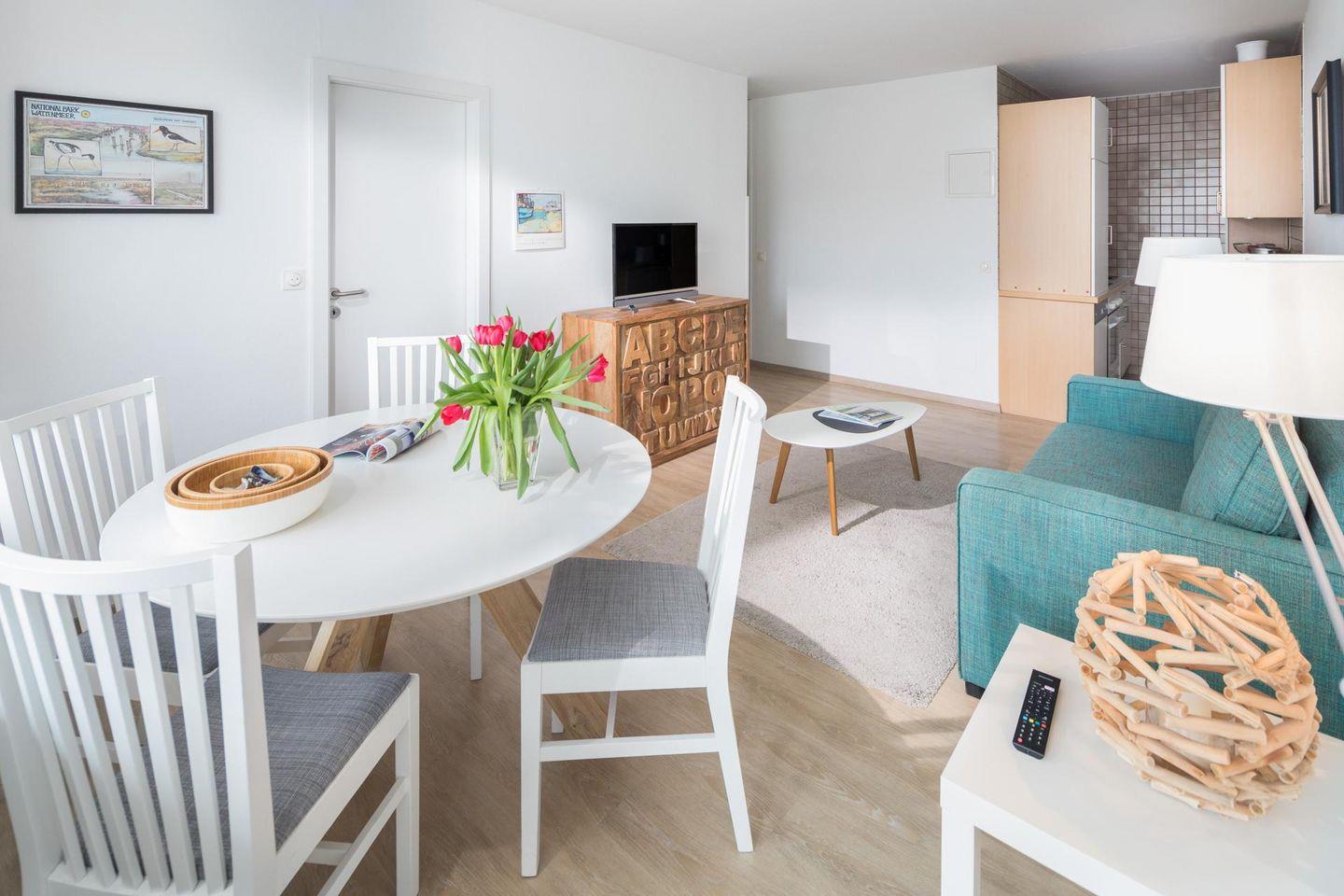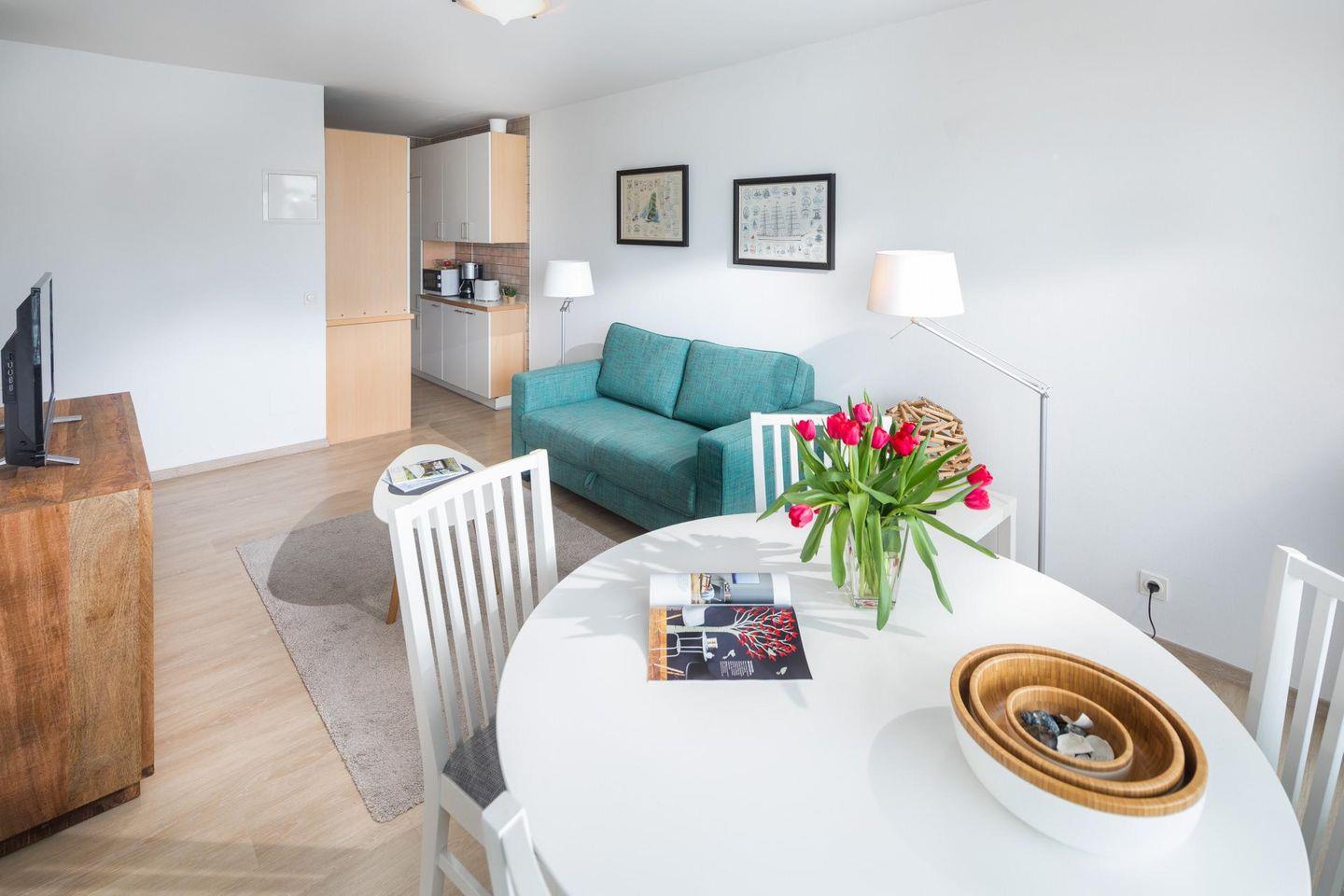 Die Wohnung 121 wurde kürzlich renoviert und in maritimen Farben neu möbliert. Die Wohnung verfügt über ein Wohn- und Schlafzimmer mit zwei Einzelbetten und eine kleine, aber gut ausgestattete Küchenecke. Für eine weitere Schlafmöglichkeit steht eine Schlafcouch im Wohnzimmer zur Verfügung. Das moderne Badezimmer ist mit einer Dusche und einem Handtuchtrockner ausgestattet. Ein Highlight der Wohnung ist der (mit Teakholzmöbeln) möblierte Nord/Ost Balkon. Waschmaschine und Wäschetrockner befinden sich im Haus und stehen (für die gemeinschaftliche Nutzung gegen Münzeinwurf) zur Verfügung, was besonders für längere Aufenthalte von Vorteil ist. Hunde sind in dieser Wohnung nicht erlaubt.