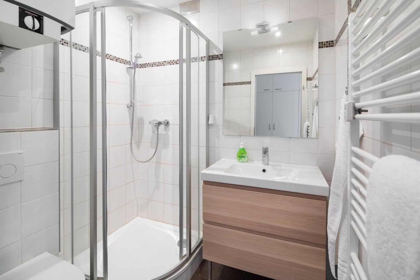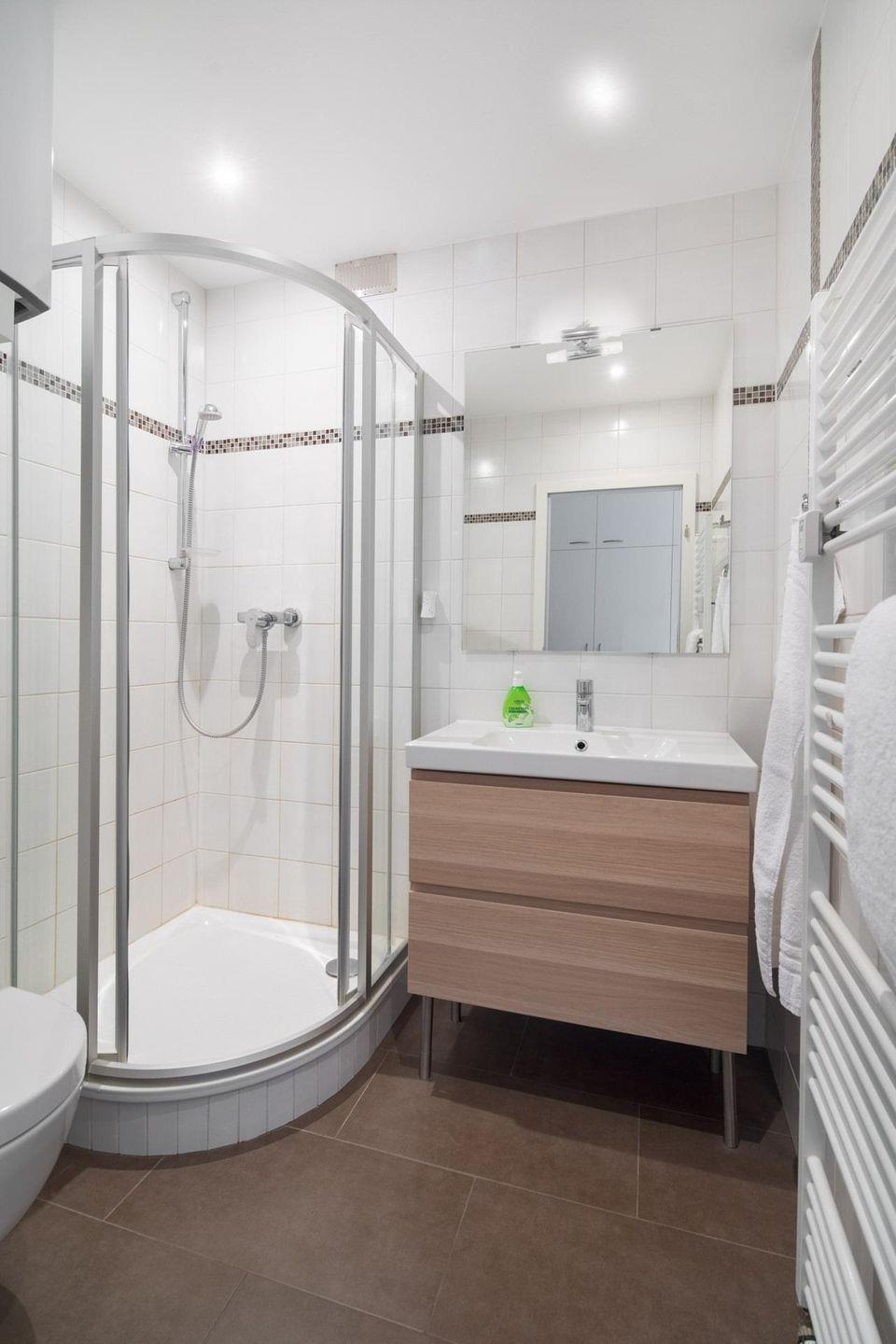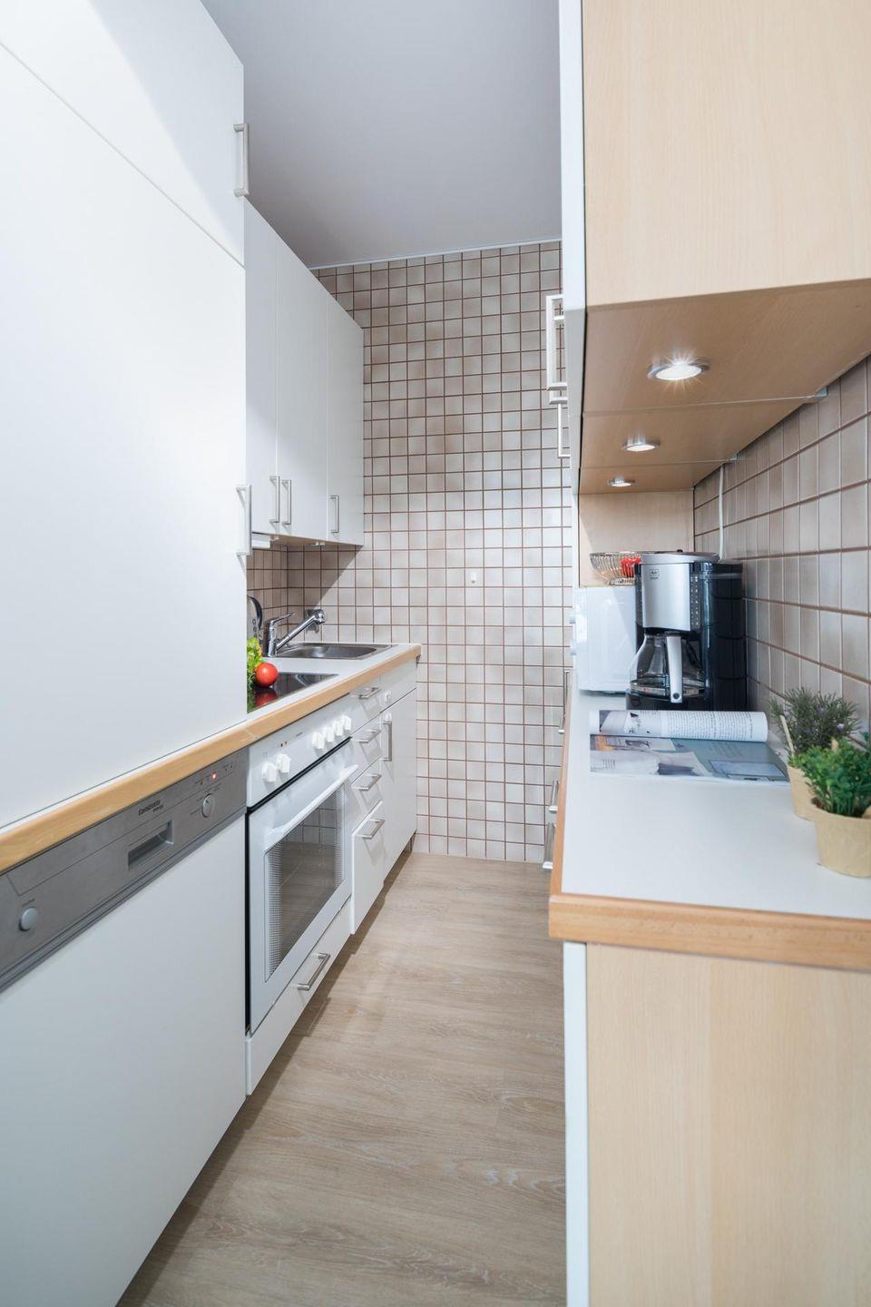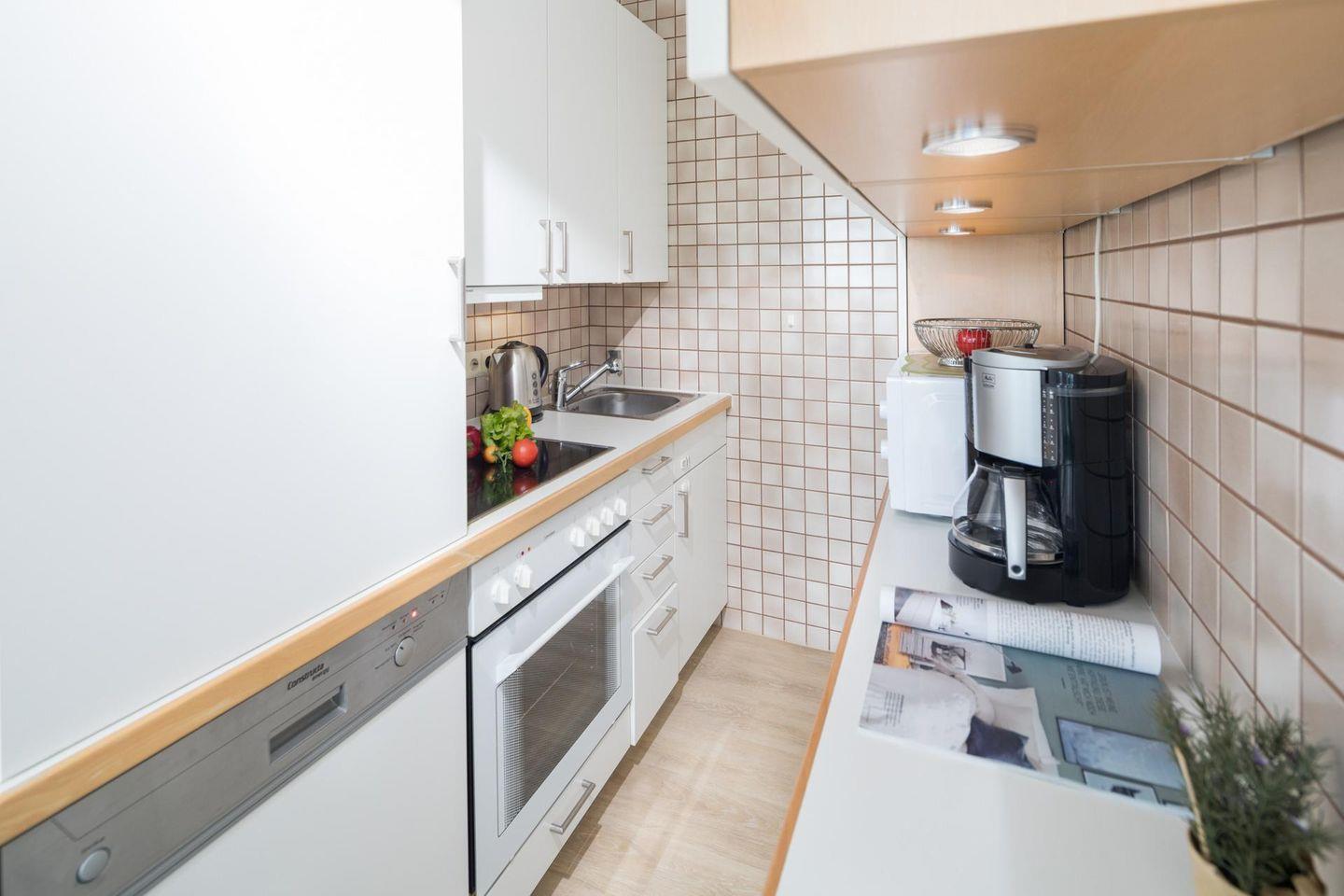 Die Wohnung 121 wurde kürzlich renoviert und in maritimen Farben neu möbliert. Die Wohnung verfügt über ein Wohn- und Schlafzimmer mit zwei Einzelbetten und eine kleine, aber gut ausgestattete Küchenecke. Für eine weitere Schlafmöglichkeit steht eine Schlafcouch im Wohnzimmer zur Verfügung. Das moderne Badezimmer ist mit einer Dusche und einem Handtuchtrockner ausgestattet. Ein Highlight der Wohnung ist der (mit Teakholzmöbeln) möblierte Nord/Ost Balkon. Waschmaschine und Wäschetrockner befinden sich im Haus und stehen (für die gemeinschaftliche Nutzung gegen Münzeinwurf) zur Verfügung, was besonders für längere Aufenthalte von Vorteil ist. Hunde sind in dieser Wohnung nicht erlaubt.