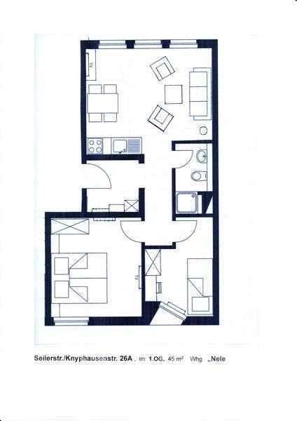 Die Ferienwohnung "Nele" liegt in der Seilerstraße. Das Haus, in dem sich die Wohnung befindet, beherbergt insgesamt fünf Wohnungen und besticht durch seine gepflegte und moderne Architektur. Die Wohnung liegt im ersten Stock und bietet Platz für bis zu 4 Personen.