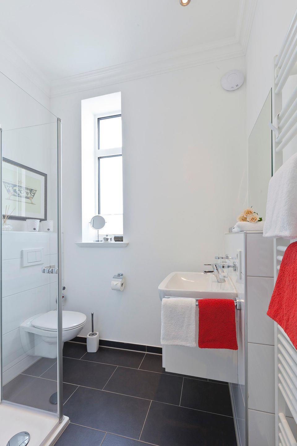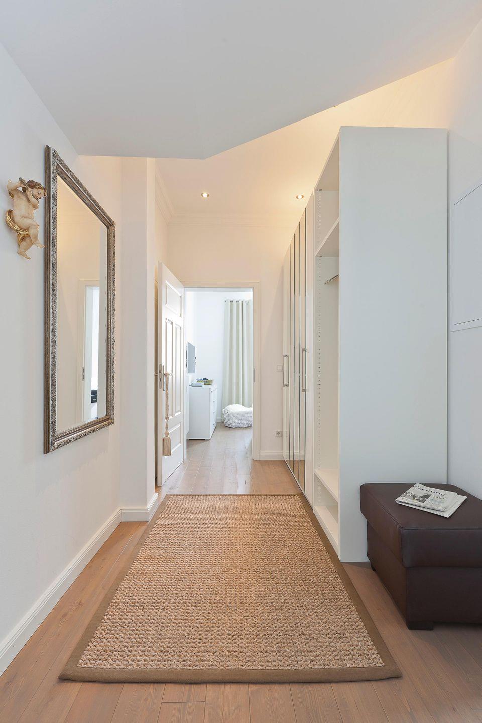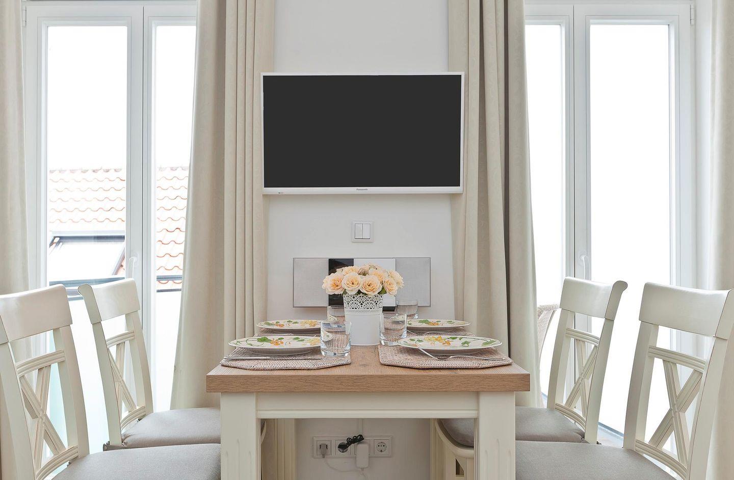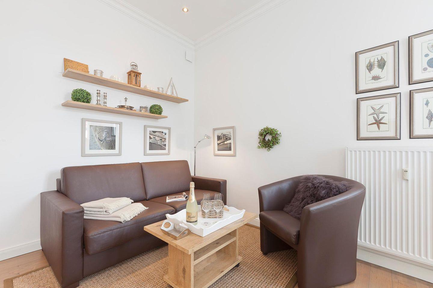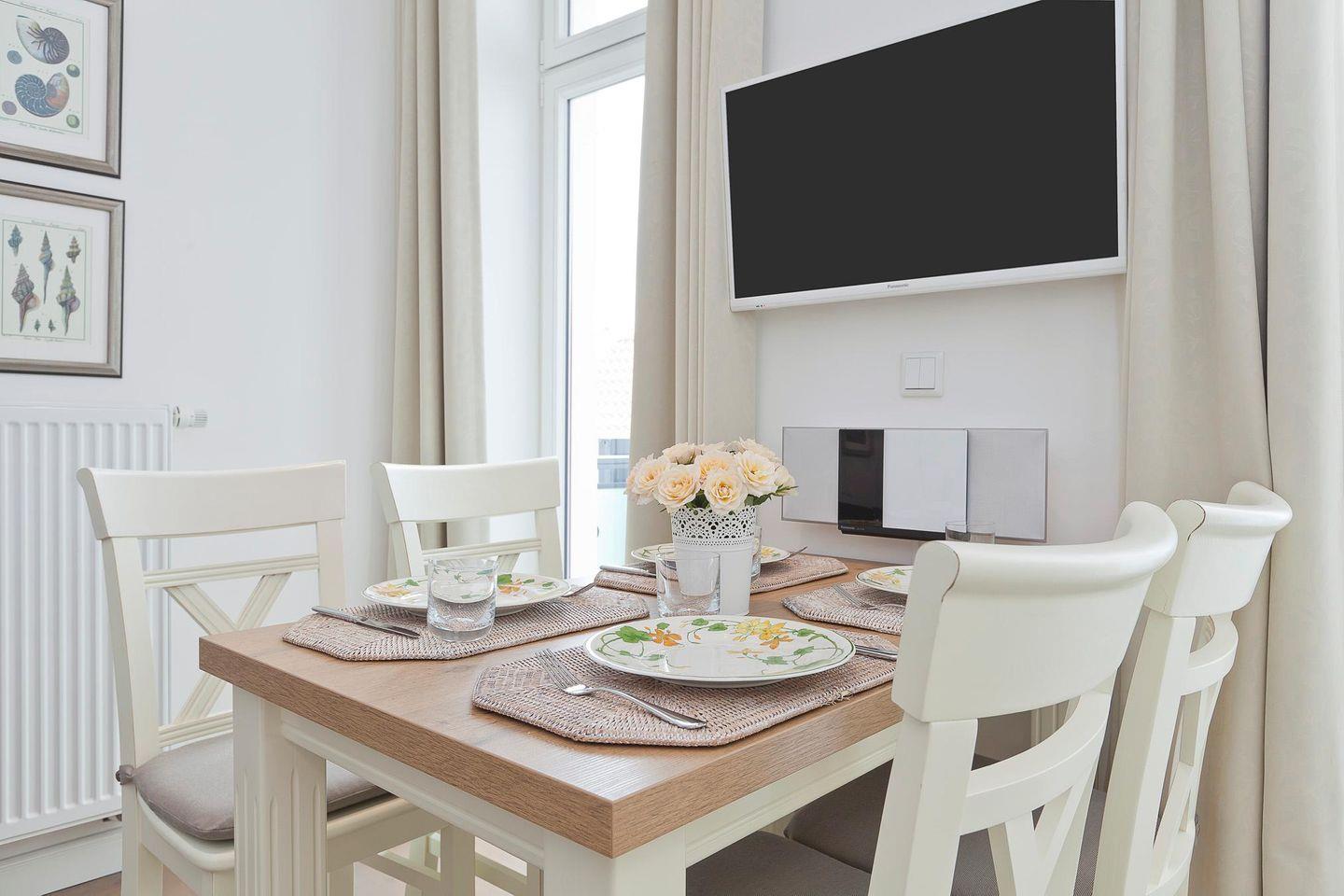 Bei der Einrichtung der Wohnung wurde auf ein harmonisches Farbkonzept Wert gelegt. Das Schlafzimmer ist mit einem Doppelbett ausgestattet. Zudem gibt es einen Wohn-Küchenbereich mit einem Essbereich. Neben einer klassischen Filterkaffeemaschine steht auch eine Nespressomaschine zur Verfügung. Das moderne Badezimmer verfügt über eine Dusche und einen Handtuchtrockner. Die Wohnung verfügt außerdem über einen Balkon (zur Rückseite der Wohnung). Eine Waschmaschine und ein Wäschetrockner befinden sich im Keller. Hunde sind in dieser Wohnung nicht erlaubt.