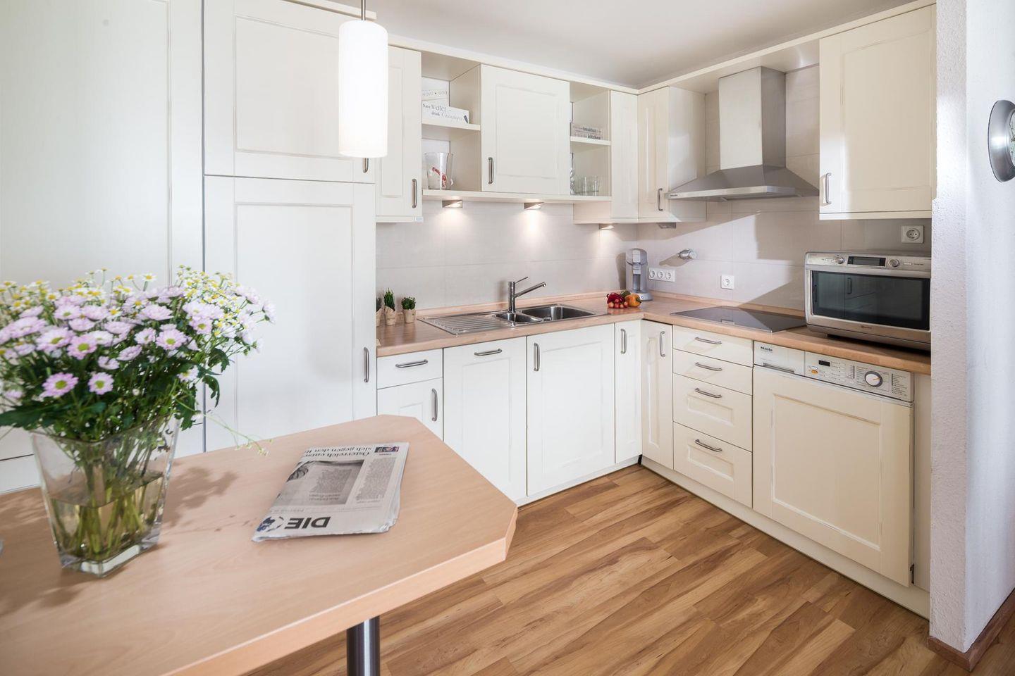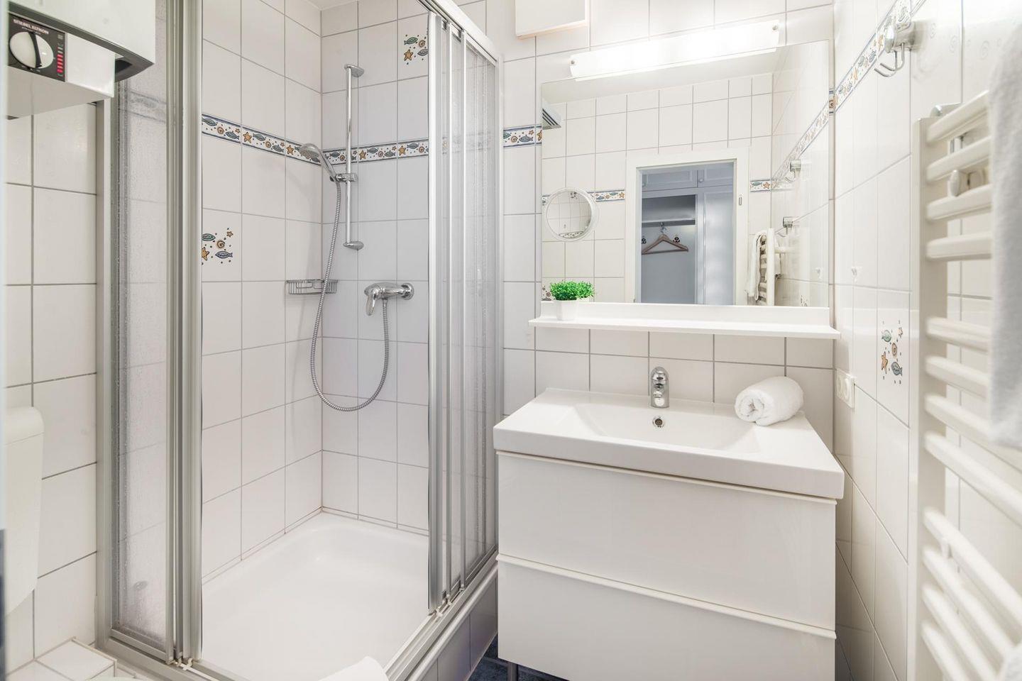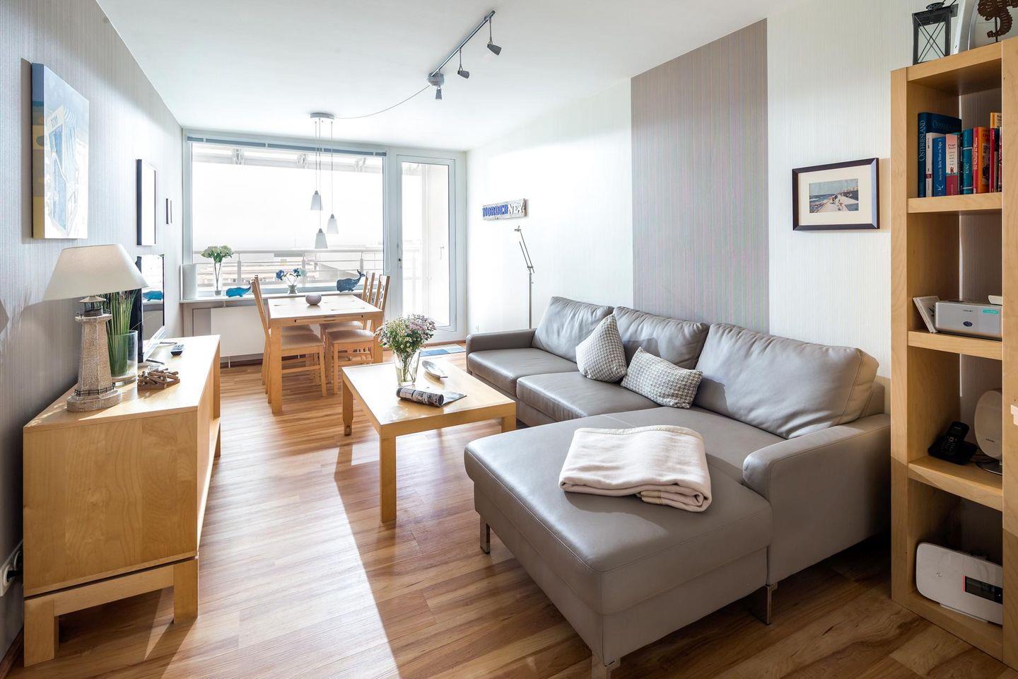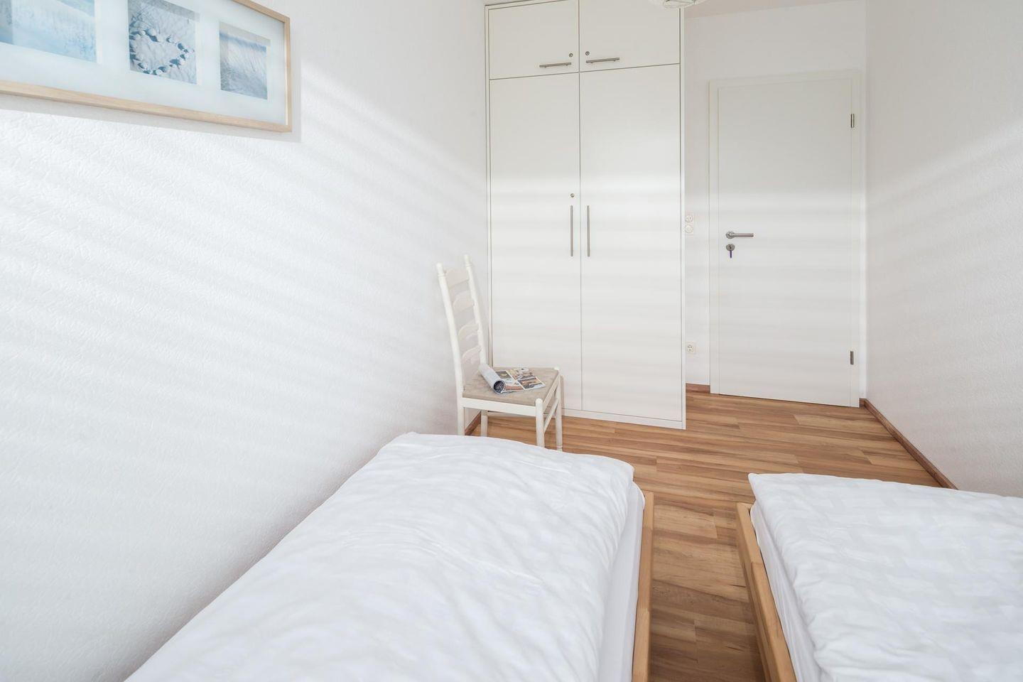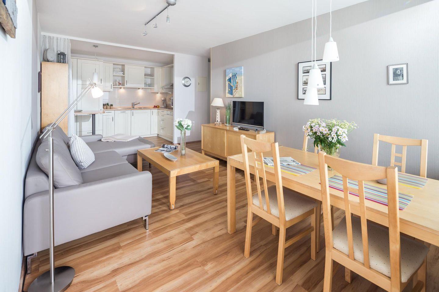Die Wohnung ist mit Kernbuchenmöbeln eingerichtet und in einer maritimen Farbgebung in Blau und Sand gehalten. Die Wohnung verfügt über zwei Schlafzimmer, die jeweils mit zwei Einzelbetten ausgestattet sind. Der Wohnbereich integriert die offene Küche und den Essbereich. Das Badezimmer ist mit einer Dusche und einem Handtuchtrockner ausgestattet. Der Balkon ist nach Osten ausgerichtet und bietet einen seitlichen Blick auf das Meer. Waschmaschine und Wäschetrockner befinden sich im Haus und stehen (für die gemeinschaftliche Nutzung gegen Münzeinwurf) zur Verfügung, was besonders für längere Aufenthalte von Vorteil ist. Hunde sind hier nicht erlaubt.