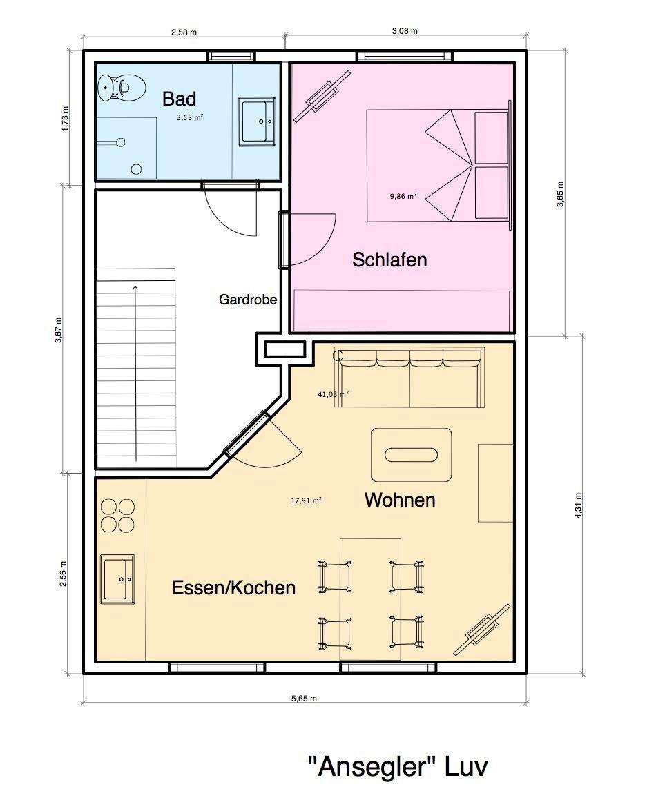 Die Wohnung "Luv" erstreckt sich über den ersten Stock des Hauses und bietet eine 2-Zimmer-Aufteilung. Die Einrichtung der Wohnung wurde modern gehalten. Das Herzstück der Wohnung ist das Wohnzimmer, in dem ein Schlafsofa mit einer Breite von 160 cm Platz für bis zu zwei Personen bietet. Dies ermöglicht es, dass insgesamt 4 Personen in dieser Wohnung untergebracht werden können. Das Badezimmer der Wohnung ist modern ausgestattet.