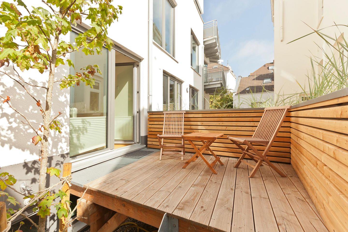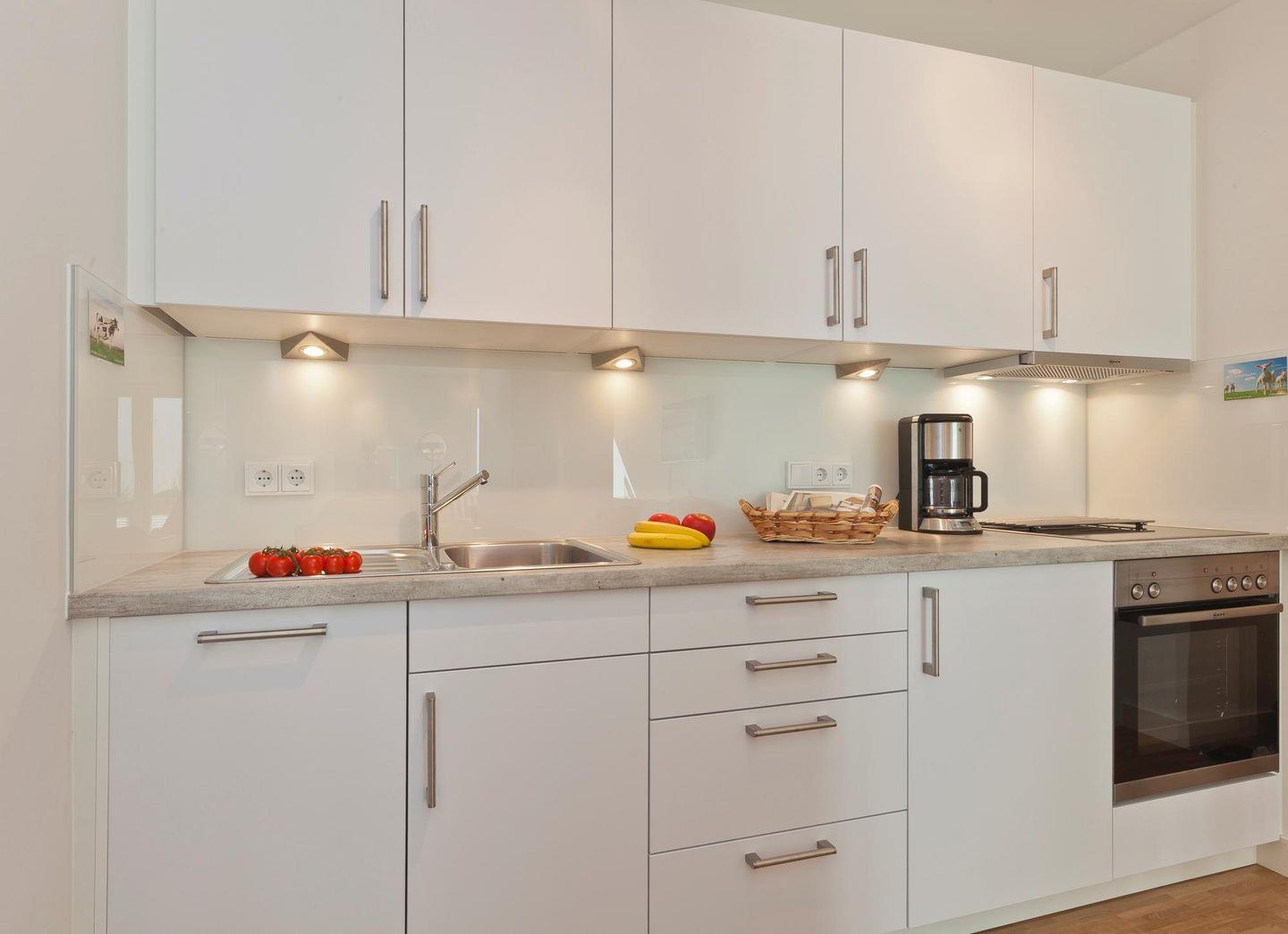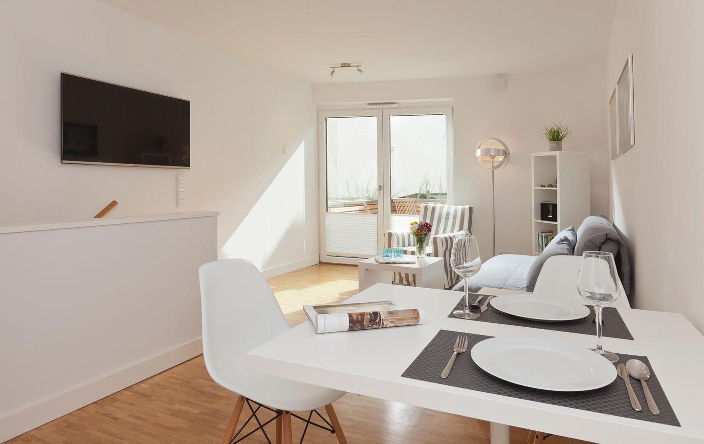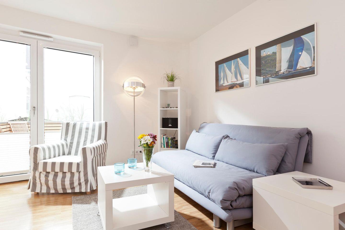 Das Schlafzimmer ist mit einem Boxspringbett eingerichtet. Im Wohnzimmer befindet sich ein Schlafsofa, das Platz für bis zu zwei Kindern zum schlafen bietet. Die Wohnung ist somit ideal für eine kleine Familie. Technisch ist die Wohnung mit einem Bose Soundtouch Gerät mit I-Phone Airplayverbindung ausgestattet. Auch andere Smartphones können mit Kabel verbunden werden. Ein Highlight der Wohnung ist eine etwa 5 qm große, nach Süden ausgerichtete und windgeschützte Terrasse. Hier darf auch der vierbeinige Freund mitkommen, denn die Ferienwohnung heißt auch Hunde herzlich willkommen. Erlaubt ist maximal 1 Hund (Höhe maximal kniehoch). Die Hundewiese befindet sich in der Nähe des Fährhafens (kein Leinenzwang).