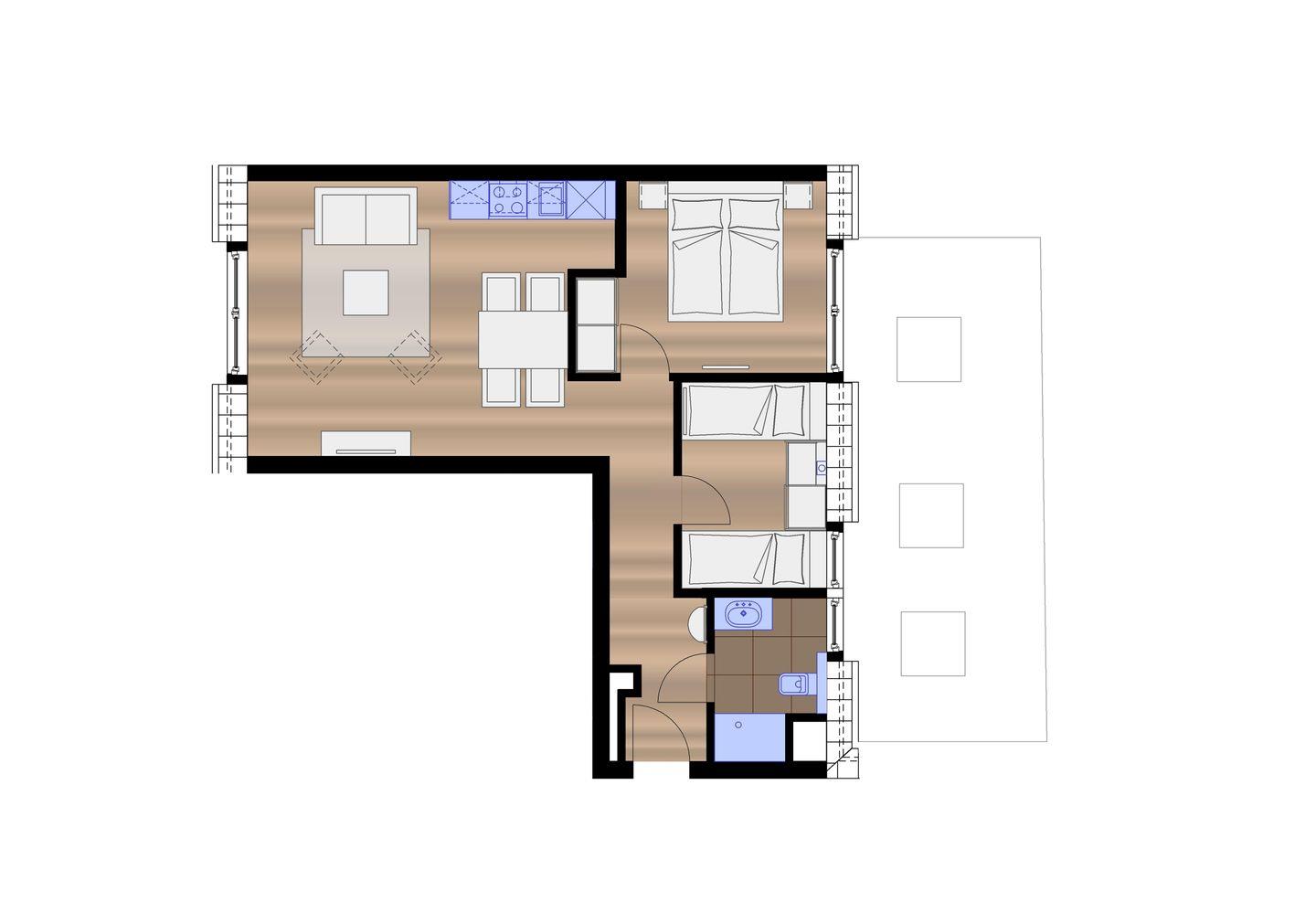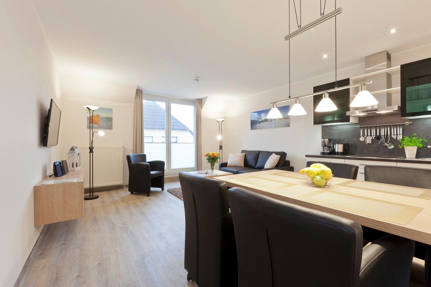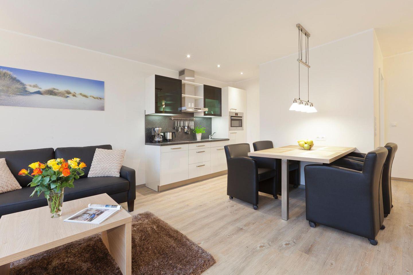 Die Wohnung "Petrina 9" bietet mit ihren zwei Schlafzimmern ausreichend Platz für bis zu vier Personen. Ein Schlafzimmer ist mit einem Doppelbett ausgestattet, während das zweite Schlafzimmer über zwei Einzelbetten verfügt. Das Wohnzimmer bietet eine Sitzecke. Die angrenzende Küchenecke ist voll ausgestattet und bietet zudem einen Essbereich. Das Badezimmer mit Dusche und WC ist modern gestaltet. Waschmaschine und Wäschetrockner befinden sich im Haus und stehen (für die gemeinschaftliche Nutzung gegen Münzeinwurf) zur Verfügung, was besonders für längere Aufenthalte von Vorteil ist. Hunde sind in dieser Ferienwohnung nicht erlaubt.