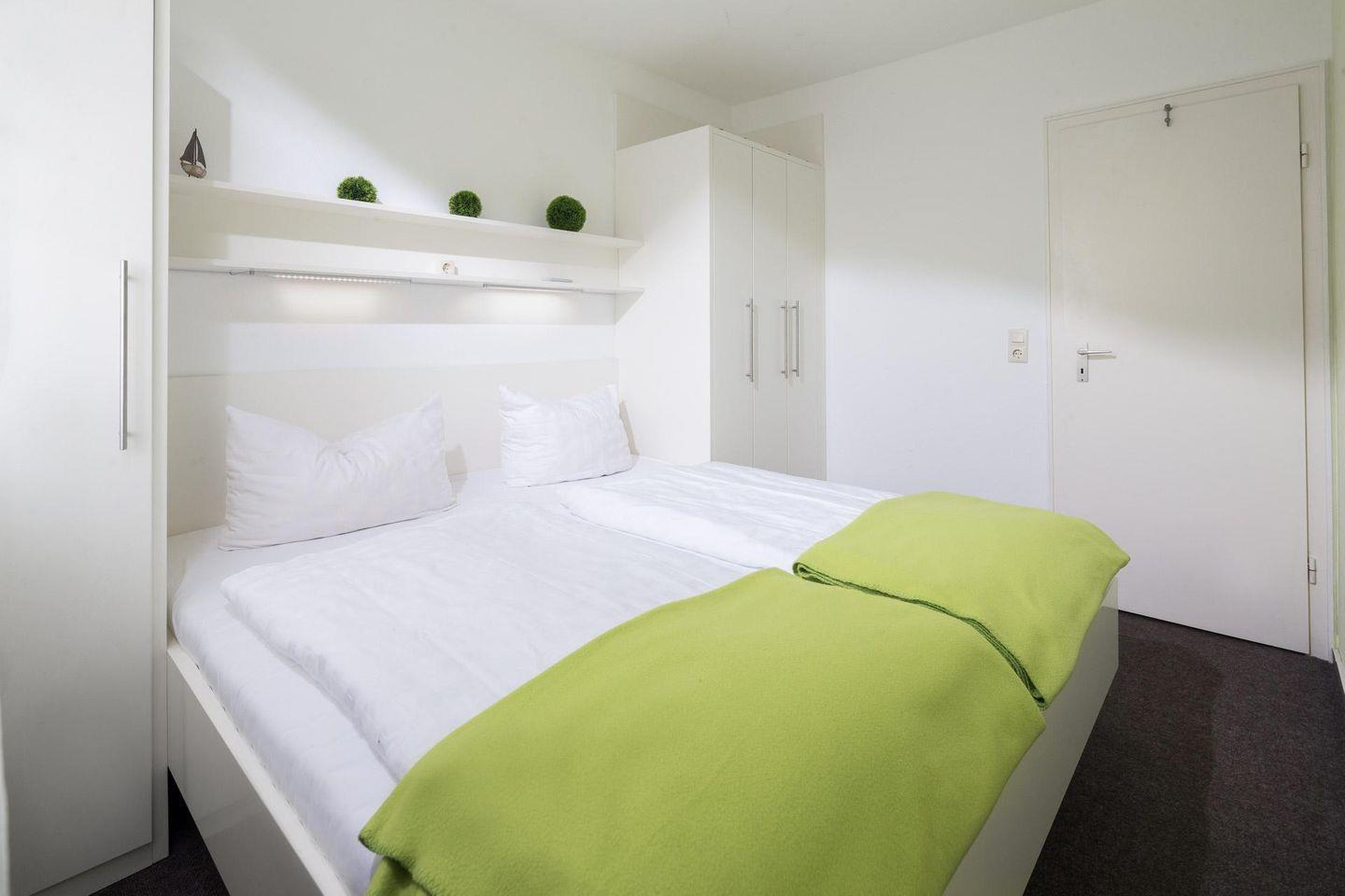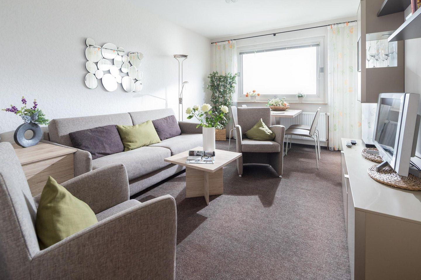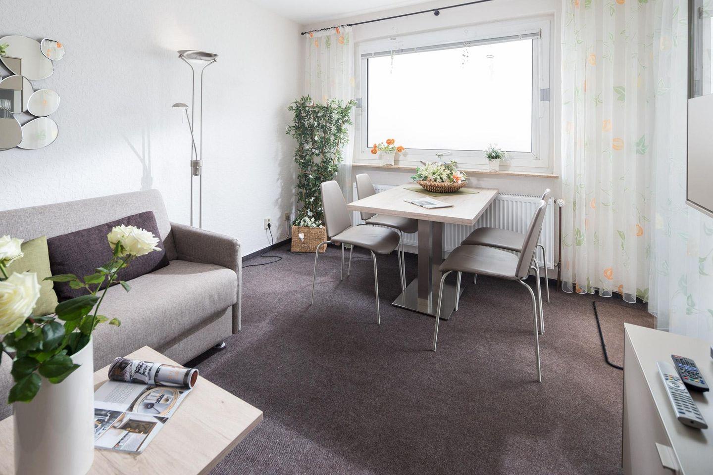 Das Schlafzimmer ist mit einem Doppelbett ausgestattet und im Wohnzimmer steht ein Schlafsofa, so dass im Wohnzimmer ebenfalls 2 Personen untergebracht werden können. Die Wohnung verfügt über einen kleinen Balkon (Südseite). Ein Highlight des Hauses "Iderhoff" ist der beheizte Swimming-Pool, der den Gästen zur Verfügung steht. Es wird jedoch darauf hingewiesen, dass die Nutzung des Schwimmbades den bekannten Hygienevorschriften unterliegt, und es können kurzfristige Änderungen auftreten. Eine Waschmaschine und ein Wäschetrockner stehen den Gästen im Haus zur gemeinschaftlichen Nutzung gegen Münzeinwurf zur Verfügung. Die Wohnung hat kein WLAN. Fahrräder können im Hof abgestellt werden. Haustiere sind hier nicht erlaubt.
