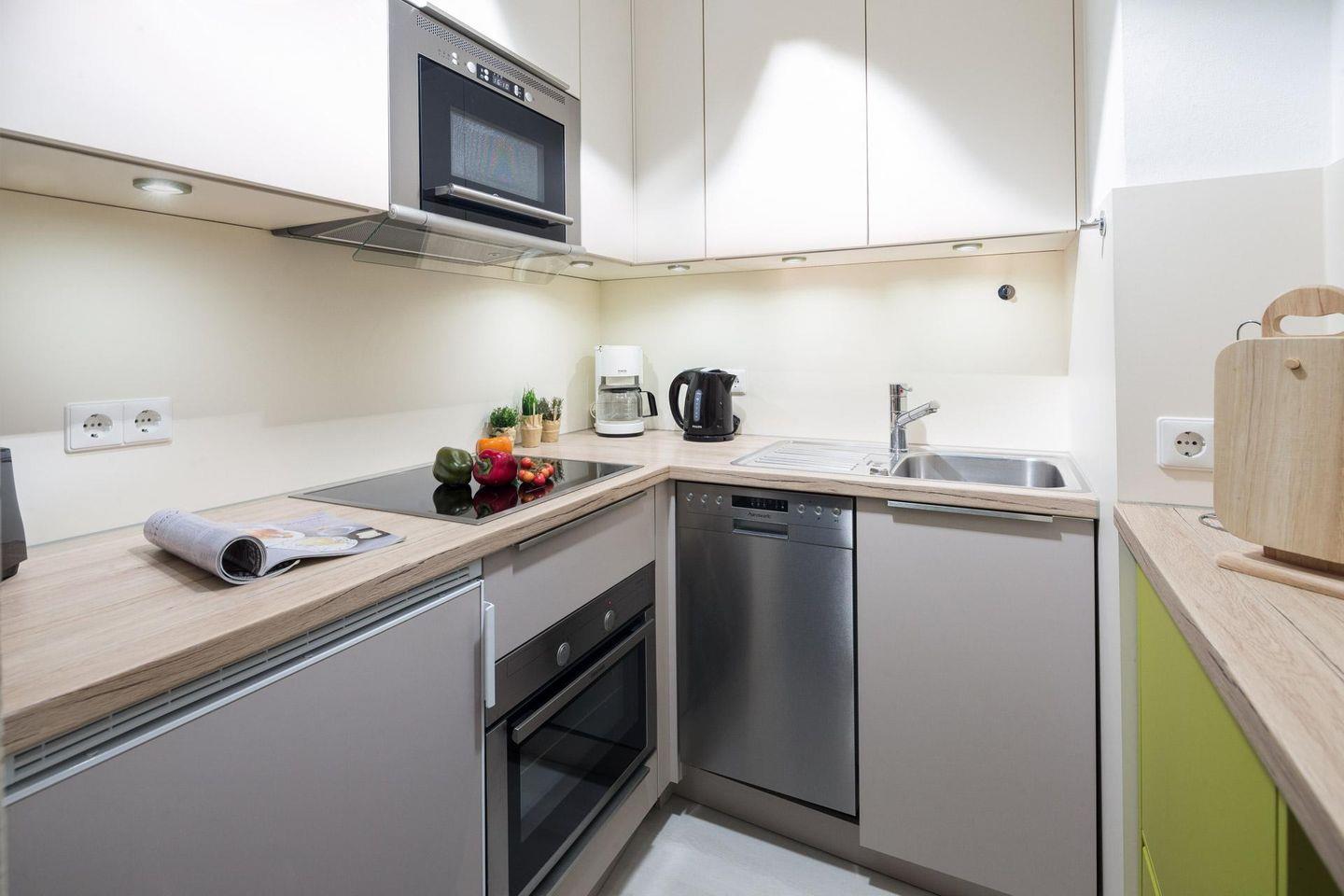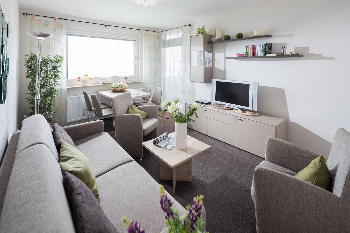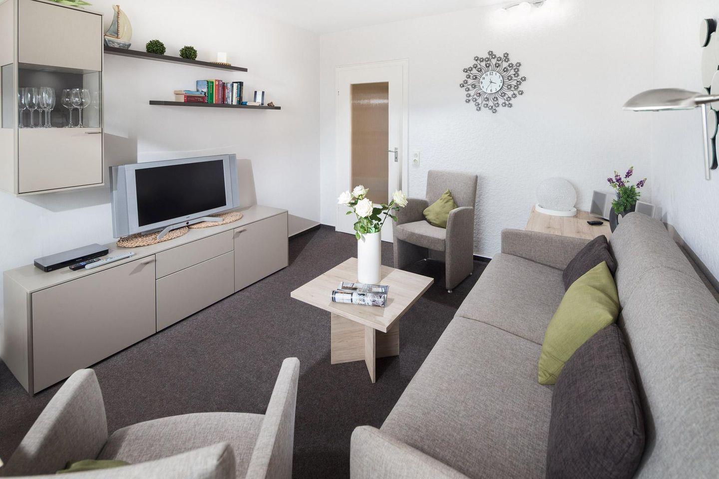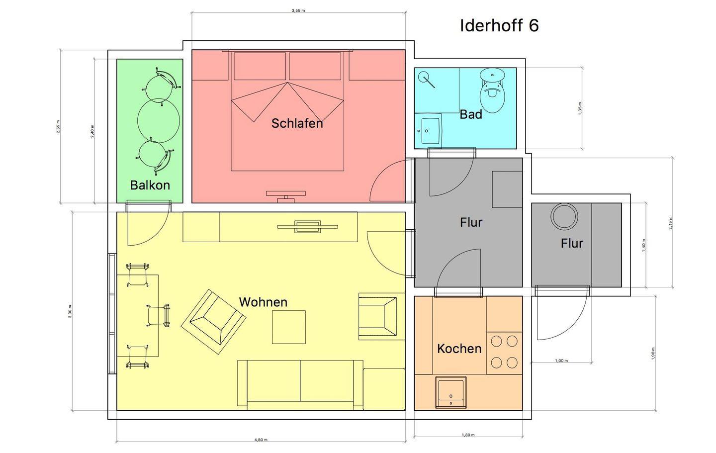Das Schlafzimmer ist mit einem Doppelbett ausgestattet und im Wohnzimmer steht ein Schlafsofa, so dass im Wohnzimmer ebenfalls 2 Personen untergebracht werden können. Die Wohnung verfügt über einen kleinen Balkon (Südseite). Ein Highlight des Hauses "Iderhoff" ist der beheizte Swimming-Pool, der den Gästen zur Verfügung steht. Es wird jedoch darauf hingewiesen, dass die Nutzung des Schwimmbades den bekannten Hygienevorschriften unterliegt, und es können kurzfristige Änderungen auftreten. Eine Waschmaschine und ein Wäschetrockner stehen den Gästen im Haus zur gemeinschaftlichen Nutzung gegen Münzeinwurf zur Verfügung. Die Wohnung hat kein WLAN. Fahrräder können im Hof abgestellt werden. Haustiere sind hier nicht erlaubt.