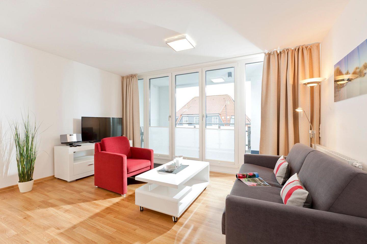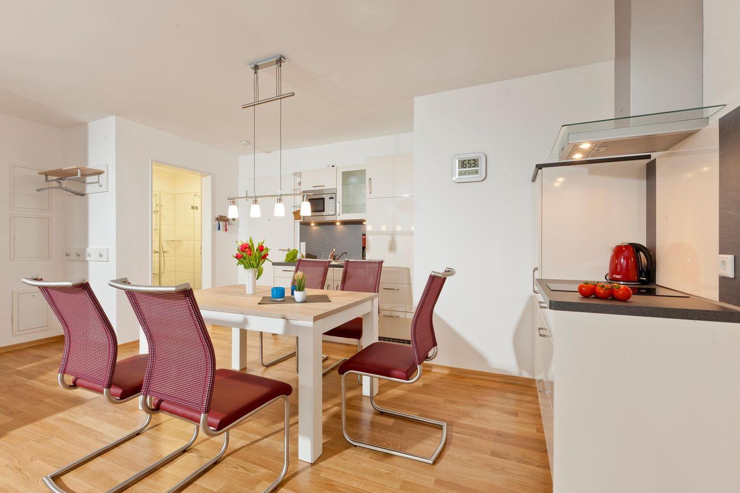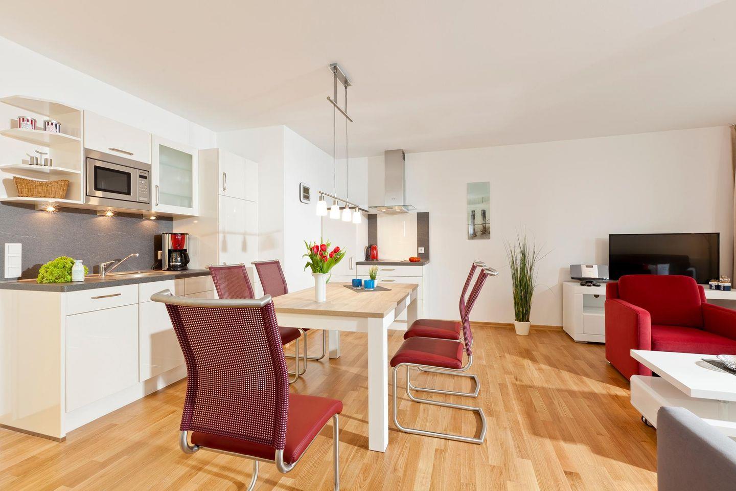 Auf einer Wohnfläche von 50 qm bietet die Wohnung ein Schlafzimmer mit einem Doppelbett und ein Wohnzimmer mit einer Ausziehcouch, die als Schlafmöglichkeit für ein Kind dient. Das Badezimmer ist mit einer Dusche und einem WC ausgestattet. Zudem verfügt die Wohnung über eine kleine, wind- und wettergeschützte Loggia mit südlicher Ausrichtung. Für Fahrräder stehen überdachte Abstellmöglichkeiten am Haus zur Verfügung. Waschmaschine und Wäschetrockner befinden sich im Haus und stehen (für die gemeinschaftliche Nutzung gegen Gebühr) zur Verfügung, was besonders für längere Aufenthalte von Vorteil ist. Hunde sind in dieser Ferienwohnung nicht erlaubt.