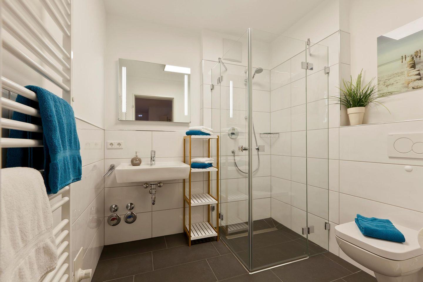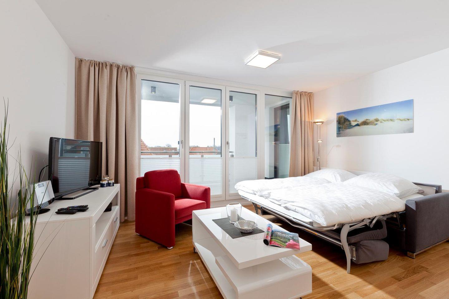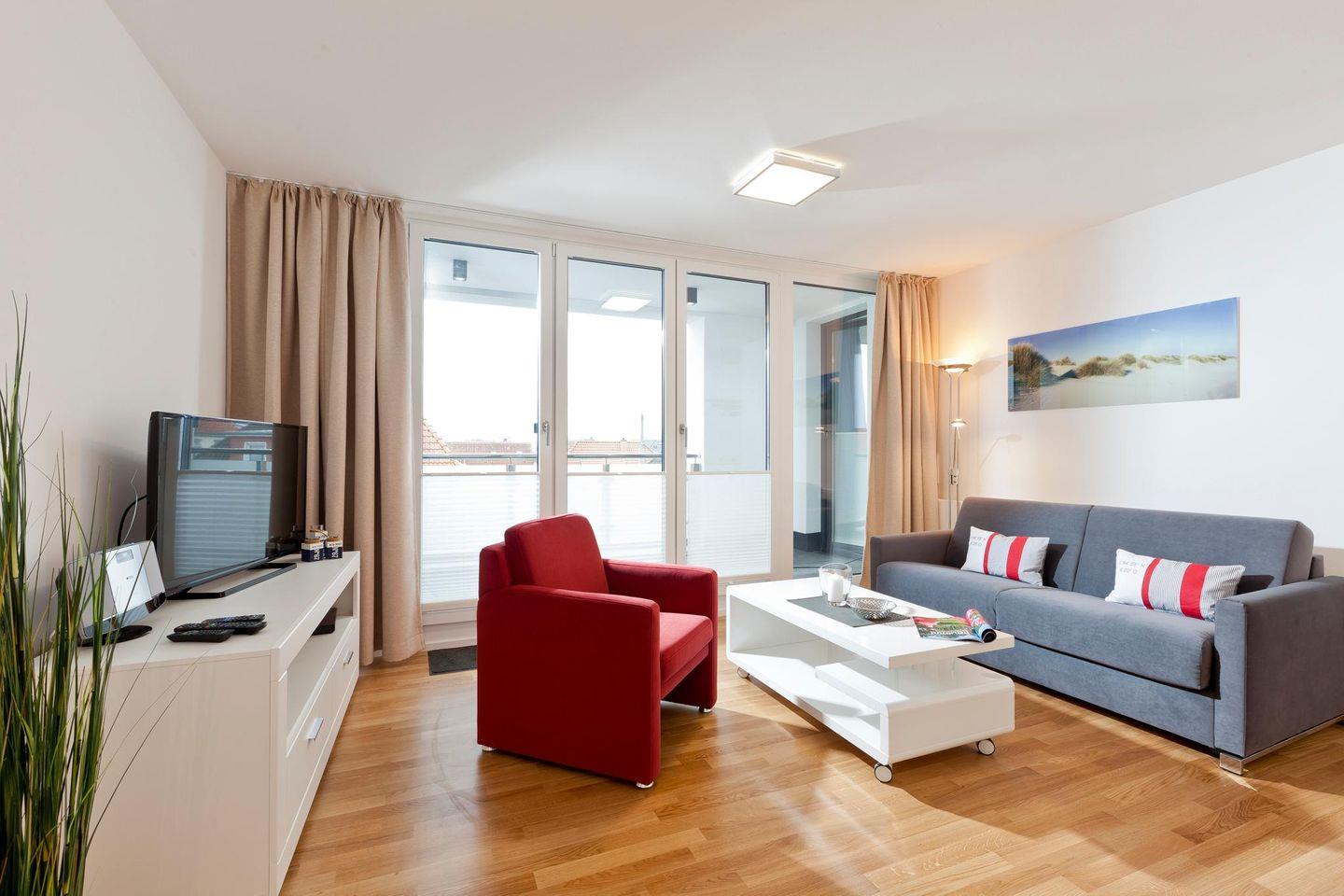 Auf einer Wohnfläche von 50 qm bietet die Wohnung ein Schlafzimmer mit einem Doppelbett und ein Wohnzimmer mit einer Ausziehcouch, die als Schlafmöglichkeit für ein Kind dient. Das Badezimmer ist mit einer Dusche und einem WC ausgestattet. Zudem verfügt die Wohnung über eine kleine, wind- und wettergeschützte Loggia mit südlicher Ausrichtung. Für Fahrräder stehen überdachte Abstellmöglichkeiten am Haus zur Verfügung. Waschmaschine und Wäschetrockner befinden sich im Haus und stehen (für die gemeinschaftliche Nutzung gegen Gebühr) zur Verfügung, was besonders für längere Aufenthalte von Vorteil ist. Hunde sind in dieser Ferienwohnung nicht erlaubt.