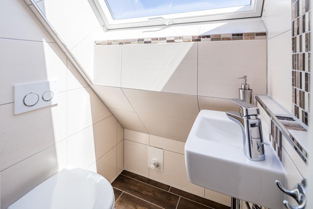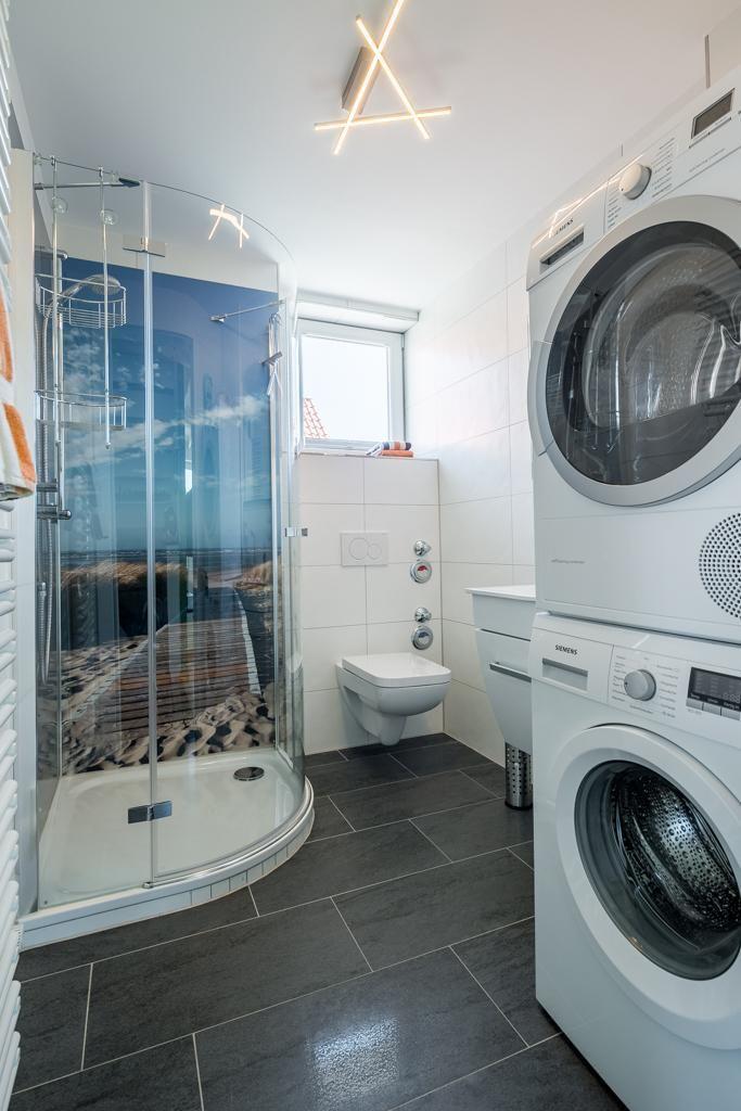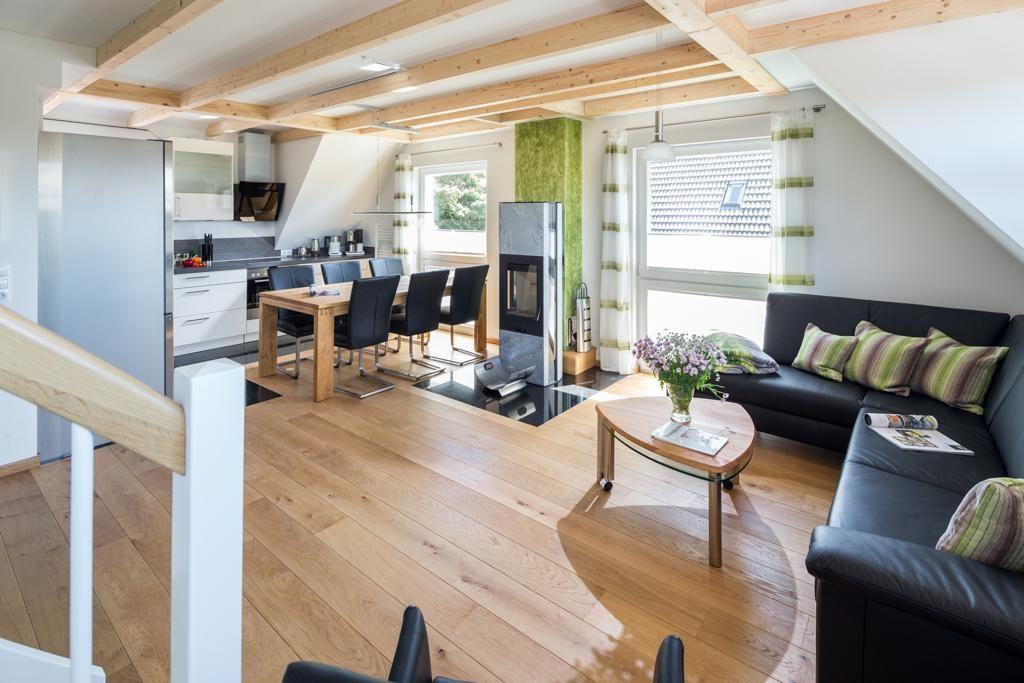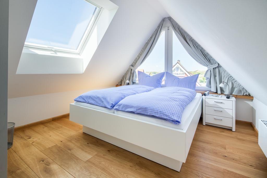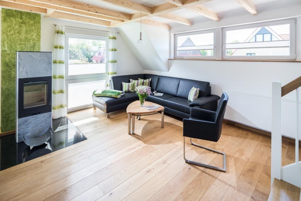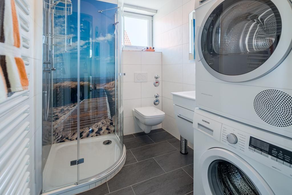 In der Wohnung befindet sich ein geräumiger und heller Wohn-/Ess- und Küchenbereich. Insgesamt gibt es drei Schlafzimmer. Im ersten Obergeschoss gibt es ein Schlafzimmer mit einem Doppelbett. Im Dachgeschoss befinden sich zwei weitere Schlafräume: eines mit einem Doppelbett und ein weiteres mit zwei Einzelbetten, die bei Bedarf zu einem Doppelbett umgewandelt werden können. Ein Schlafzimmer im Dachgeschoss bietet sogar einen Panoramablick auf die nahegelegene Dünenlandschaft. Die Wohnung verfügt über insgesamt zwei Badezimmer. Ein Badezimmer ist mit einer Badewanne, einer Dusche und einem WC ausgestattet, während das andere Badezimmer über eine Dusche und ein WC verfügt. Zusätzlich gibt es ein separates WC. An kalten Tagen sorgt ein Kaminofen für Wärme (wenn gewünscht).