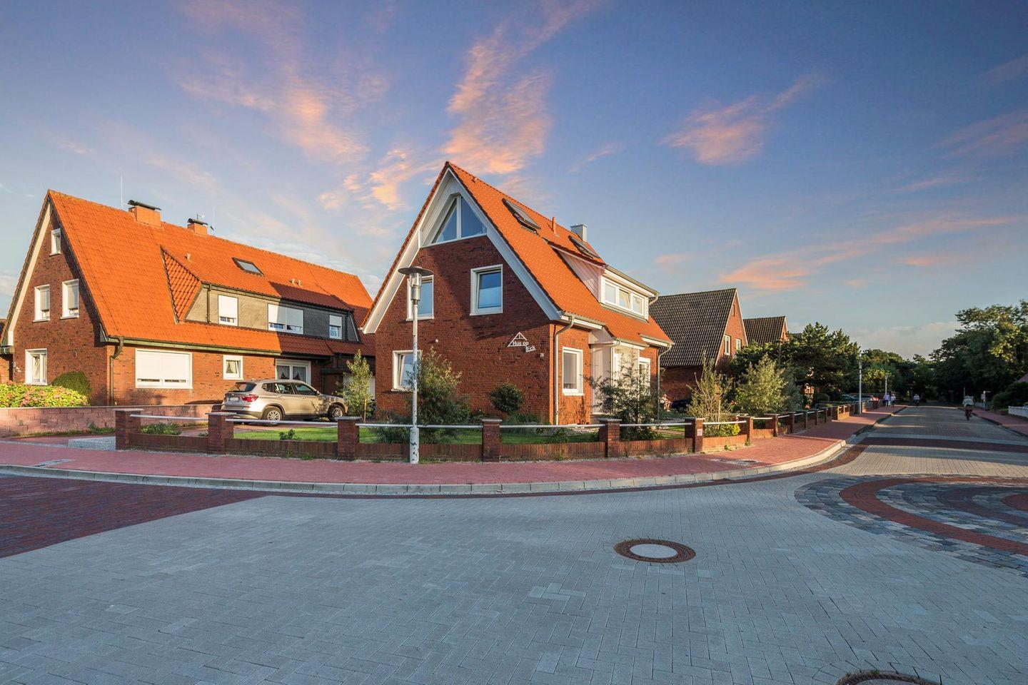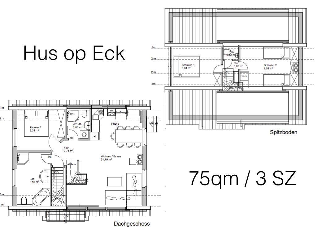 Die Ferienwohnung "Hus op Eck" befindet sich in der ruhigeren Wohngegend entlang der Nordhelmstraße, die in unmittelbarer Nähe zum Nordstrand verläuft. Die Wohnung erstreckt sich über das erste Obergeschoss und das Dachgeschoss des Gebäudes. Die 75 Quadratmeter große Wohnung bietet Platz für bis zu 6 Personen.