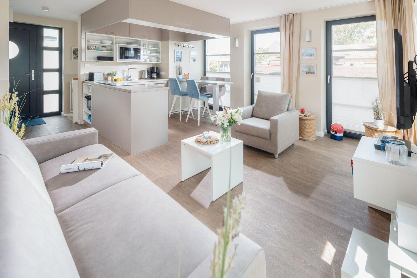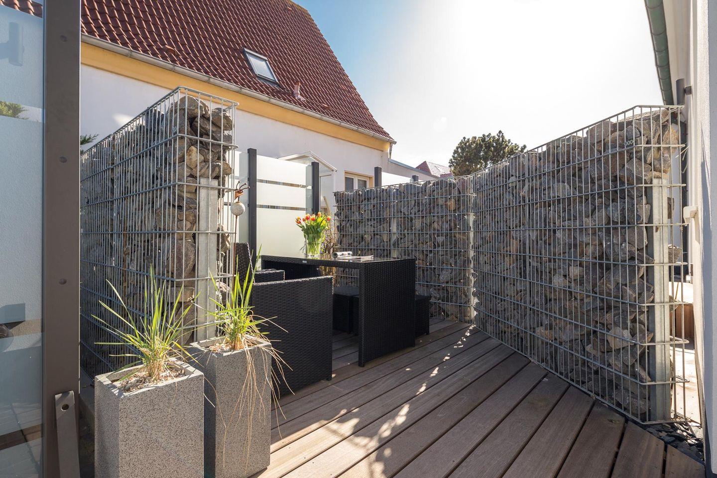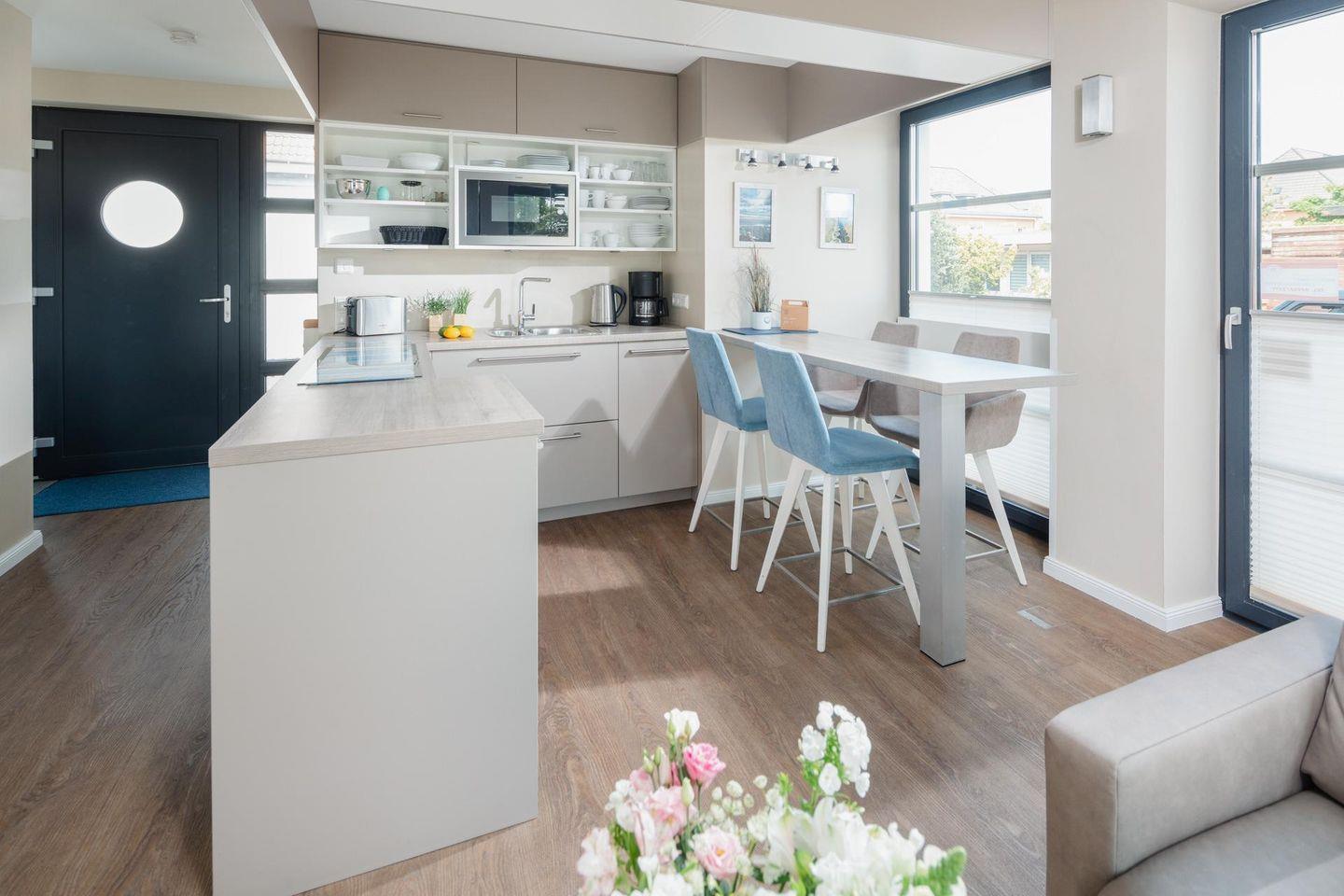 Ein Highlight der Ferienwohnung ist die knapp 20 Quadratmeter große Südterrasse. Die Wohnung wird seit August 2018 ohne Parkplatz angeboten. Hunde sind in dieser Wohnung erlaubt. Erlaubt ist maximal 1 Hund (Höhe maximal kniehoch). Die Hundewiese befindet sich in der Nähe des Fährhafens (kein Leinenzwang).