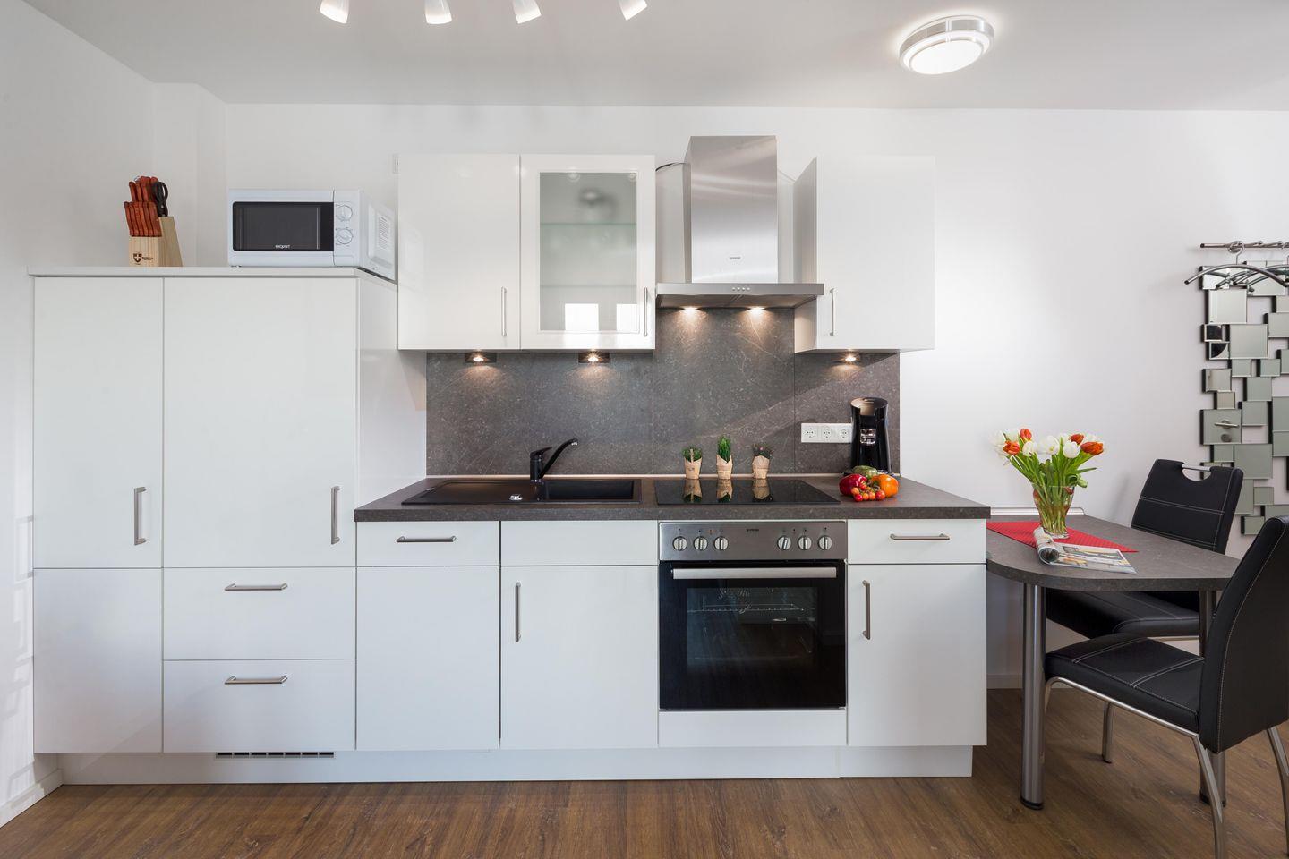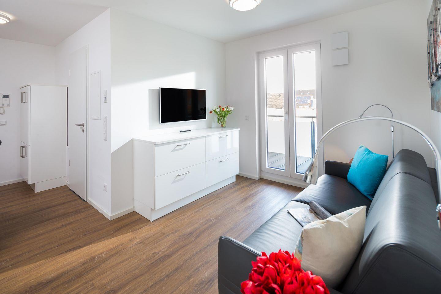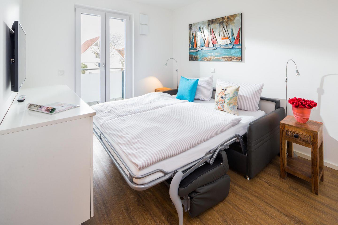 Die Wohnung ist mit einem Schlafsofa (1,60m x 1,90m/ Matratze) ausgestattet und steht einem "normalen" Bett in puncto Schlafkomfort in nichts nach. Im Wohnbereich ist eine voll eingerichtete Küchenzeile, inklusive Kaffeemaschine und einem Geschirrspüler, vorhanden. Das Badezimmer ist mit einer Dusche ausgestattet. Die Wohnung ist weiter mit einer Fußbodenheizung ausgestattet. Das Highlight des Apartments ist der 7,5 qm große Balkon in Ostausrichtung. Hier darf auch der vierbeinige Freund mitkommen, denn die Ferienwohnung heißt auch Hunde herzlich willkommen. Erlaubt ist maximal 1 Hund (Höhe maximal kniehoch). Die Hundewiese befindet sich in der Nähe des Fährhafens (kein Leinenzwang).