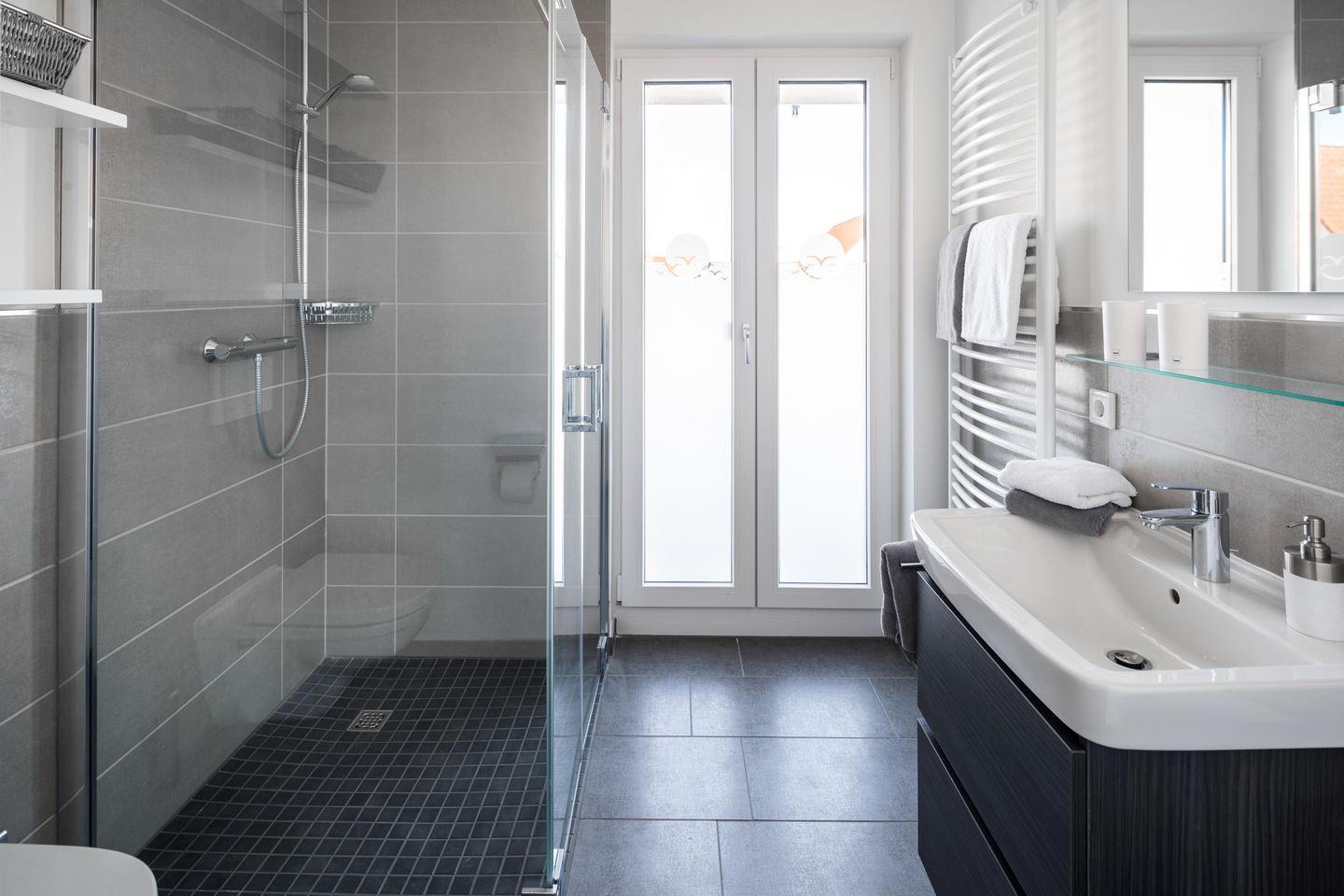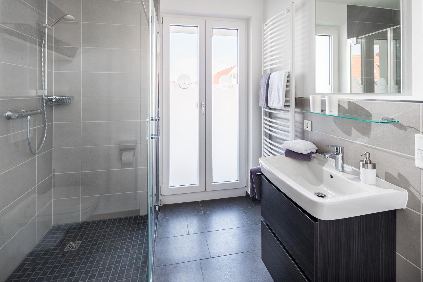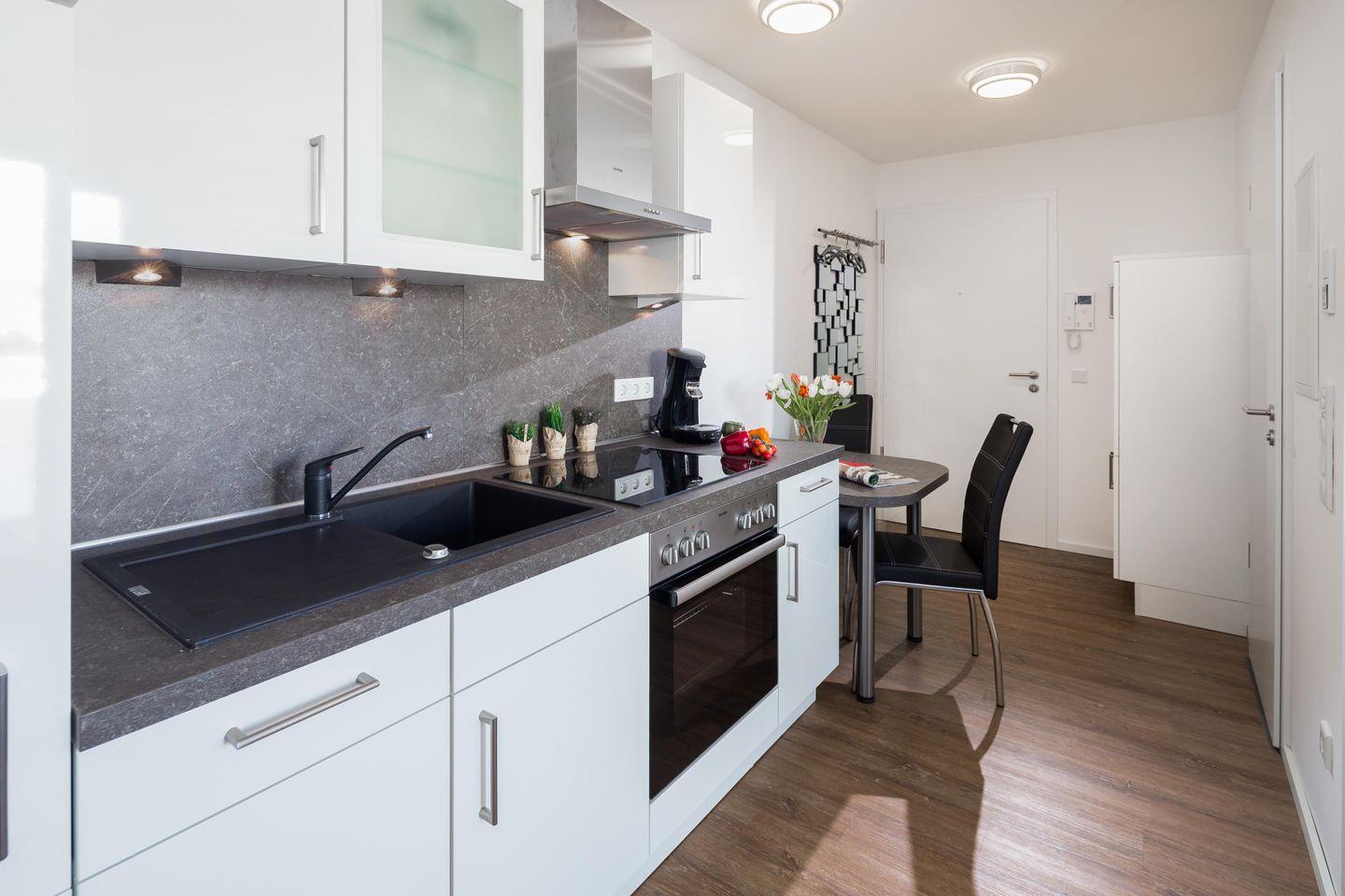 Die Wohnung ist mit einem Schlafsofa (1,60m x 1,90m/ Matratze) ausgestattet und steht einem "normalen" Bett in puncto Schlafkomfort in nichts nach. Im Wohnbereich ist eine voll eingerichtete Küchenzeile, inklusive Kaffeemaschine und einem Geschirrspüler, vorhanden. Das Badezimmer ist mit einer Dusche ausgestattet. Die Wohnung ist weiter mit einer Fußbodenheizung ausgestattet. Das Highlight des Apartments ist der 7,5 qm große Balkon in Ostausrichtung. Hier darf auch der vierbeinige Freund mitkommen, denn die Ferienwohnung heißt auch Hunde herzlich willkommen. Erlaubt ist maximal 1 Hund (Höhe maximal kniehoch). Die Hundewiese befindet sich in der Nähe des Fährhafens (kein Leinenzwang).