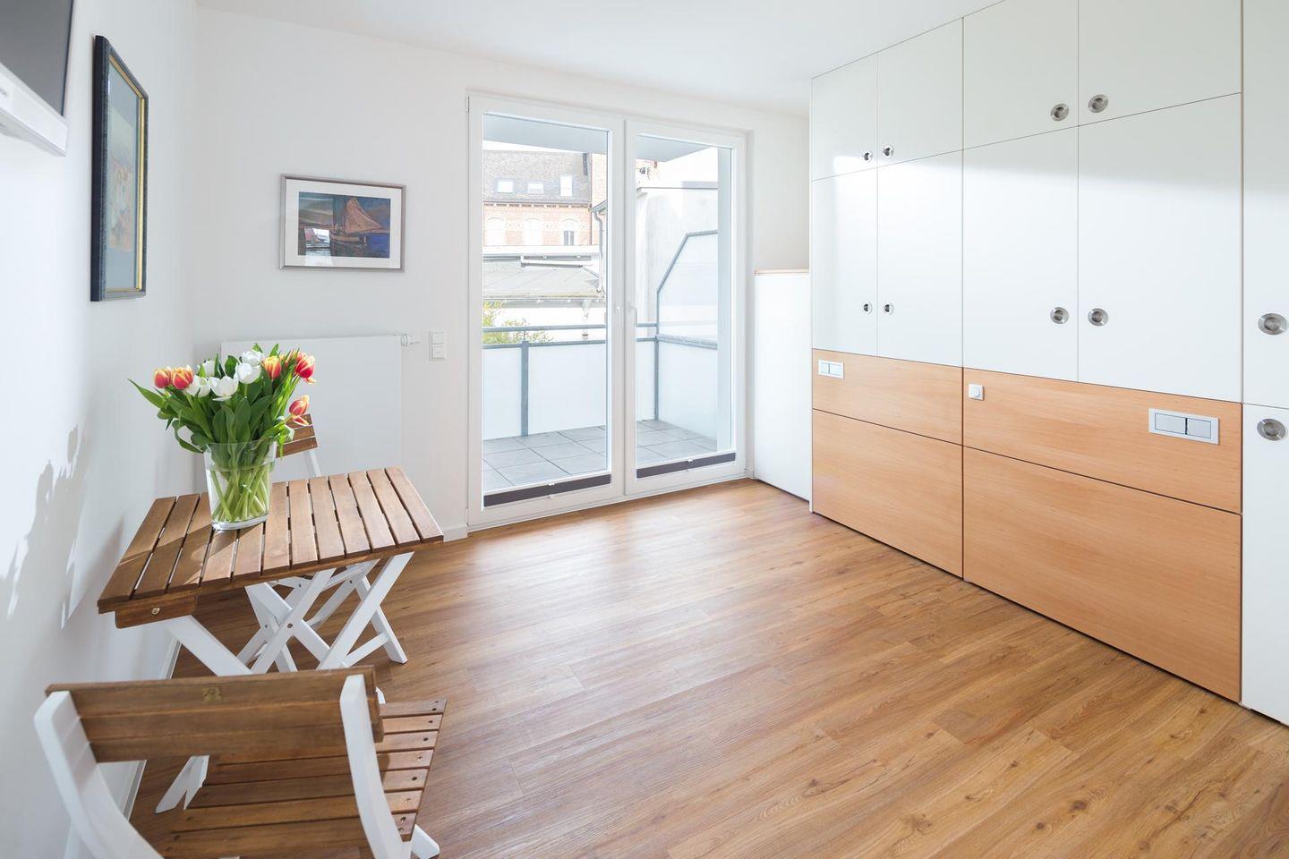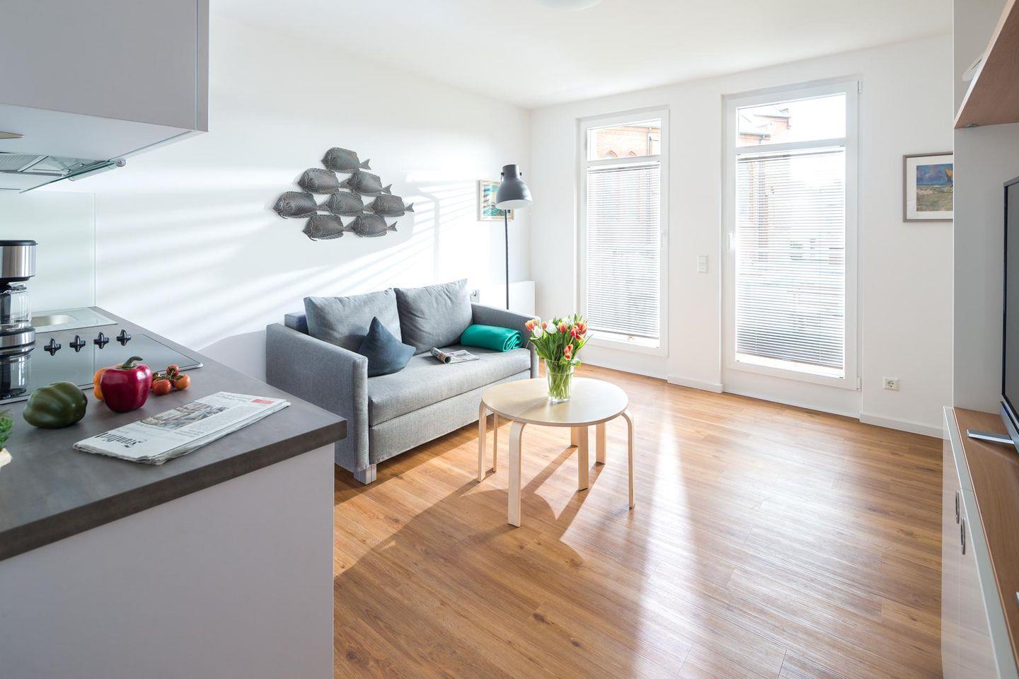 Bei der Inneneinrichtung der Wohnung wurde Wert auf helle und natürliche Farben gelegt. Zwei elektrisch ausfahrbare Schrankbetten bieten den gleichen Schlafkomfort wie herkömmliche Betten und lassen sich tagsüber platzsparend verstauen. Für eine dritte Person bietet das ausziehbare Sofa im Wohnzimmer eine Schlafmöglichkeit mit einer Liegefläche von 1,30 x 2,13 m. Ein Highlight der Wohnung "John Silver" sind die beiden Balkone. Es gibt einen Süd-West-Balkon und einen Nord-Ost-Balkon (mit Blick auf den Kirchhof). Hunde sind in dieser Unterkunft nicht erlaubt.