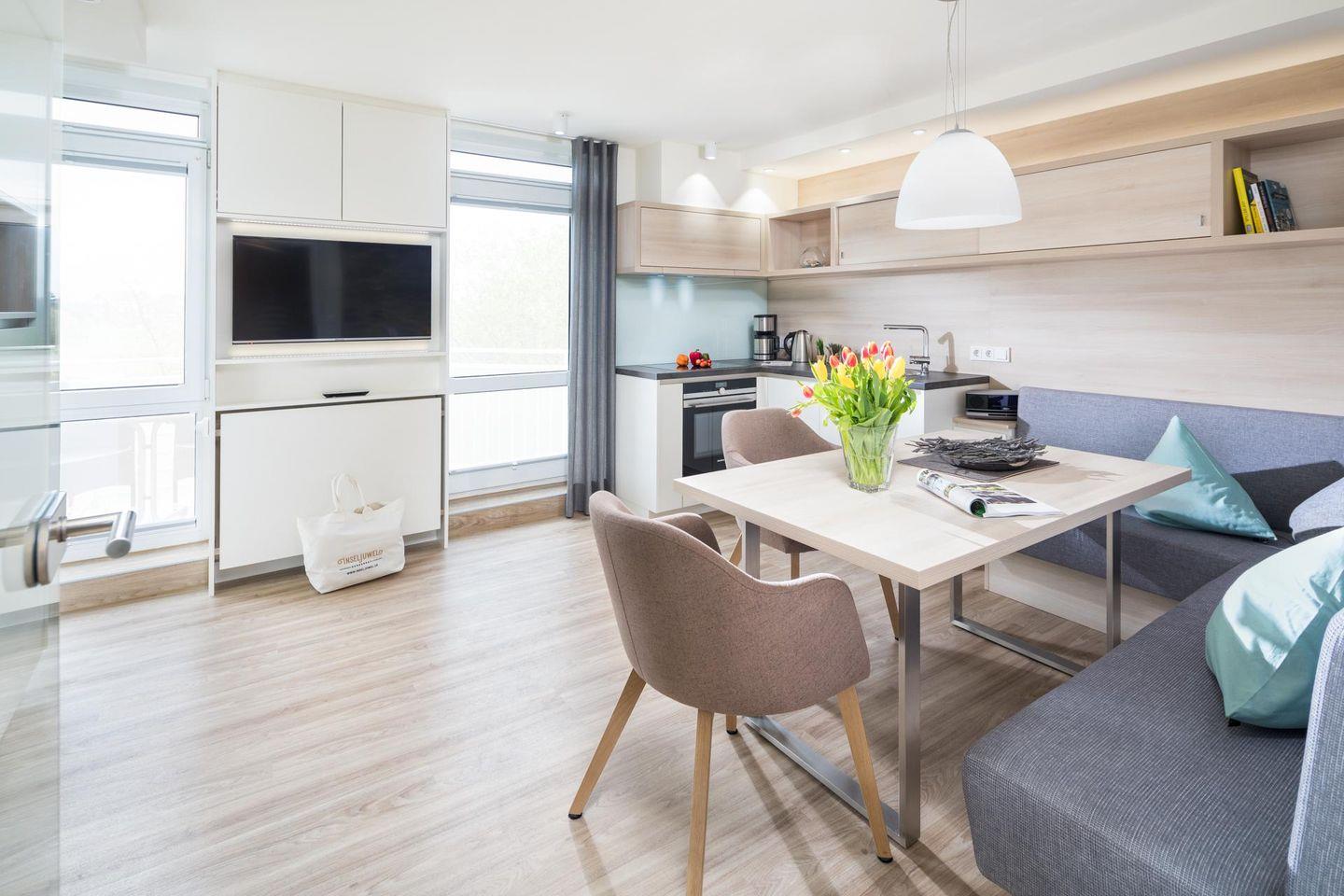 Die Ferienwohnung "Inseljuwel Jade" liegt im Südwesthörn. Somit liegt diese Wohnung in unmittelbarer Nähe zum Weststrand und nur wenige Schritte vom Kurplatz entfernt. Die Ferienwohnung "Jade" wurde im Winter 2017 vollständig renoviert. Die Wohnung bietet auf ca. 48 Quadratmetern Platz für bis zu 4 Personen. Die Wohnung "Jade" kann bei Bedarf auch mit der Wohnung "Onyx" verbunden werden, was sie zur idealen Wahl für gemeinsam reisende Gäste macht.