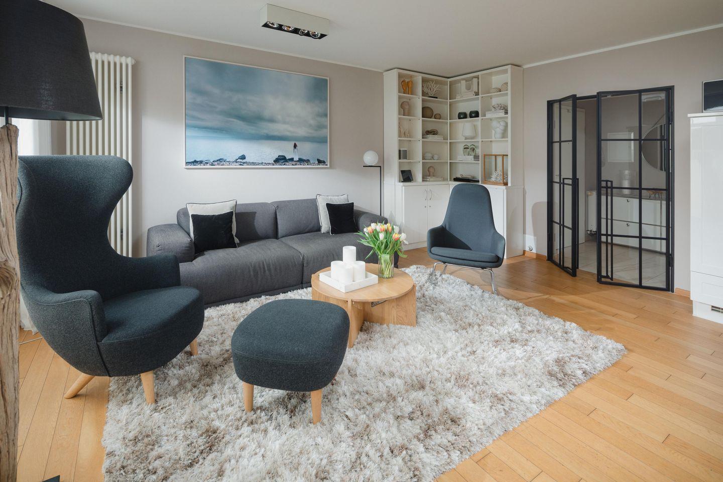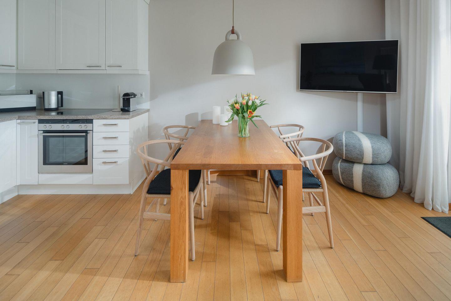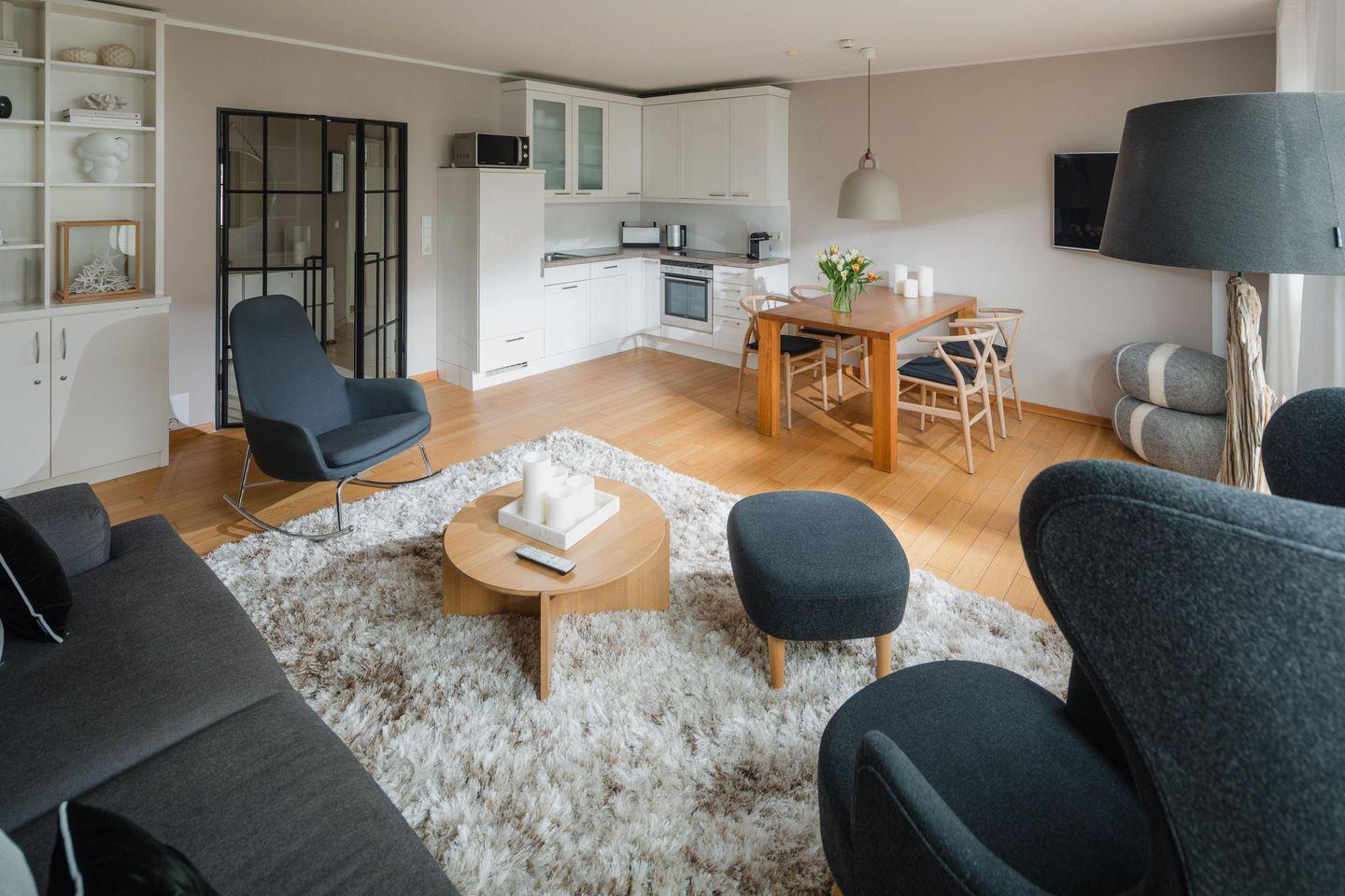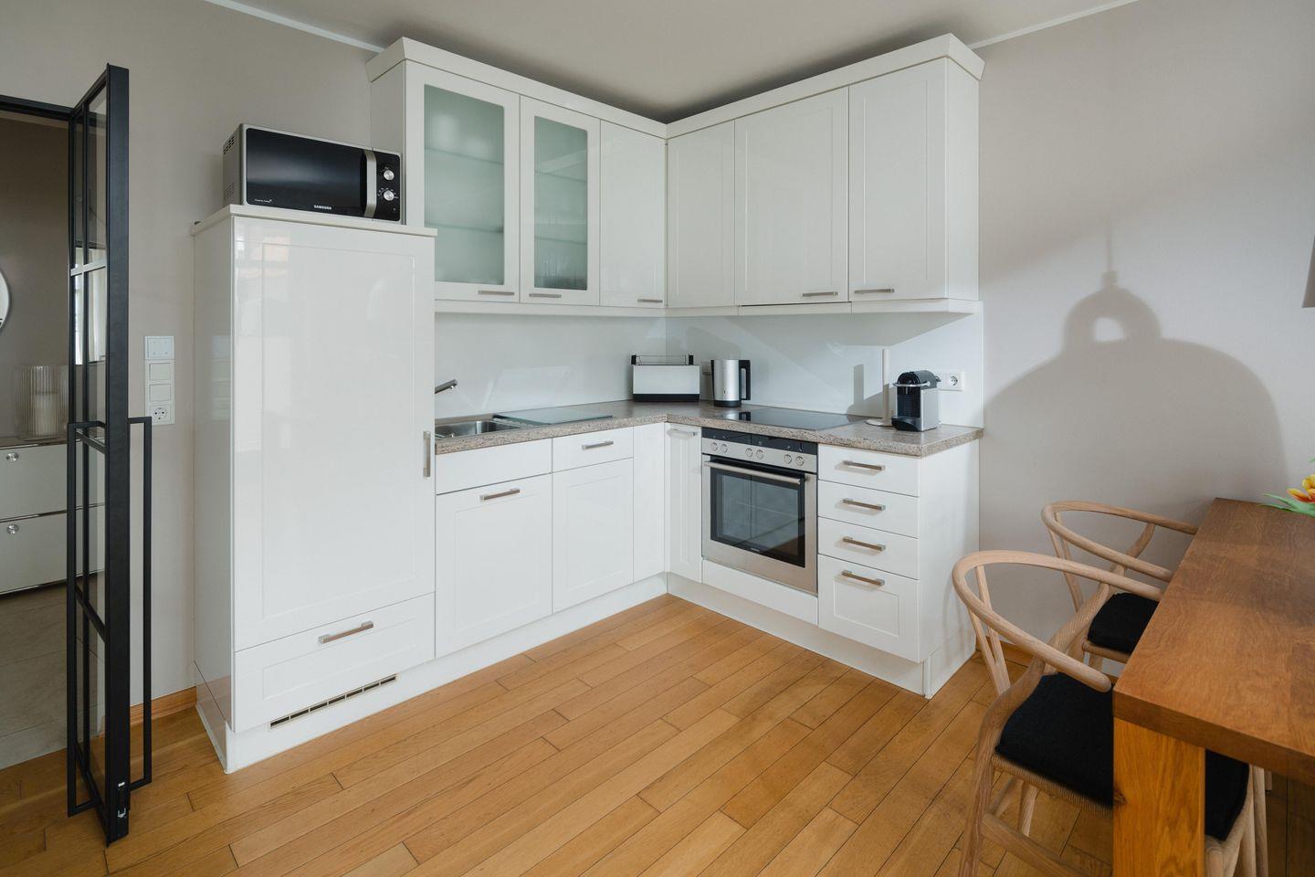 Das Highlight der Wohnung ist das große, helle Wohnzimmer mit Fußbodenheizung und einer offenen, modernen Wohnküche. Vom Wohnbereich aus gelangt man auf die knapp 20 qm große Südterrasse mit Loungemöbeln. Die beiden Schlafzimmer sind zur ruhigeren Nordseite zum Innenhof ausgerichtet und verfügen über Doppelbetten sowie elektrische Außenjalousien. Für Kaffeeliebhaber steht in der Küche eine Nespresso-Kapselmaschine und eine Moccamaster Filter-Kaffeemaschine, sowie eine Tassimo-Kapselmaschine bereit. Das Badezimmer ist mit einer Dusche mit bodengleichem Einstieg und ebenfalls Bodenheizung ausgestattet. Alle Türen haben eine Breite von 100 cm, was für zusätzlichen Komfort sorgt.